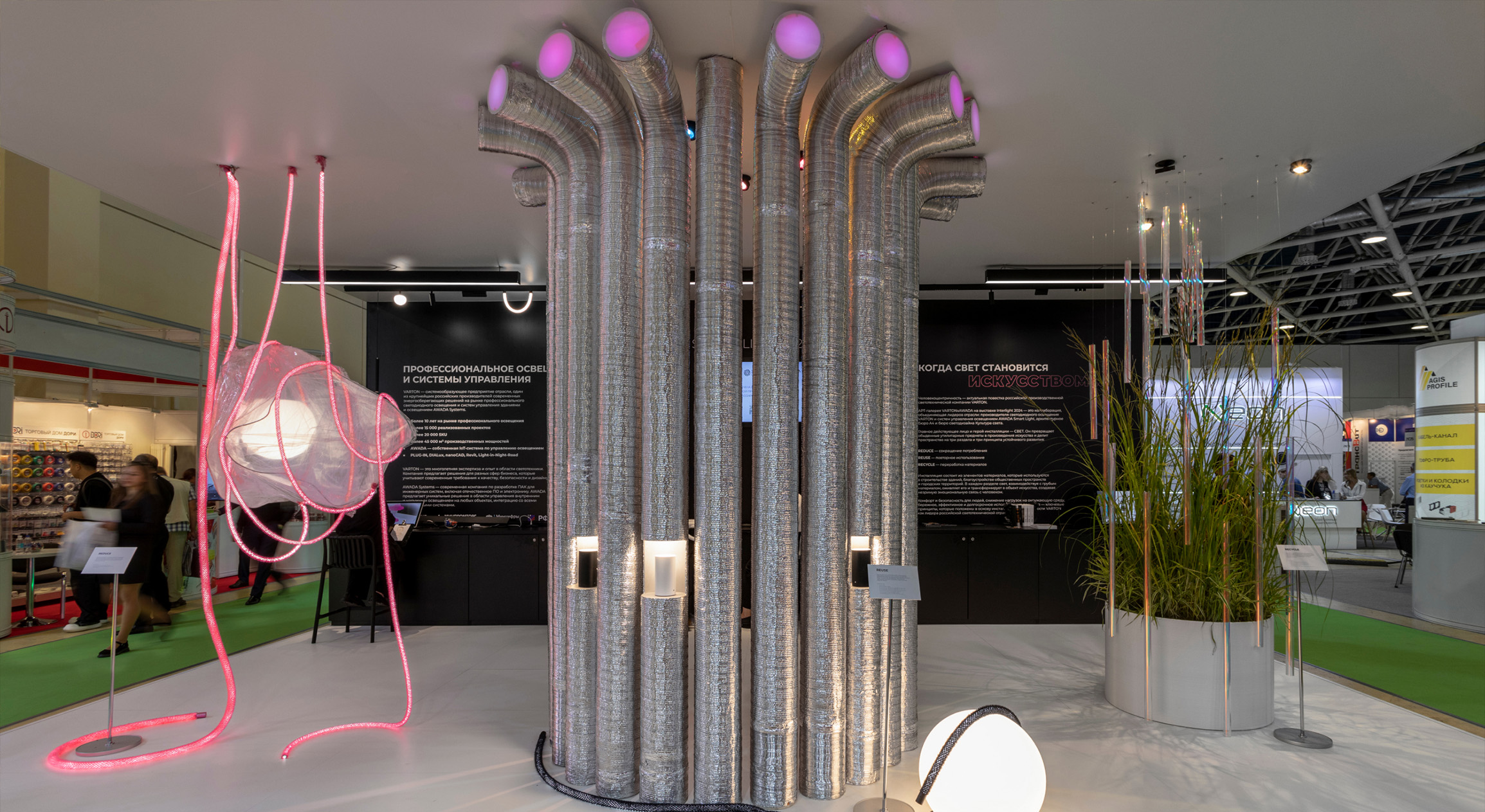 По задумке архитекторов свет делит стенд на зоны, соответствующие трем основным принципам устойчивого развития, важным для современной архитектуры и искусства: Reduce — сокращение потребления, Reuse — повторное использование, Recycle — переработка материалов. В каждом разделе свет взаимодействует с формой и фактурой материала,оживляет его и создает незримую эмоциональную связь с человеком. Над созданием арт-объекта работали специалисты Бюро А4, производители светодиодного освещения VARTON и системы управления освещением AWADA Smart Light, а также бюро светодизайна «Культура света».