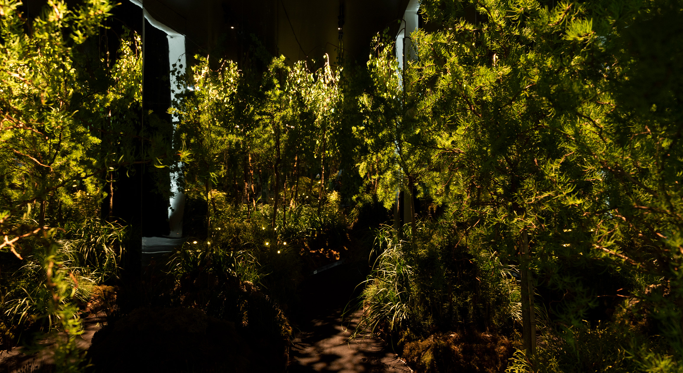 «Человек попадает в неожиданную атмосферу, где его встречает эффект присутствия в настоящем лесу. Запахи, текстуры, влажность и температура, свет и тень — каждая составляющая инсталляции делает свой вклад, провоцируя эмоцию. Свет воспроизводит эффект солнечных лучей, проходящих сквозь крону высоких деревьев в полдень, а зеркальные стены делают пространство бескрайним. Мы также немного поиграли с воображением посетителя, установив во мху мерцающие огоньки», — рассказал Иван Федянин дизайнер освещения, партнер светотехнической компании L1 GROUP.