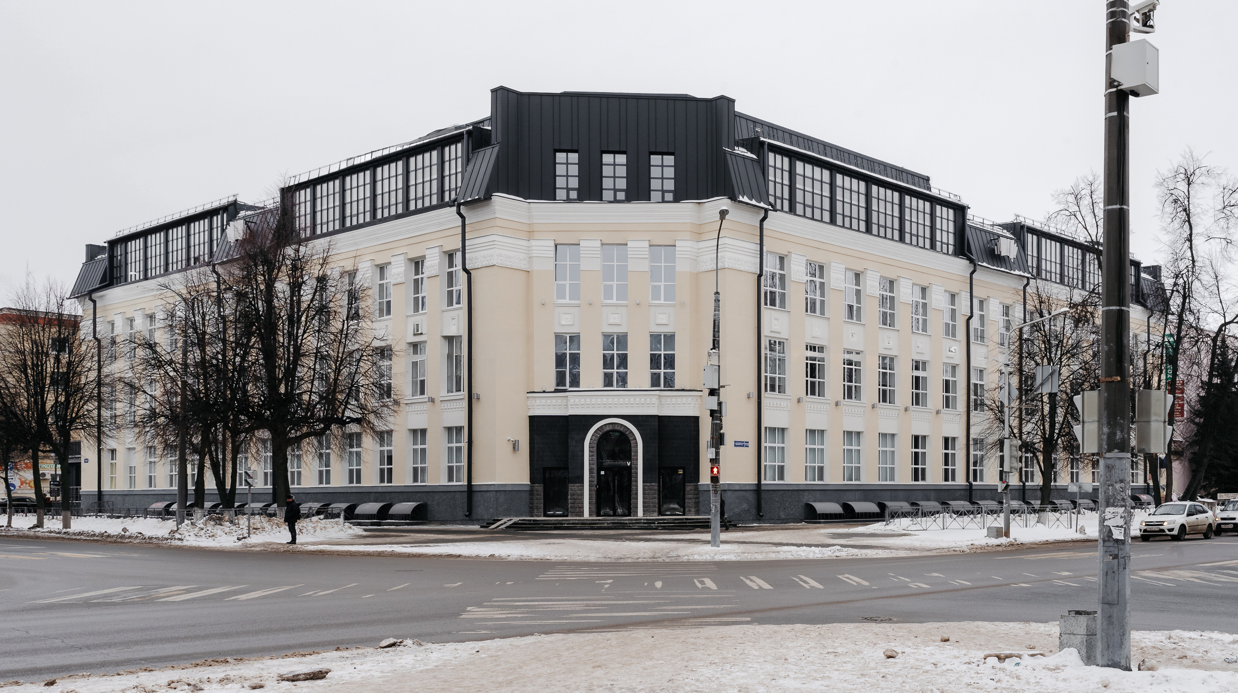 Перед архитекторами стояла сложная задача: сохранить характер Республиканской типографии 1959 года — здания с угловой геометрией и фасадом в стиле советской неоклассики, формирующей узнаваемый облик перекрестка улиц Комсомольской и Кремлевской, — и адаптировать его к современному назначению. Важно было не только подчеркнуть историческую ценность объекта, но и органично связать его с примыкающими постройками — бывшим Домом книги и Домом быта. Также было необходимо расширить площадь мансардного этажа и обеспечить достаточное количество парковочных мест для сотрудников компании. Архитекторы пошли по пути комплексного осмысления территории с последующим отражением ценных элементов ее историко-культурного наследия.