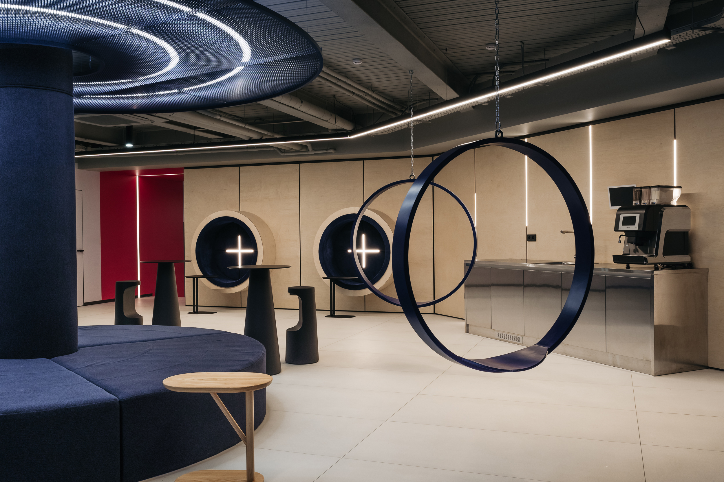Идея многофункциональности и комфорта получила продолжение и в интерьерах. Пространства бывшего ЦУМа полностью переосмыслены и адаптированы под нужды современной IT-компании: здесь расположились кабинеты, опенспейс, спортзал, столовая, лекционные аудитории, а также рекреационные зоны: библиотека, зимний сад и лаундж. Цветовая палитра выстроена на основе фирменного стиля TravelLine с преобладанием синего, голубого, розового и малинового цветов. В то же время архитекторы стремились сохранить связь с прошлым здания, поэтому в интерьере активно используется лакированная фанера с текстурой лиственницы, а встроенные книжные полки отсылают к образу советской библиотеки, но уже в современном, функциональном исполнении.