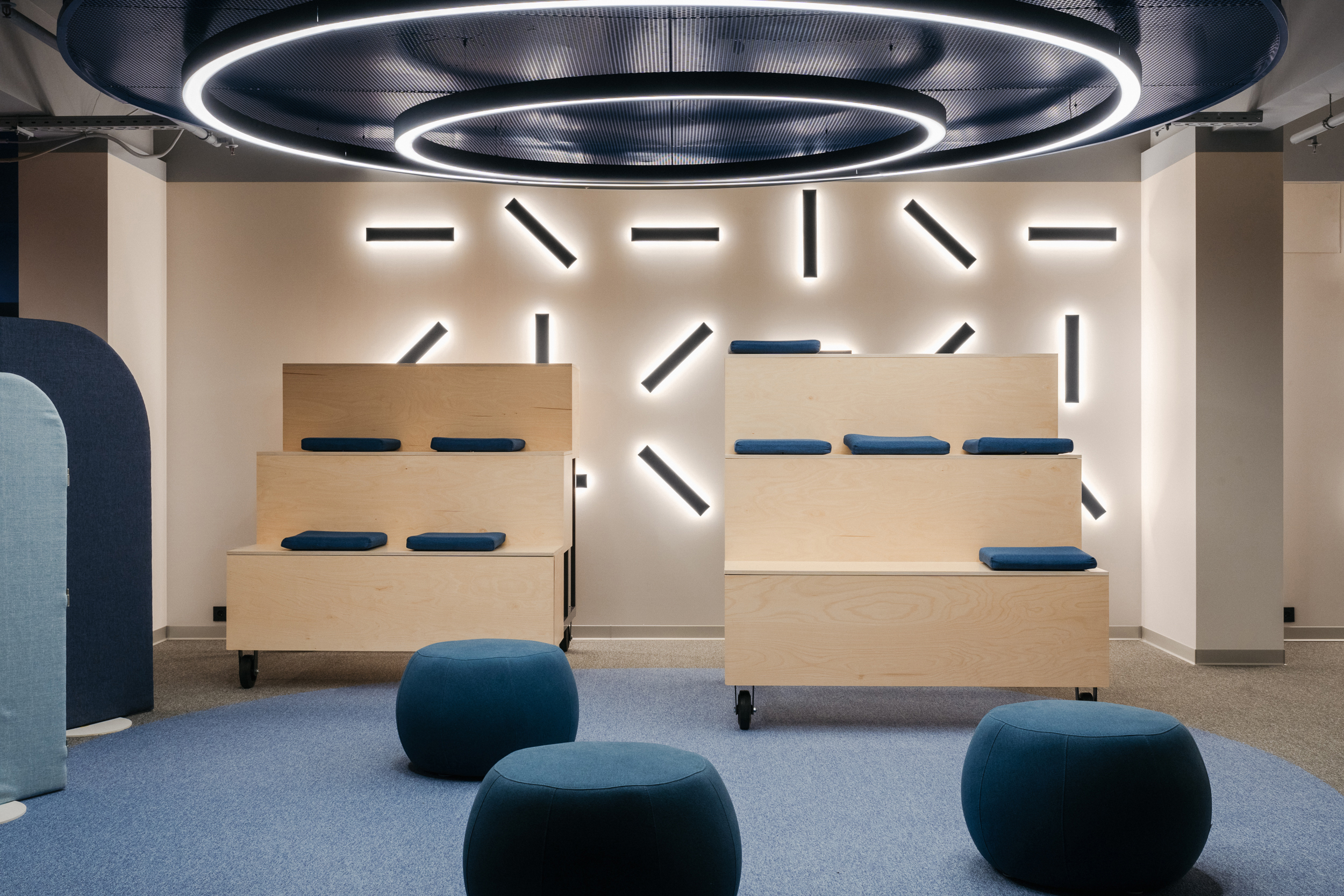 Внутренний двор комплекса был зонирован с учетом различных сценариев использования — от повседневной работы на свежем воздухе до проведения мероприятий. Здесь появились амфитеатр, сцена и экран для трансляций. Архитектурные и инженерные элементы оформлены в фирменном синем цвете компании-заказчика для создания визуальных акцентов и усиления идентичности пространства. На территории также предусмотрены удобные парковочные зоны для сотрудников и гостей.