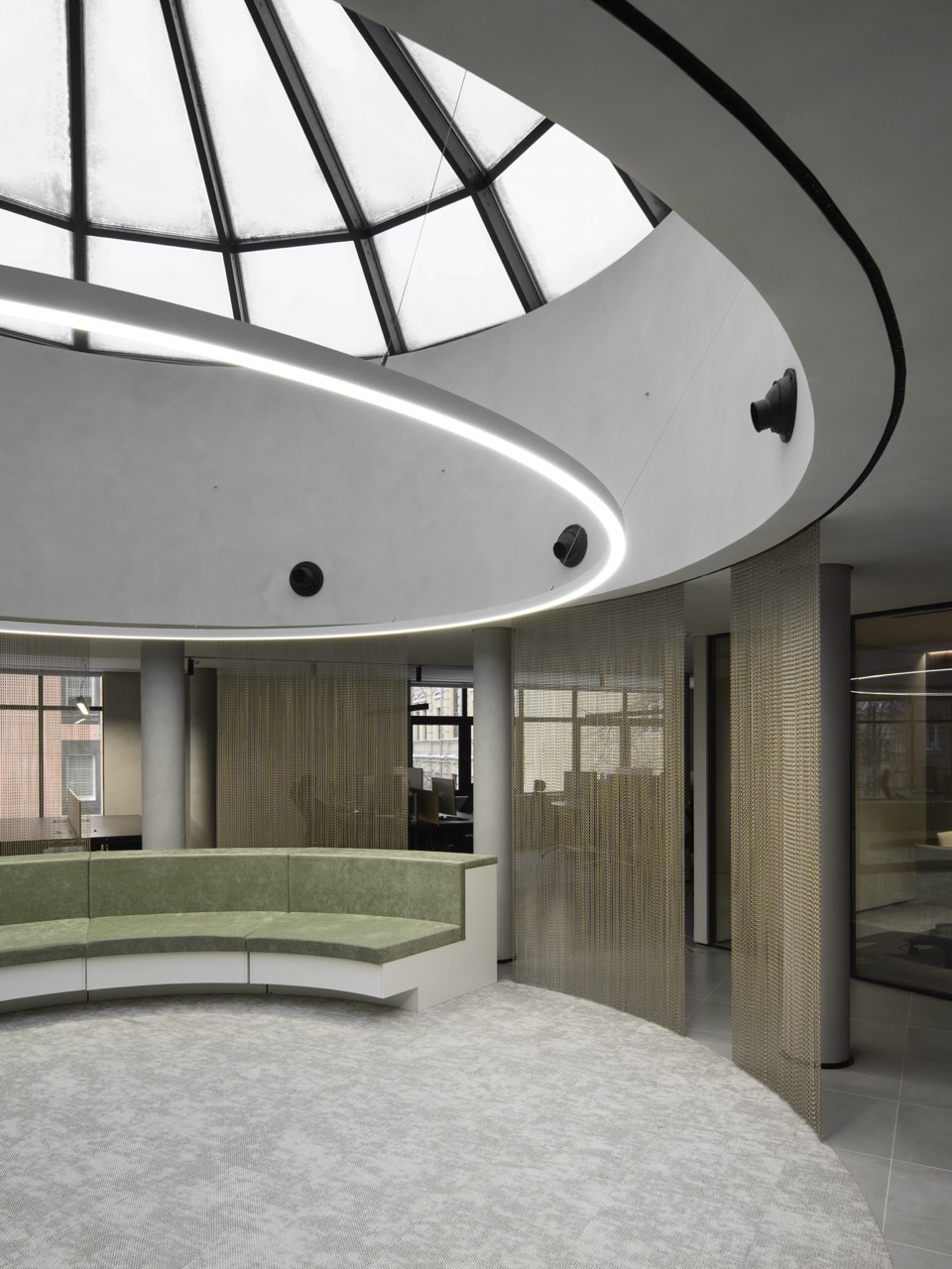 Главная рекреационная зона расположена под стеклянным куполом. Пространство решено как многофункциональное: полукруг диванов и масштабный медиаэкран подходят как для отдыха, так и для рабочих собраний. От опенспейса зона отделена металлическими цепями, визуально работающими как легкие шторы.