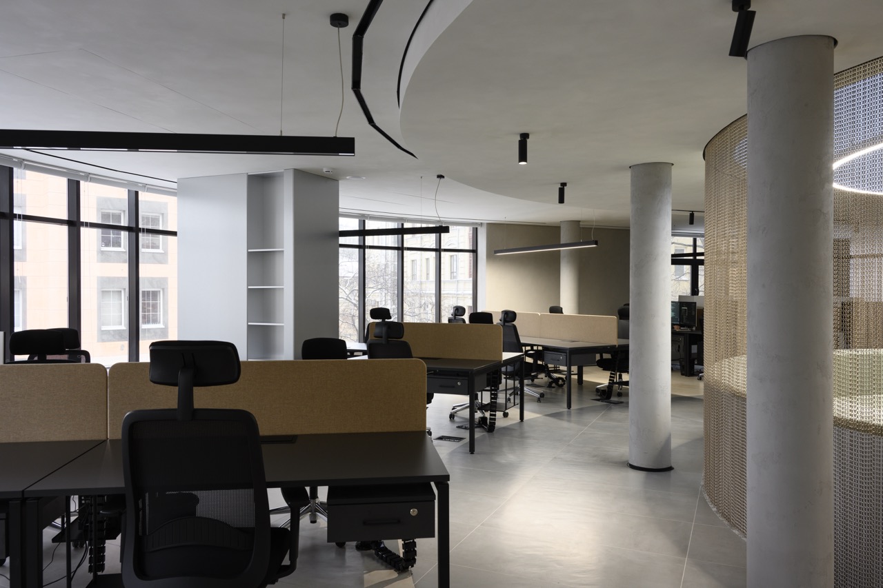 Здание имеет вытянутую форму с нестандартной геометрией. Планировка офиса выстроена по круговому принципу с минимальным количеством коридоров. Ключевые рабочие и рекреационные пространства расположены в центральной части, что обеспечивает быстрый и удобный доступ ко всем зонам.