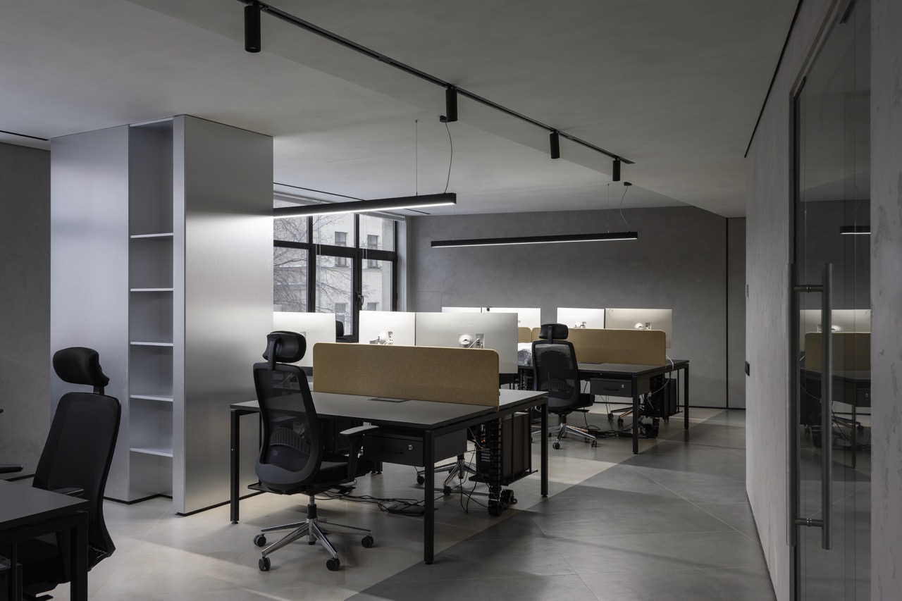 Архитекторы выделили два технических ядра, собрав в них сервисные помещения. Это позволило вынести рабочие места к фасадам с естественным освещением, а центральные зоны отделить от опенспейсов стеклянными перегородками для проникновения света вглубь пространства.