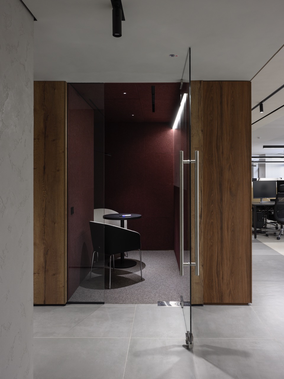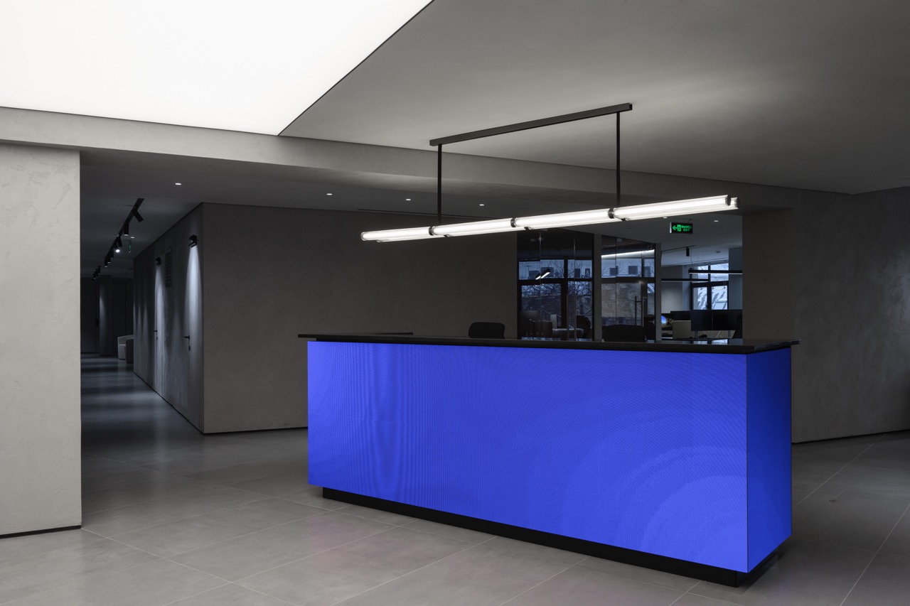 Зона ресепшн построена на контрасте: центральным элементом становится яркий зеленый куб, которому противопоставлена лаконичная мультимедийная стойка с логотипом компании. Переговорные комнаты выделены цветом и материалами, что делает их самостоятельными акцентами в пространстве и упрощает навигацию.