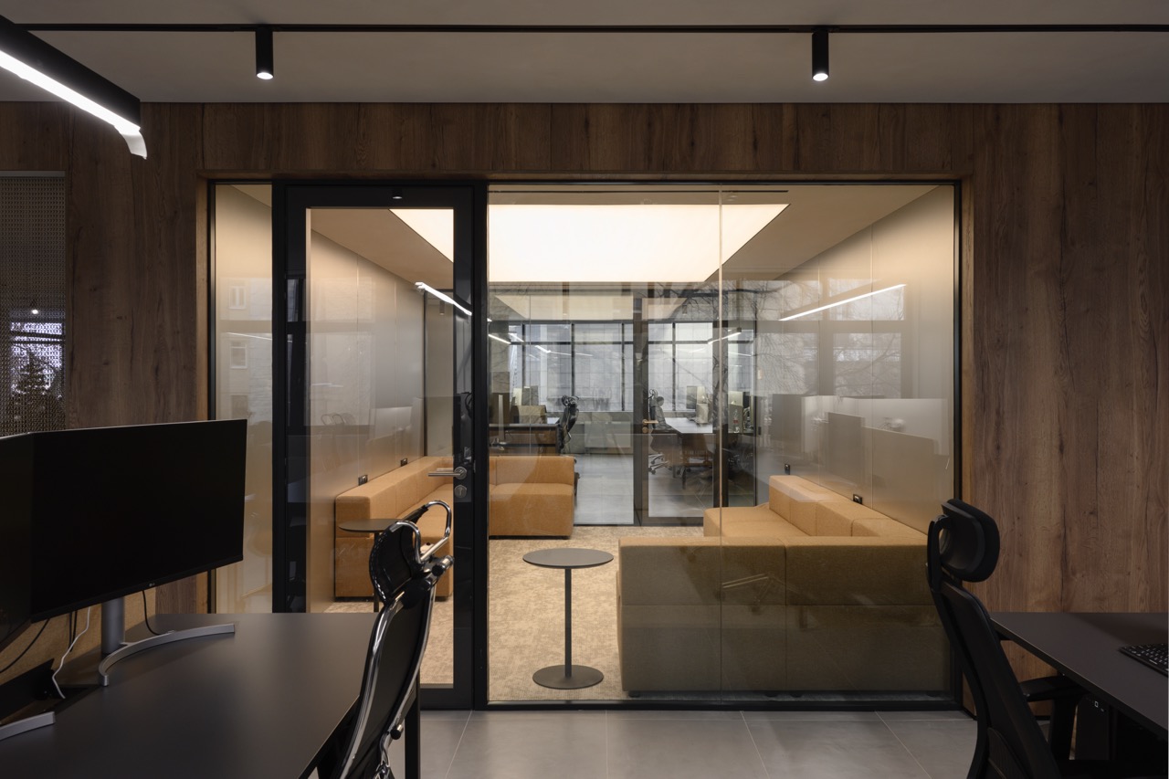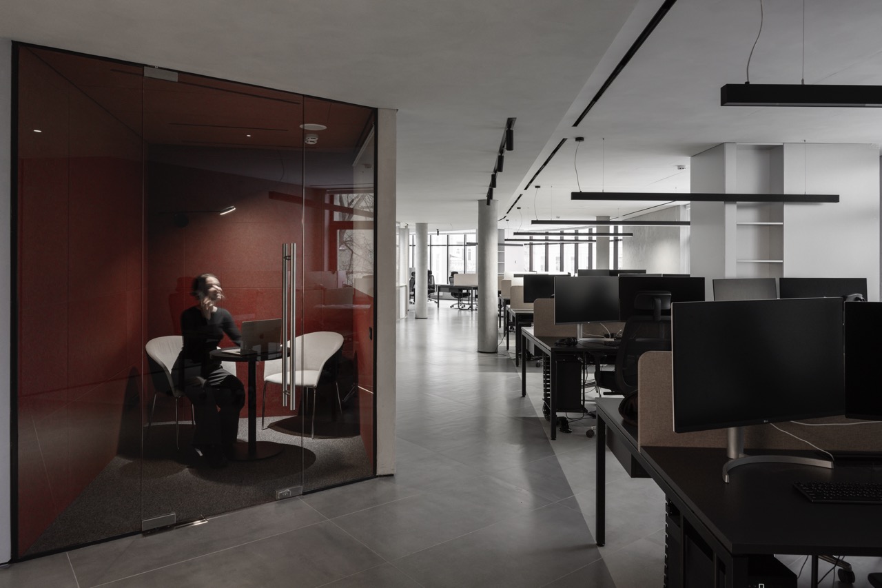 Функциональная программа офиса включает 110 рабочих мест, 4 отдельных кабинета, 6 переговорных комнат вместимостью до 5 человек и 2 кухни с обеденными зонами, расположенными в разных блоках офиса.