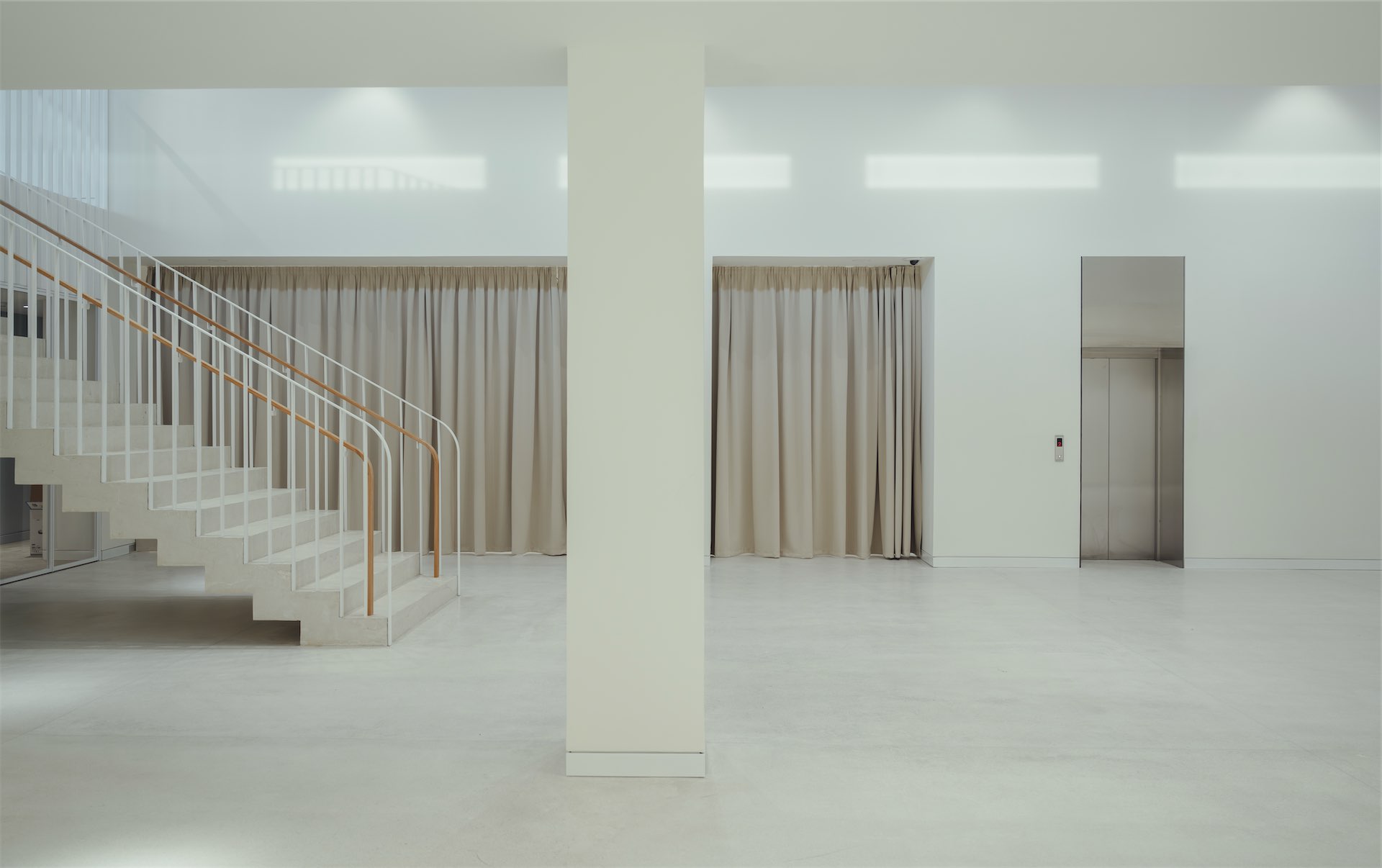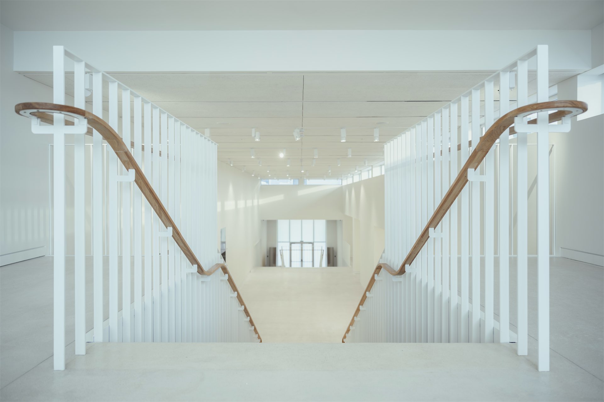 Главная лестница, заданная конструкцией здания, переосмыслена и трактована как главная «артерия», организующая зонирование: пространства перетекают друг в друга, служебные, выставочные и публичные зоны оказываются связаны между собой. Горизонтальность процессов — важная часть философии «Виктории». И в интерьере это читается буквально: маршруты не диктуют, а предлагают мягкие переходы между визуально сцепленными пространствами. Дизайн ограждения лестниц позволяет использовать лестничное пространство как продолжение экспозиции и способ навигации.