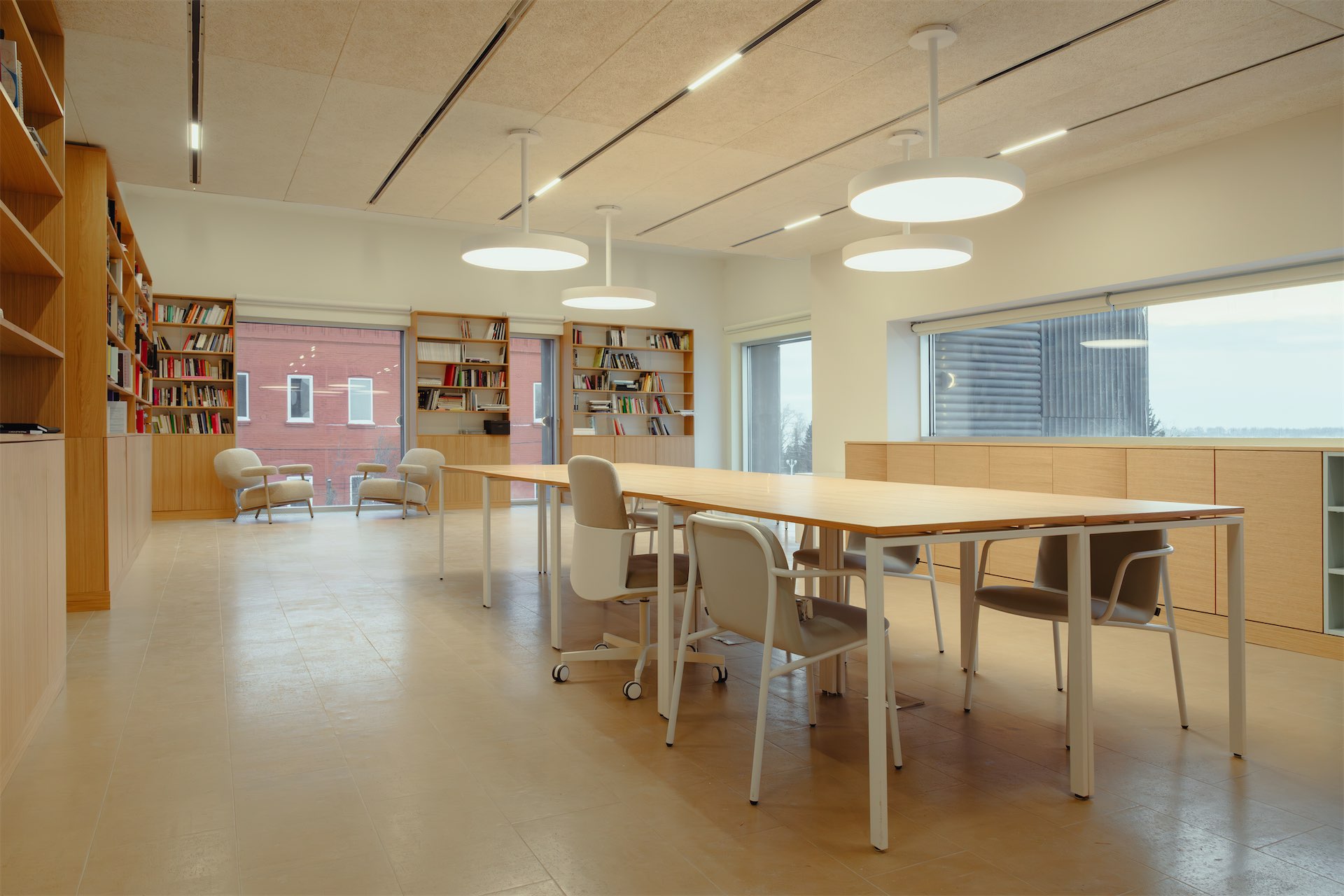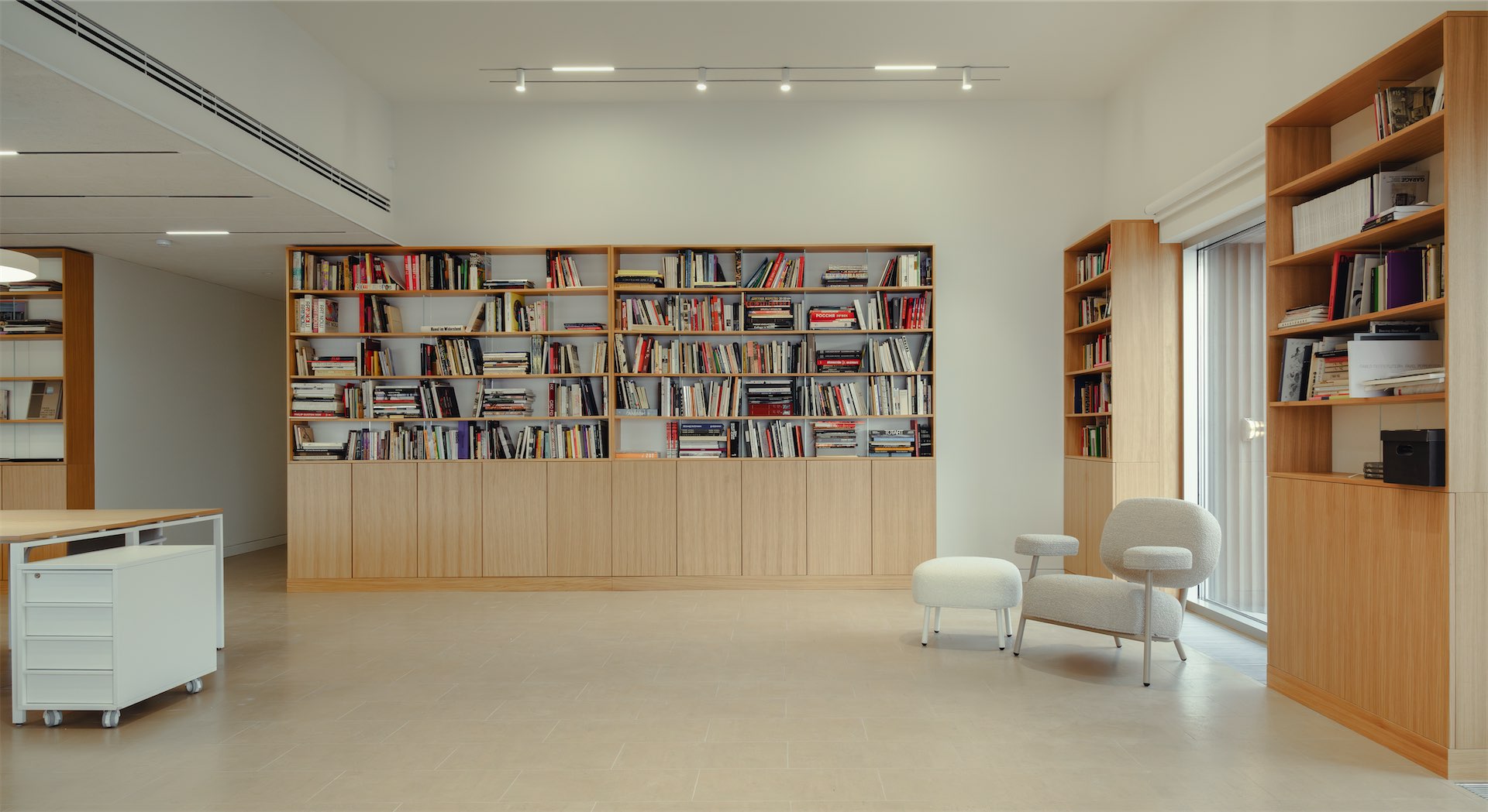 Вторая идея пространственного решения — «контейнерность». Встроенная мебель спроектирована как четкая модульная структура: стеллажи, шкафы, полки образуют ячеистую систему. Это позволит кураторам, художникам и посетителям свободно менять наполнение и структурировать контент.