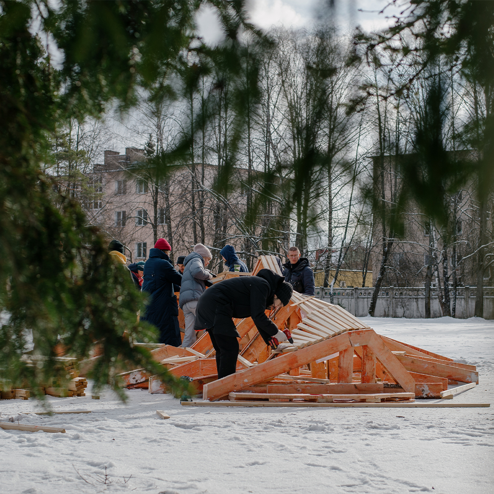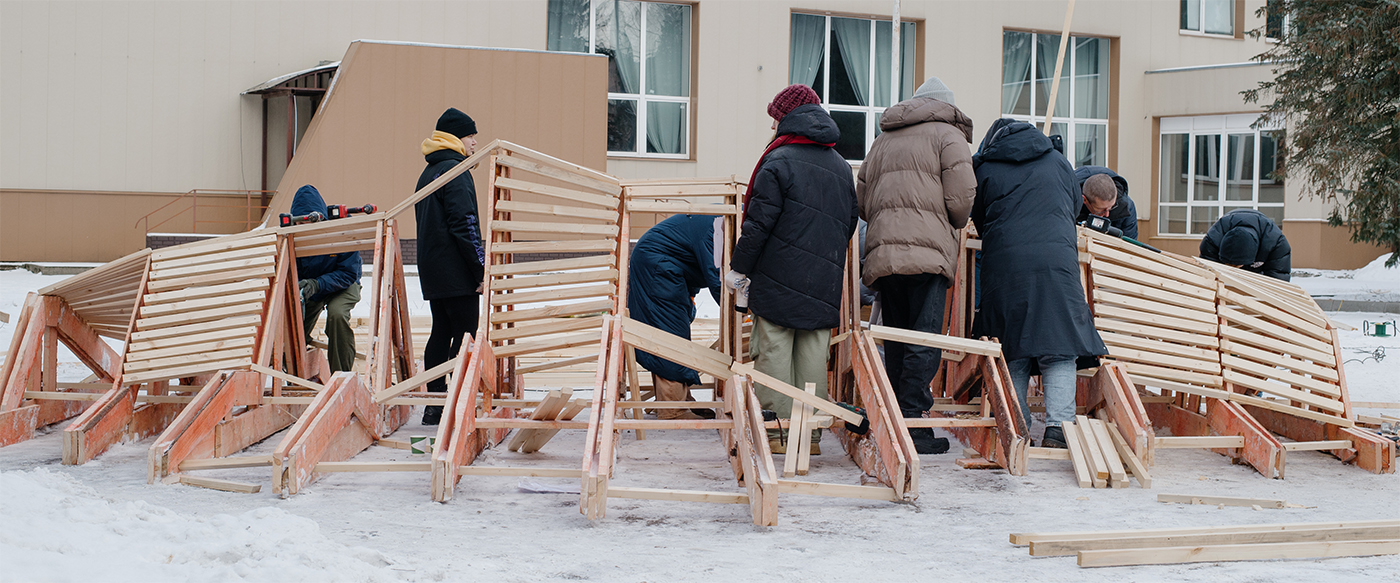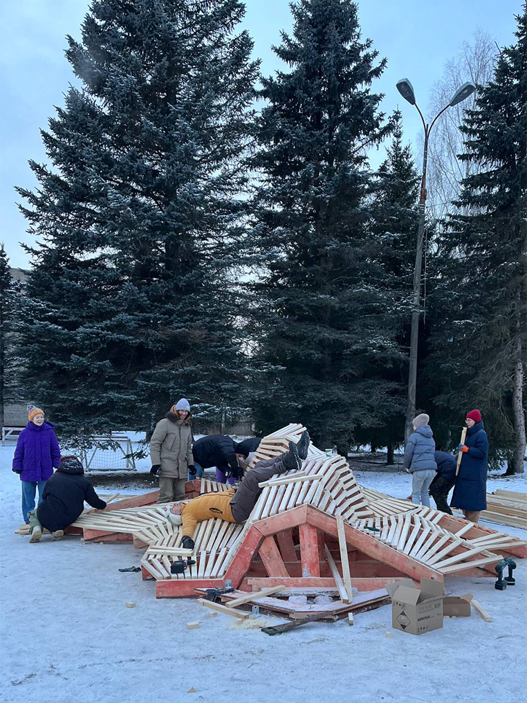 Этот воркшоп – коллаборация двух университетов, двух институций: Московской архитектурной школы (МАРШ) и Государственного университета «Дубна» (ГУД), которые были включены в процесс и отзывались на наши просьбы. Но также ценно было и то, что к стройке присоединились дубненцы. Ребята из объединения «Звено» с первых дней поддерживали наши активности, помогали собирать инструменты, находить спонсоров, партнеров и, конечно, строили вместе с нами. Сотрудники локального кафе «Нейтрино» привезли на площадку кофе и печенье, что помогало согреться. Во время процесса к нам подключались жители города, например, семья с детьми, живущая неподалеку. Увидев нас во время прогулки, они пришли со своими инструментами: отец помогал обшивать настил, а дети убирали территорию вокруг от обрезков.