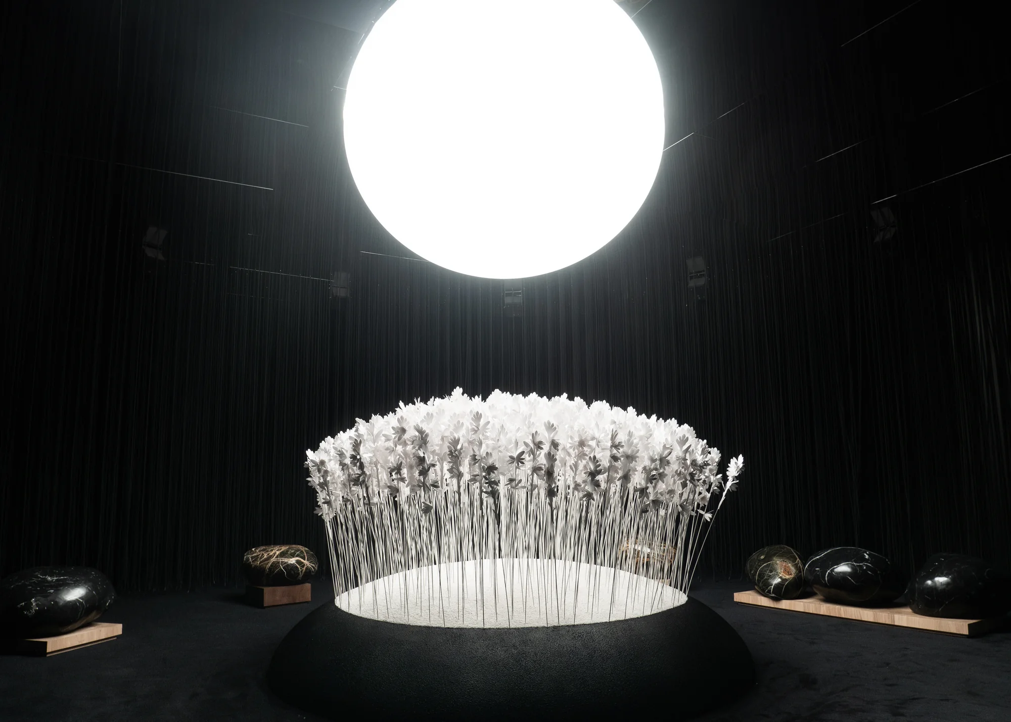 Марк-Антуан Барруа представил свой новый аромат Aldebaran и первую коллекцию мебели, выпущенную совместно с дизайнером Антуаном Буйо в Salone dei Tessuti — шоуруме образца 1925 года, принадлежавшего модному дому Galtrucco. Чтобы добраться до цели, читай, аромата, который источали белые бумажные цветы (основная нота аромата — тубероза — цветок, чей запах усиливается с наступлением ночи), посетителям пришлось проделать непростой путь сквозь «черный лес» из резиновых трубок в полной темноте и в кубе с зеркальными стенами. В качестве ориентира — звезда Альдебаран (по словам авторов, символ надежды и оптимизма), висевшая над инсталляцией в окружении огромных валунов, ставших основой мебельной коллекции. Выполненные из мрамора они повторяют форму камней, которые Марк-Антуан собрал с сыном на острове Бель-Иль. Вернуться в то время, когда камни были большими (а еще — в состояние паники), после потери всех ориентиров в «черном лесу» удавалось без труда.