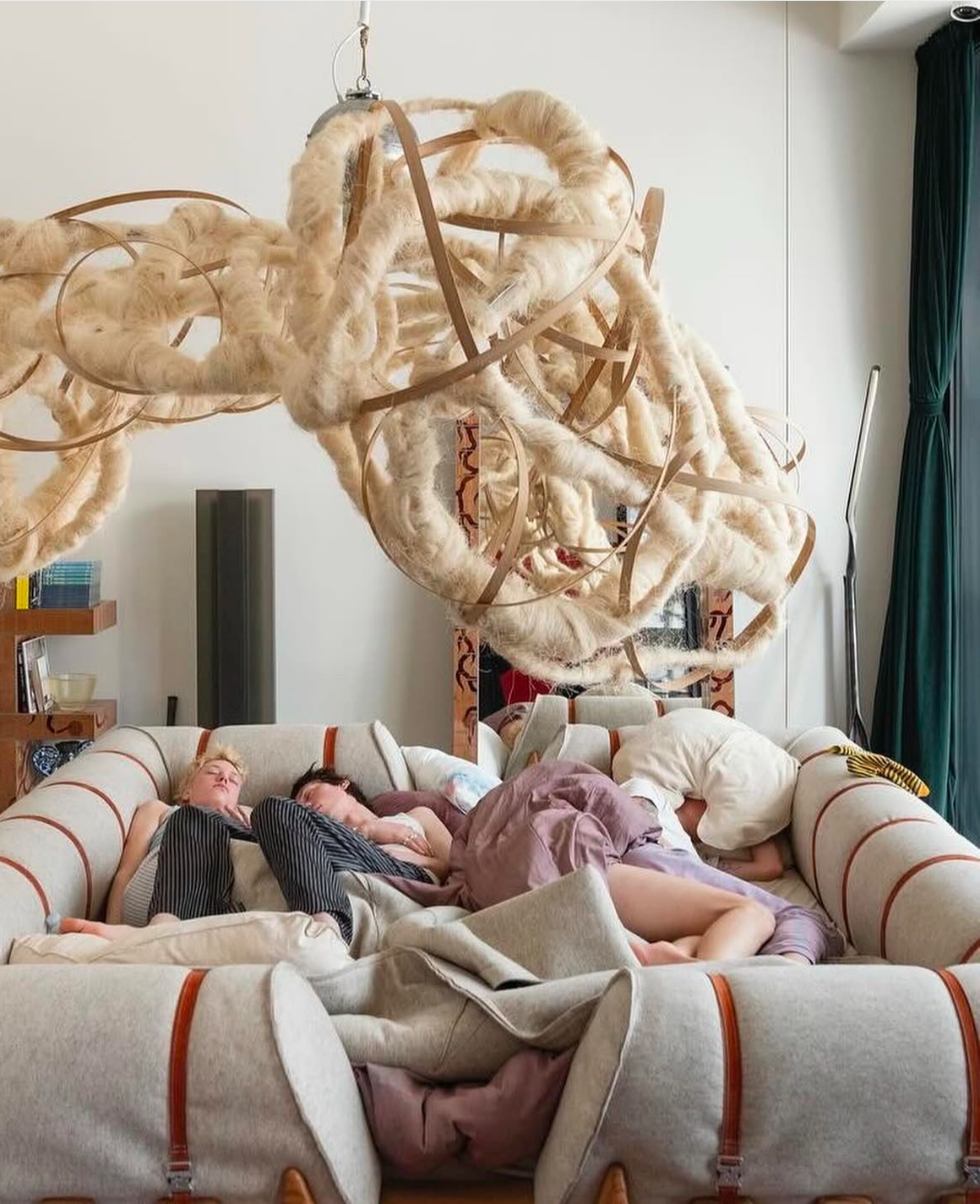 Модные бренды в буквальном смысле перетянули одеяло на себя, а вместе с одеялом и все очереди. Финская компания Marimekko (начинавшая с тканей, но сегодня выпускающая и фэшн-коллекции) представила инсталляцию All the Things We Do in Bed, созданную совместно с художницей и фуд-дизайнером Лайлой Гоар в Teatro Litta. Здесь можно было передохнуть, прилечь после забега по городу, а если повезет —попробовать торт в виде кровати. Коллекция Гоар для Marimekko, основанная на архивных принтах Майи Исолы, будет доступна в сентябре.
