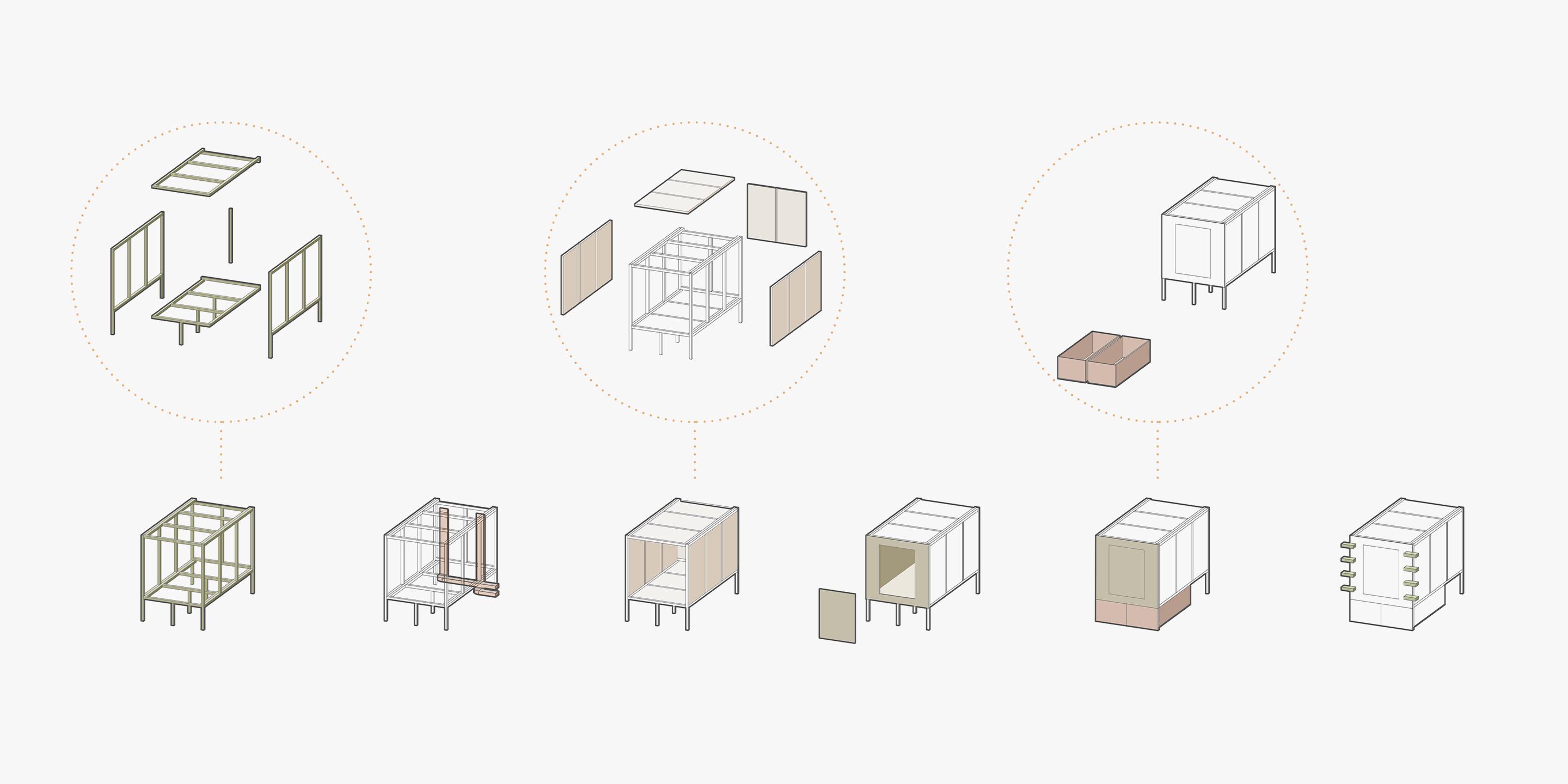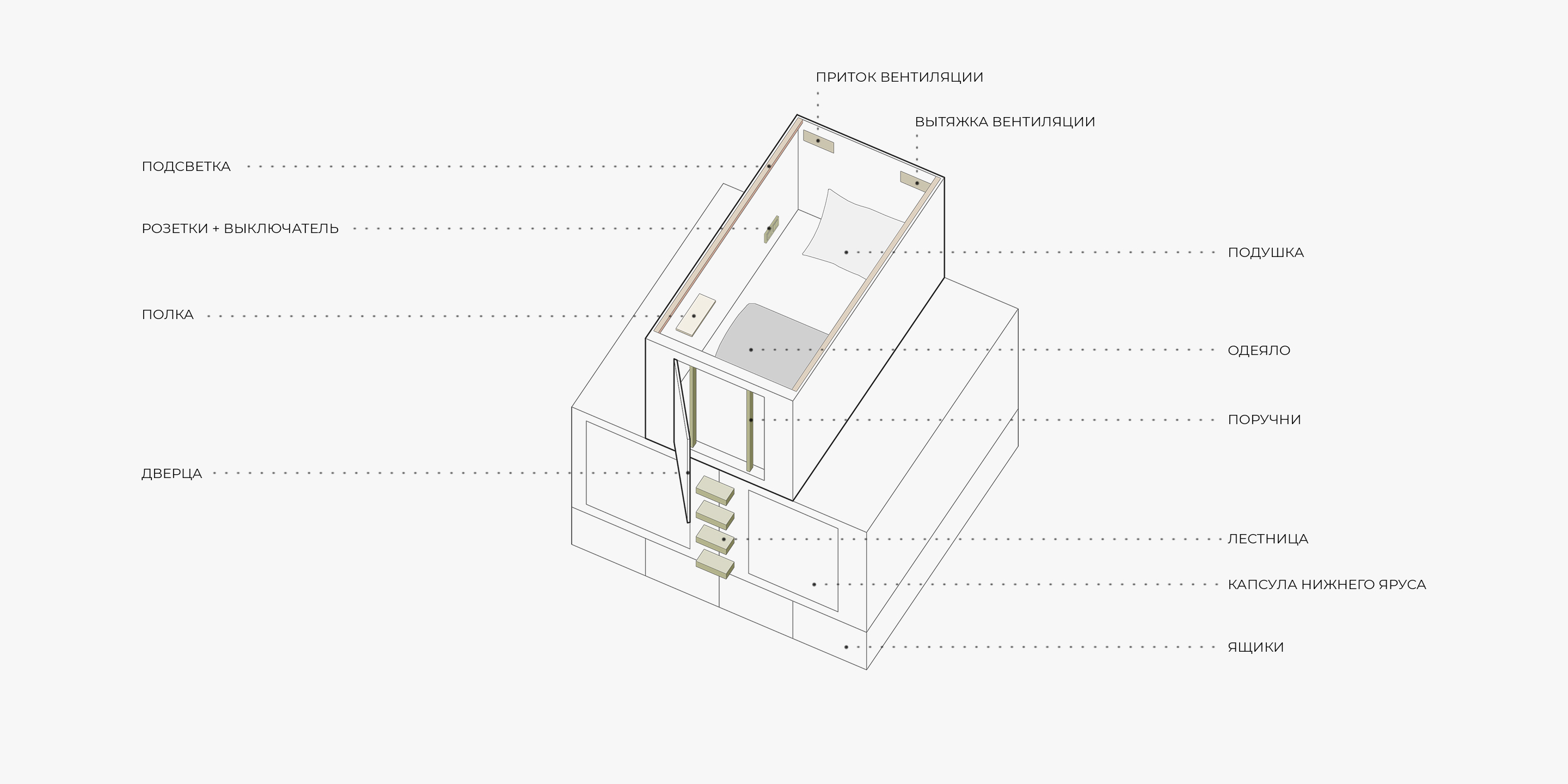 Следующим этапом была разработка внутреннего оснащения капсулы необходимого для комфортного пребывания: освещение, розетки, полочки для хранения. Для смены постельного белья мы придумали систему «вынимаемых» легких матрасов, которые заправляются в простыни, как в наволочки.