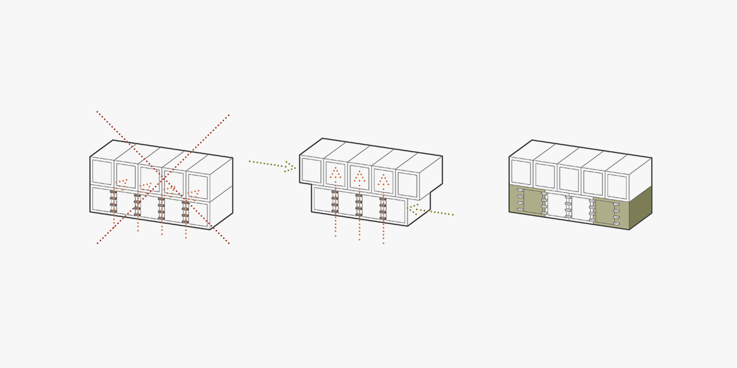 Оказалось, что в привычной конфигурации капсул, как в японском отеле Capsule Inn Osaka, неудобно подниматься на верхний ярус: чтобы попасть в капсулу, нужно со ступенек сделать шаг в бок. Поэтому мы сдвинули верхний ряд капсул, добавили поручни внутри и обеспечили легкий подъем. Благодаря такому сдвигу в нижнем ярусе образовались двойные капсулы для размещения двух людей. На площади 209,8 м² получилось разместить 97 одинарных и 14 двойных капсул.