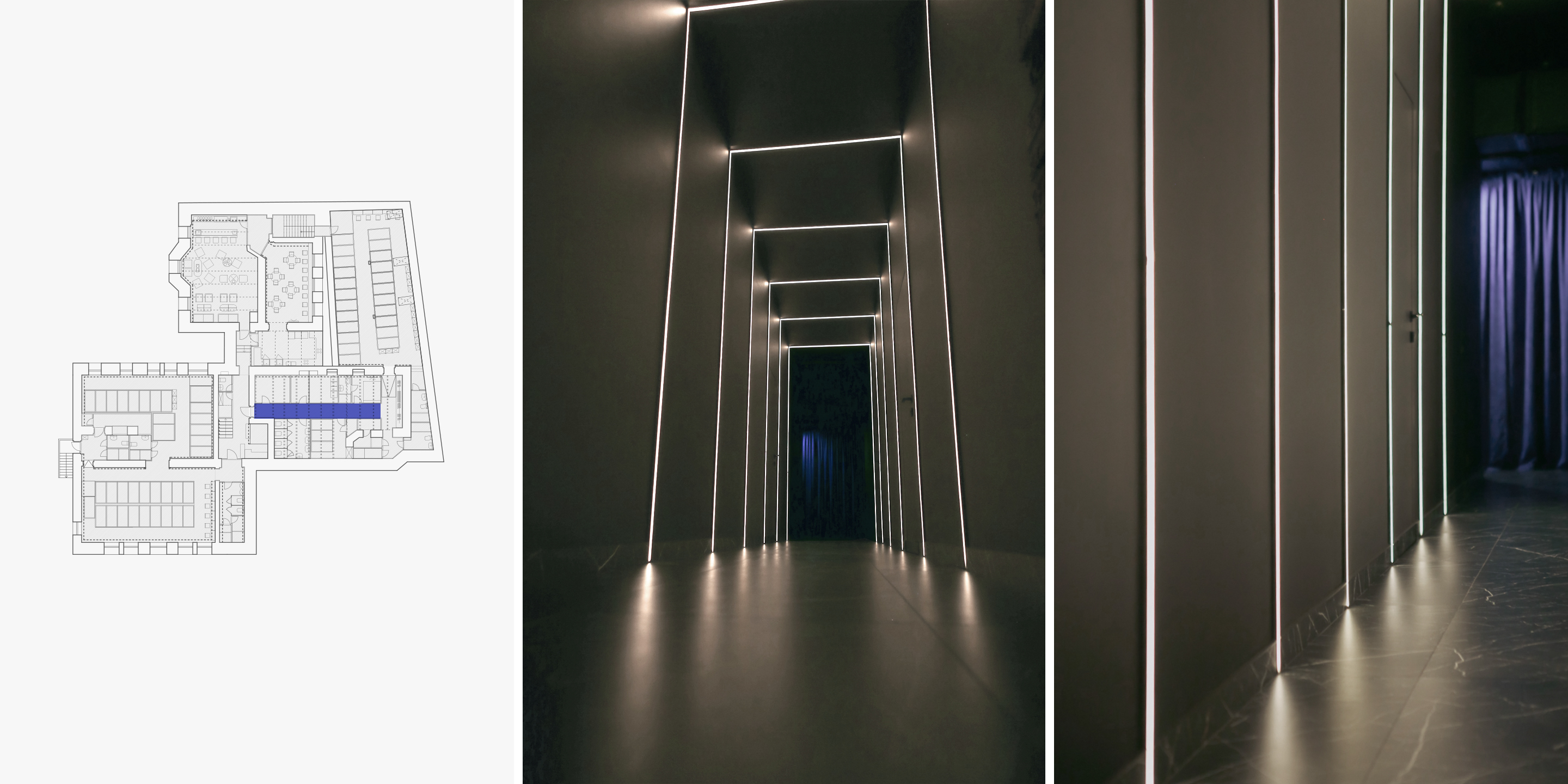 Мы понимали, что в работе с общественным пространством важно, с одной стороны, учесть все риски и нормы (в этом нам помогло архитектурное образование и опыт работы в бюро), а с другой – сделать его местом притяжения, найти креативные решения даже в рамках ограниченного бюджета. Например, технический коридор мы превратили в арт-пространство с подсветкой, используя алюминиевые профили, светодиодную ленту и равный шаг.