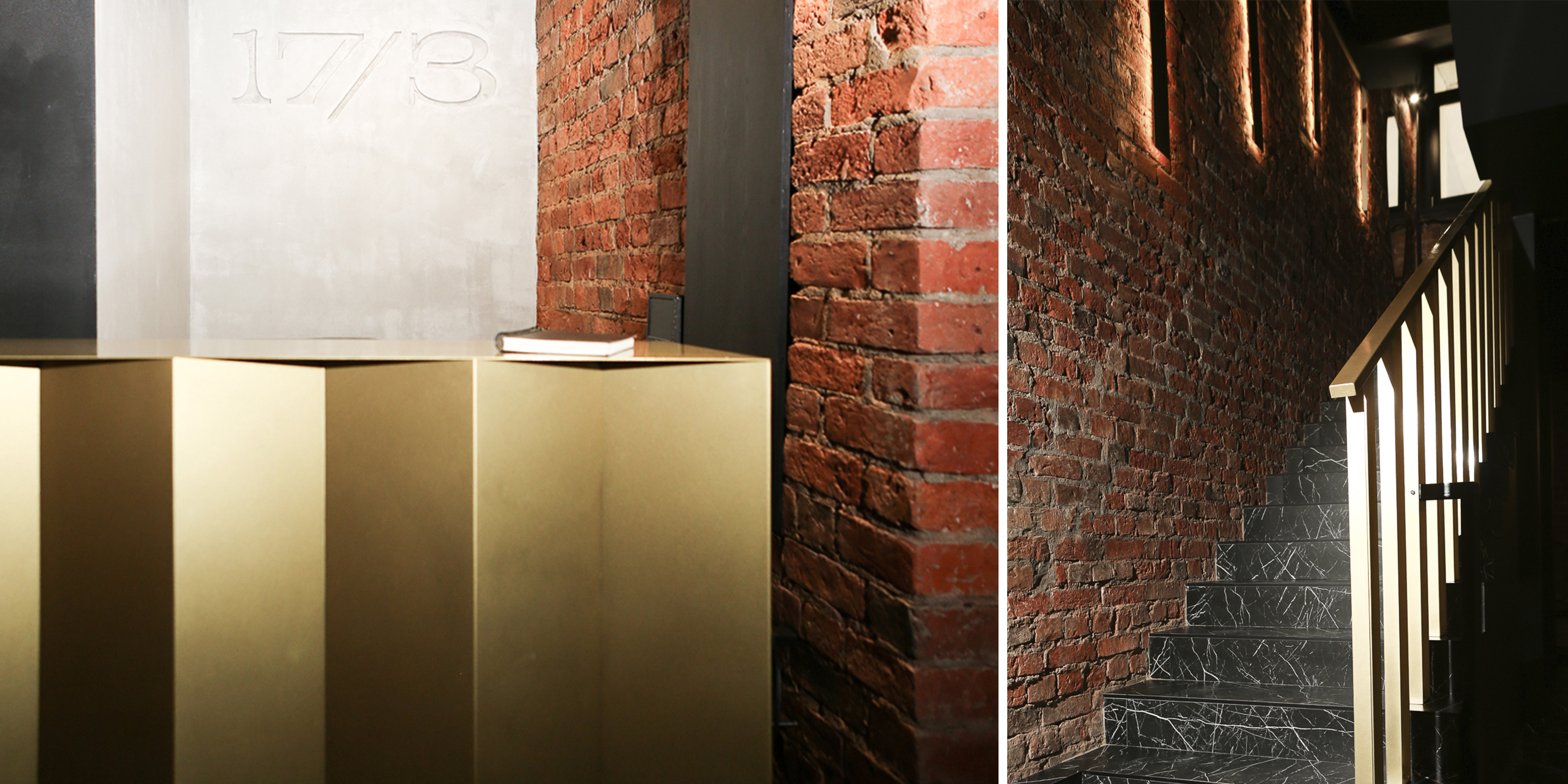 Для входной зоны разработали светильники, перила и стойку ресепшн, которые сварили по нашим эскизам из металла и покрасили в автомастерской. Логотип отеля 17/3 сделали с помощью «впечатывания»: детали из фанеры прислонили к стене, заштукатурили вокруг и убрали. Получился эффект тиснения в бетоне.
