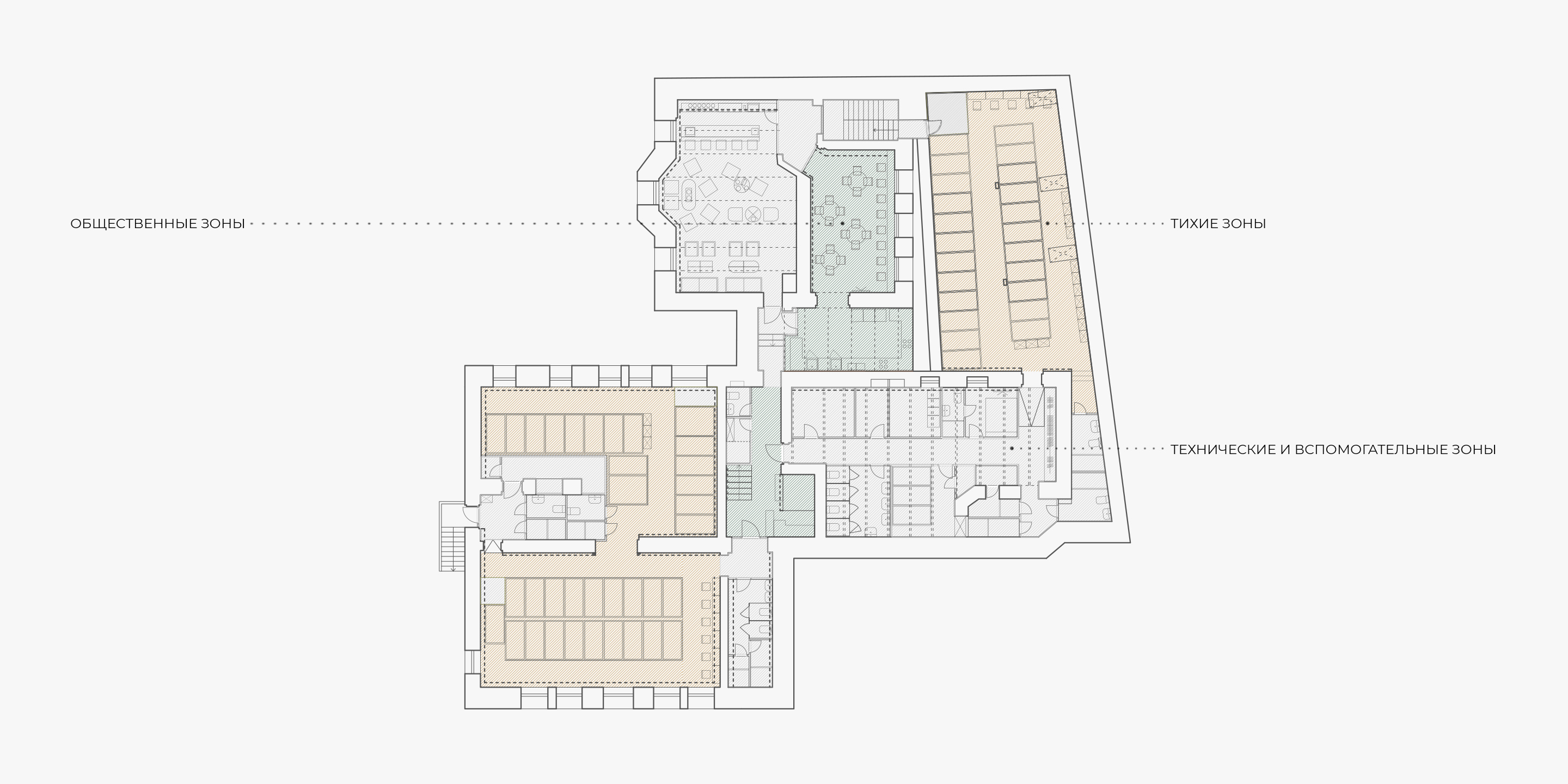 При разработке концепции мы разделили пространство на тихие (252,2 м²) и общественные (75,4 м²) зоны и разнесли их в разные части отеля. В тихих зонах располагаются капсулы для сна и рабочие места, а в общественных – кухня и помещение для отдыха. Так было сделано, чтобы обеспечить комфорт для всех гостей: одни могут спокойно спать или работать, другие – общаться или готовить. Никто не мешает друг другу.
