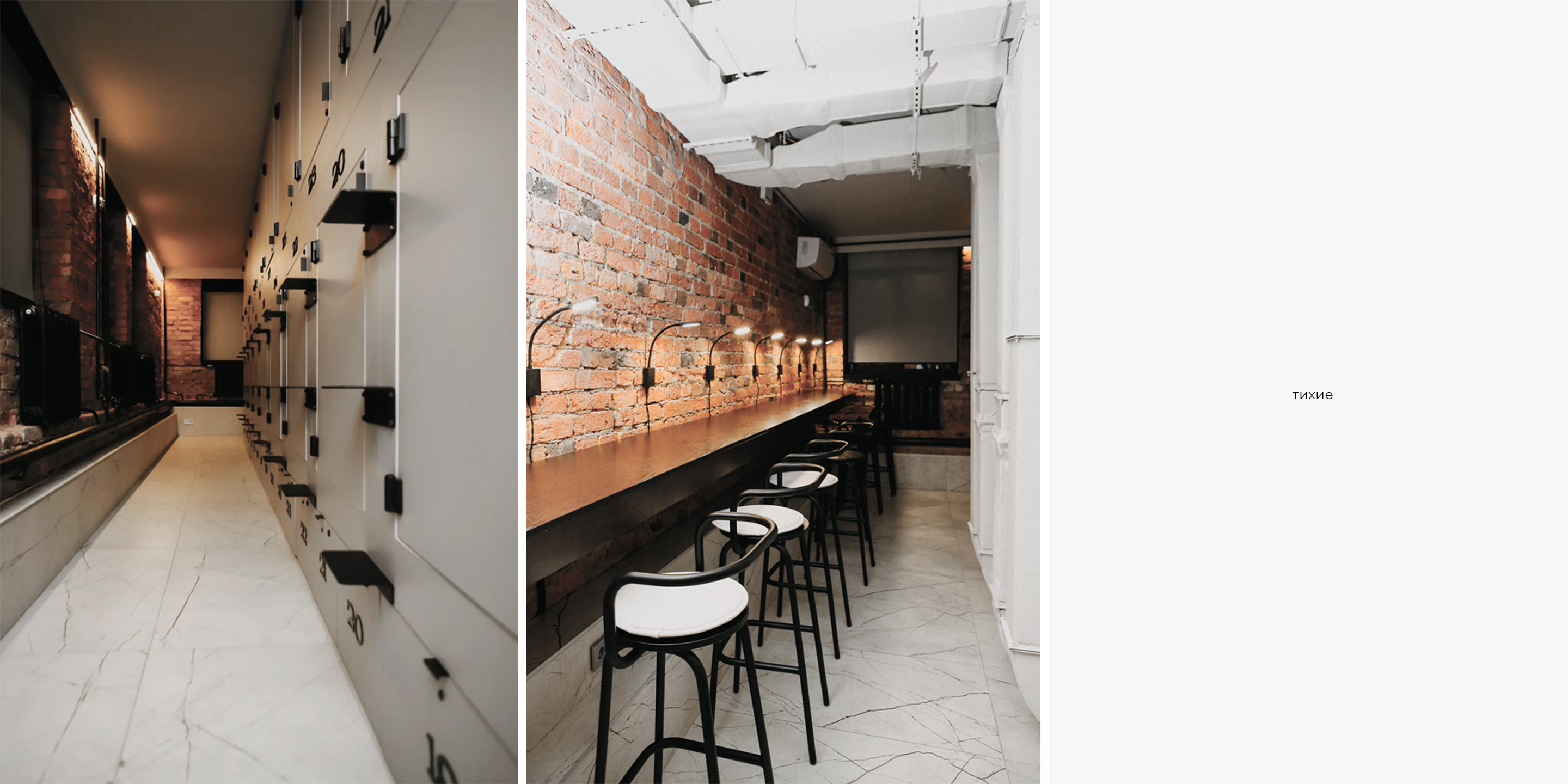 Мы также подчеркнули контраст за счет дизайна: тихие зоны сделали минималистичными в светлых тонах и с приглушенным светом, что способствовало бы расслаблению и отдыху гостей, а общественную часть превратили в арт-пространство с темными материалами и акцентными латунными элементами.