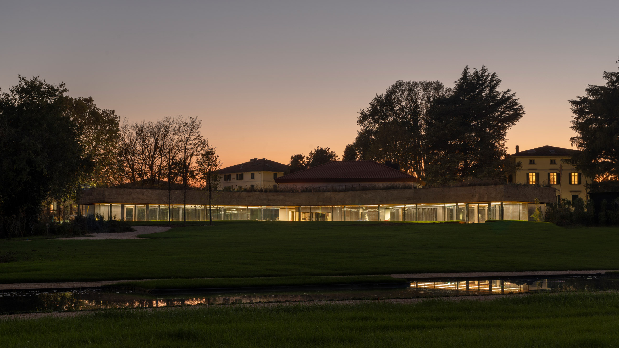 Проект Quisimangia — столовая для компании Mutti в Парме, спроектированная как здание с зеленой крышей, частично встроенное в ландшафт. Такой прием минимизирует визуальное воздействие на окружающую среду и улучшает тепловые характеристики пространства. В интерьере использован инновационный пол из переработанных томатных кожур — отходов производства Mutti.