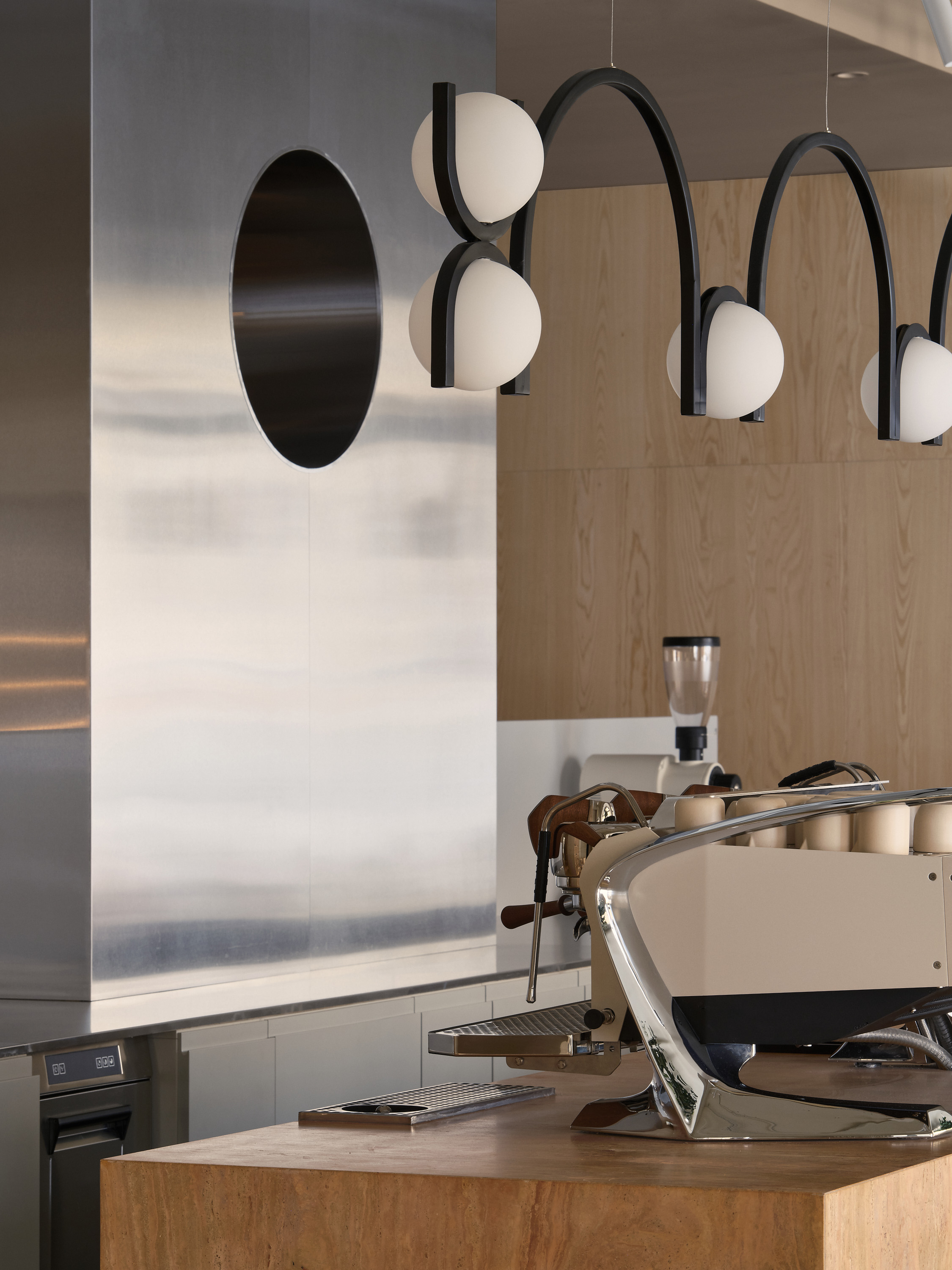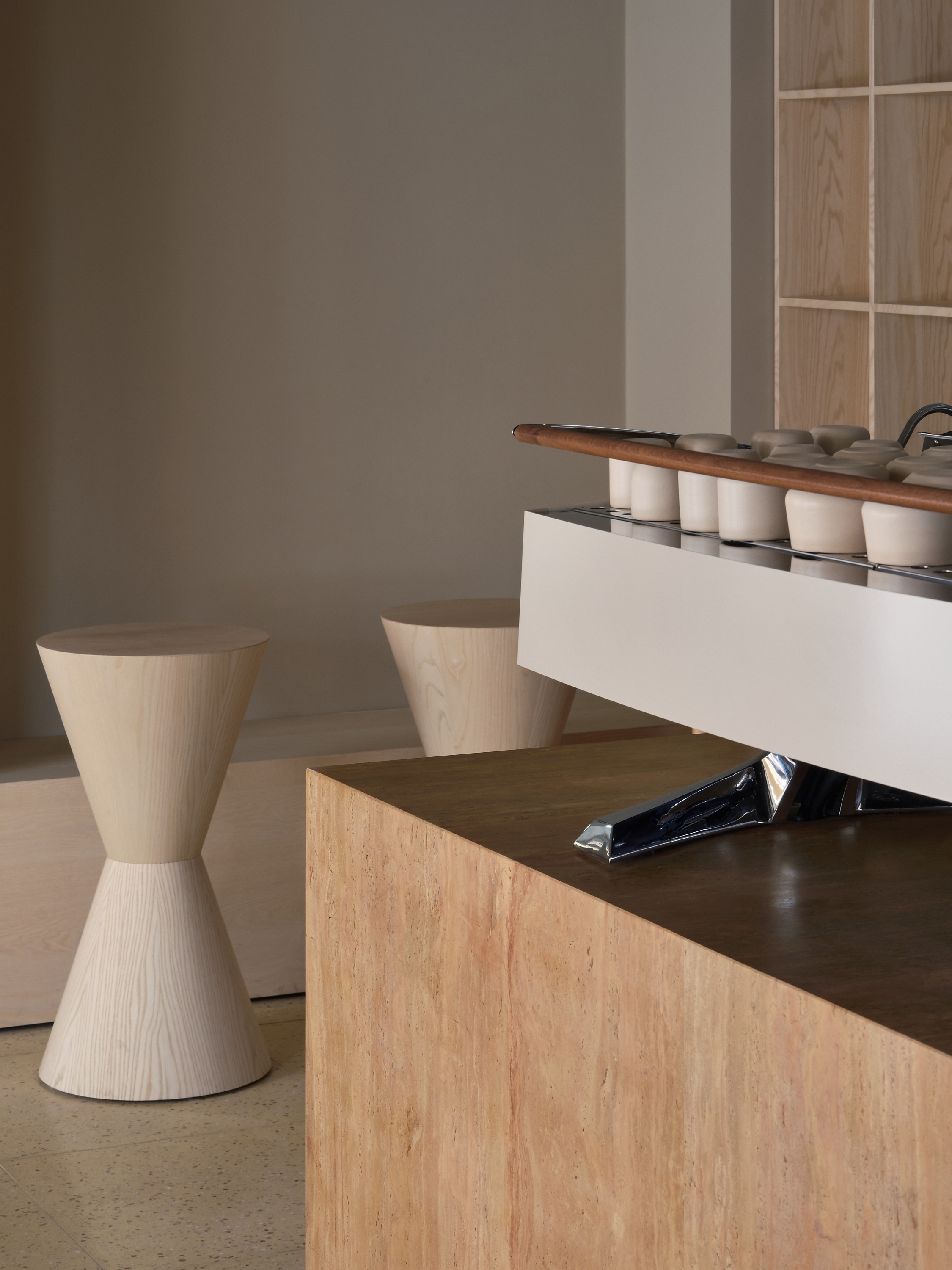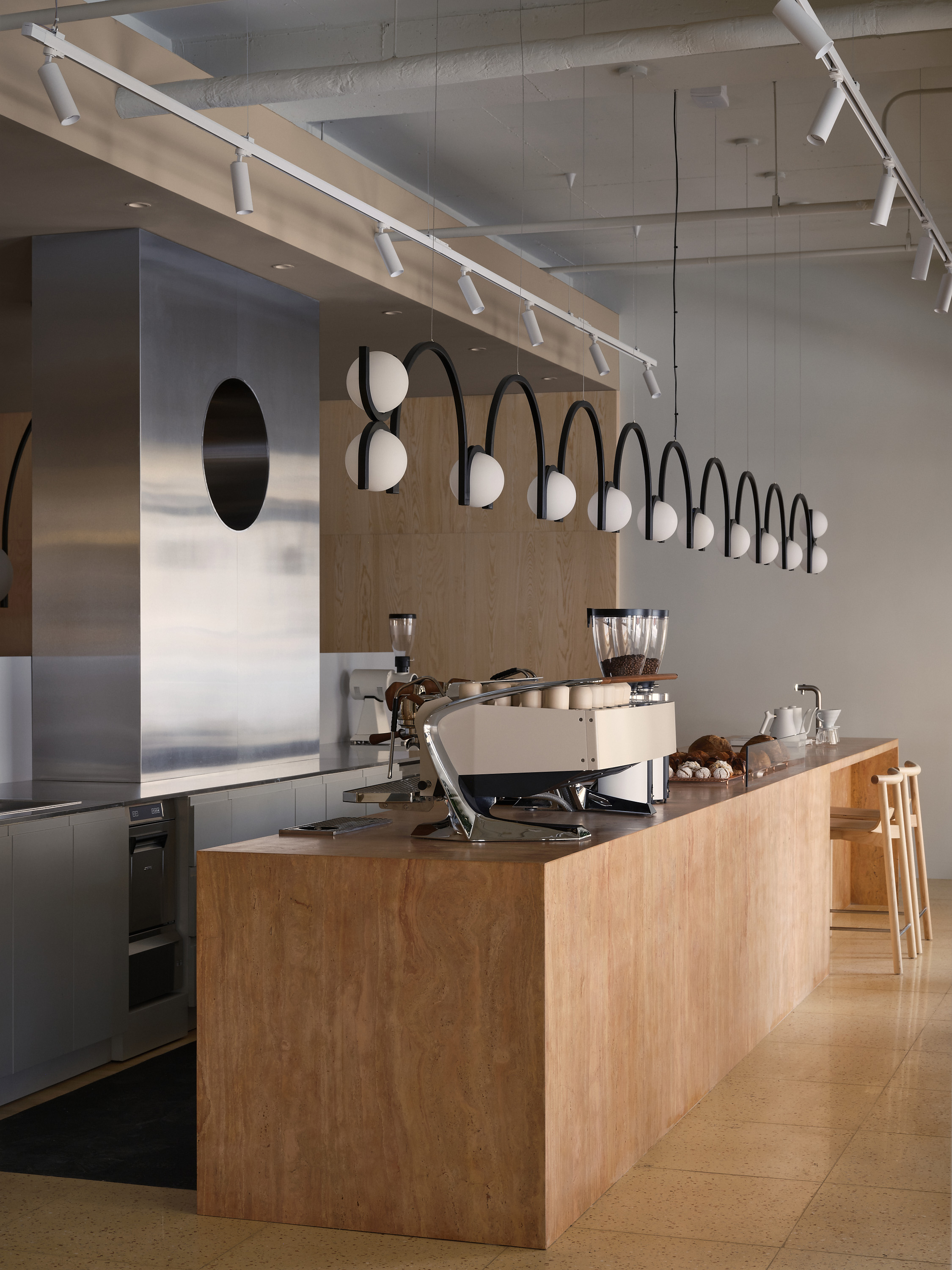 Андреевский рынок — памятник архитектуры конца XVIII века, возведенный по принципу гостиного двора с арочными галереями. Наружный облик здания охраняется, а внутреннее пространство — свободно для интерпретаций. Команда получила помещение в виде пустого бетонного объема и решила построить зонирование вокруг массивного острова из травертина, ставшего ключевой точкой интерьера. Вдоль светлых арочных окон разместилась так называемая «быстрая зона» — для тех, кто берет кофе на вынос, в глубине за сервисной стойкой — «медленная зона» для обедов и неспешного отдыха.