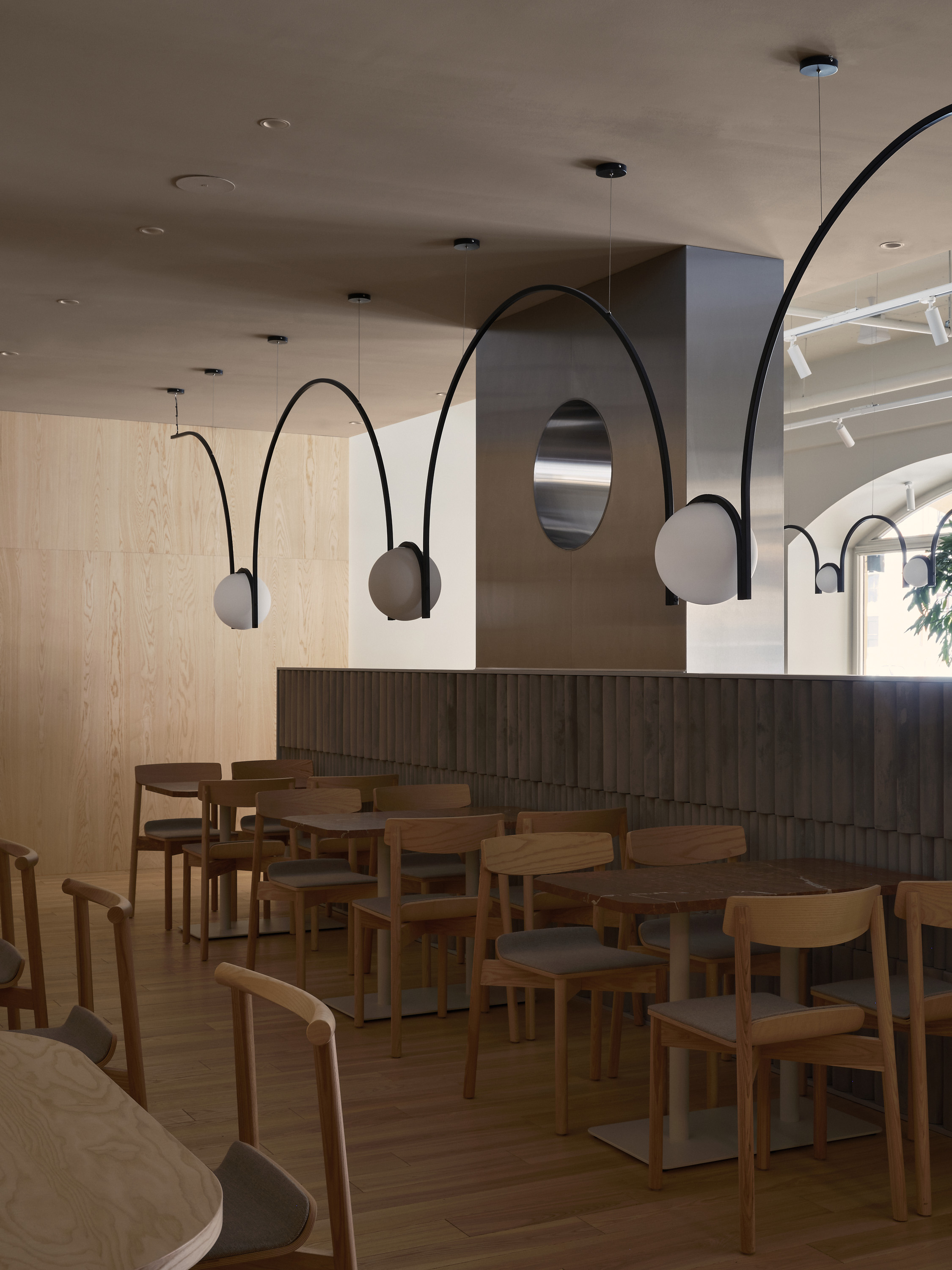 Особого внимания заслуживают светильники с черными металлическими дугами — они переосмысляют ритм арок Андреевского рынка. В архитектуре арка работает за счет распора, перераспределяя давление. В интерьере этот принцип интерпретирован метафорически: роль несущего элемента играет свет, нематериальный, но визуально структурирующий пространство. Световые дуги словно фиксируют момент напряжения — «пружина», которая вот-вот разожмется.