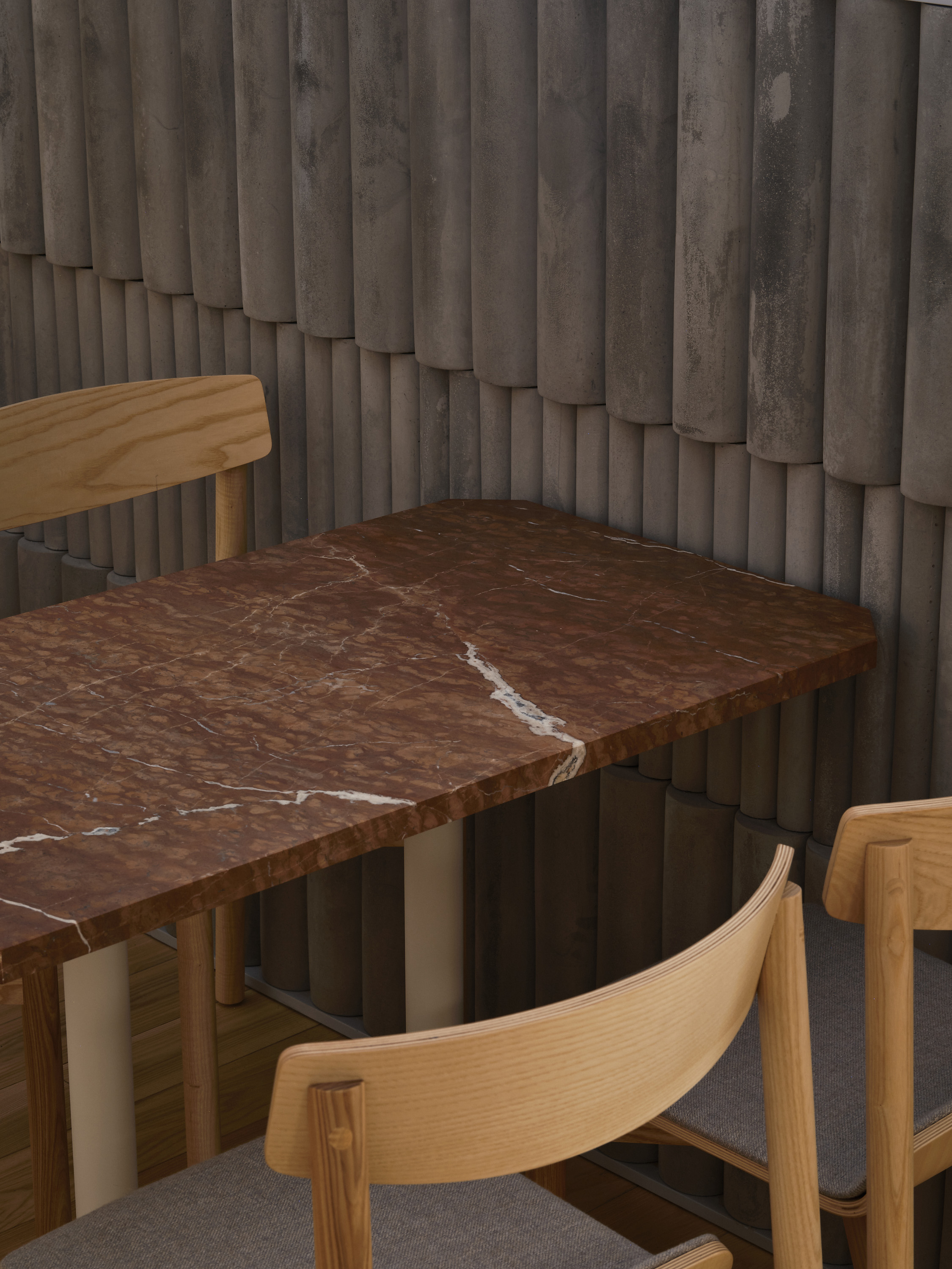 Интерьер строился на контрасте с серыми петербургскими пейзажами. В основе — теплая палитра и тактильные материалы: травертин, натуральный камень, шпон, дерево. «Хотелось создать пространство, которое ощущается как теплый воздух», — комментируют архитекторы. В зоне для длительного пребывания добавлены акценты: красный мрамор, деревянный пол и рельефное бетонное панно.