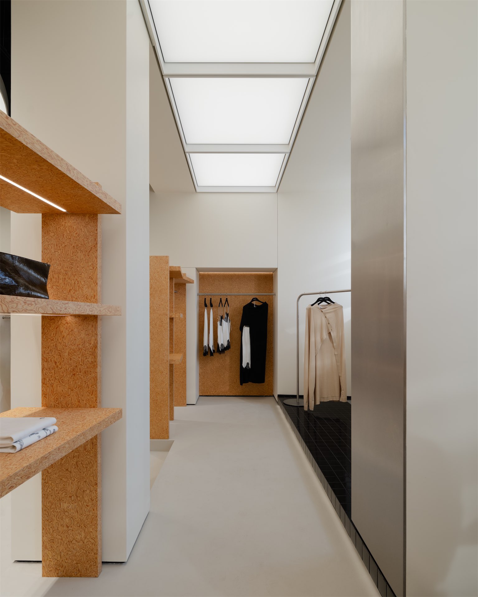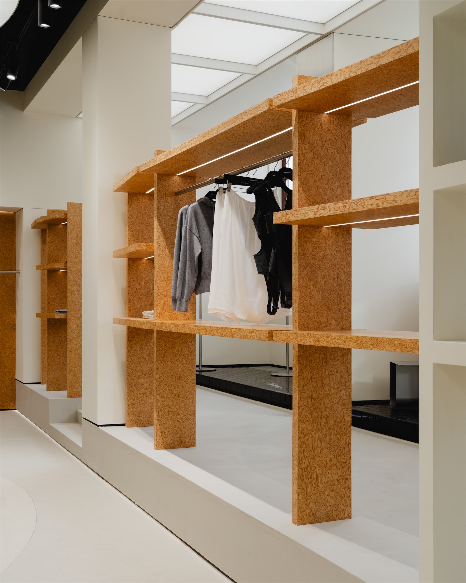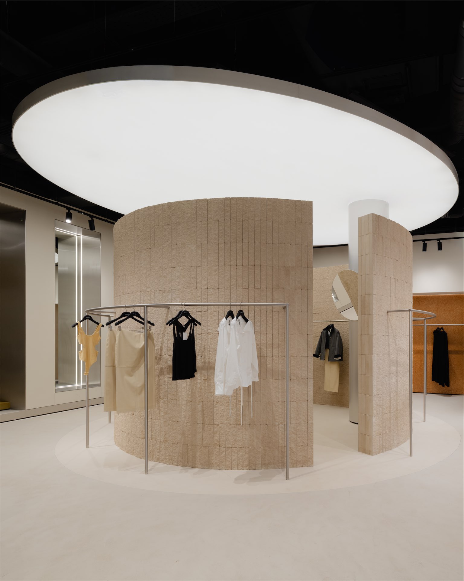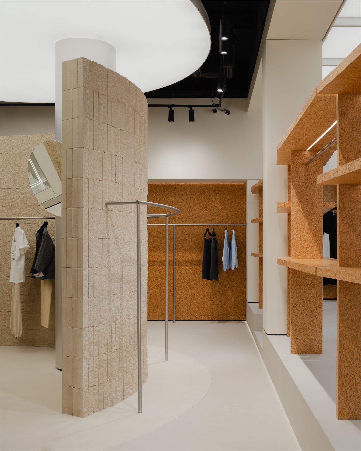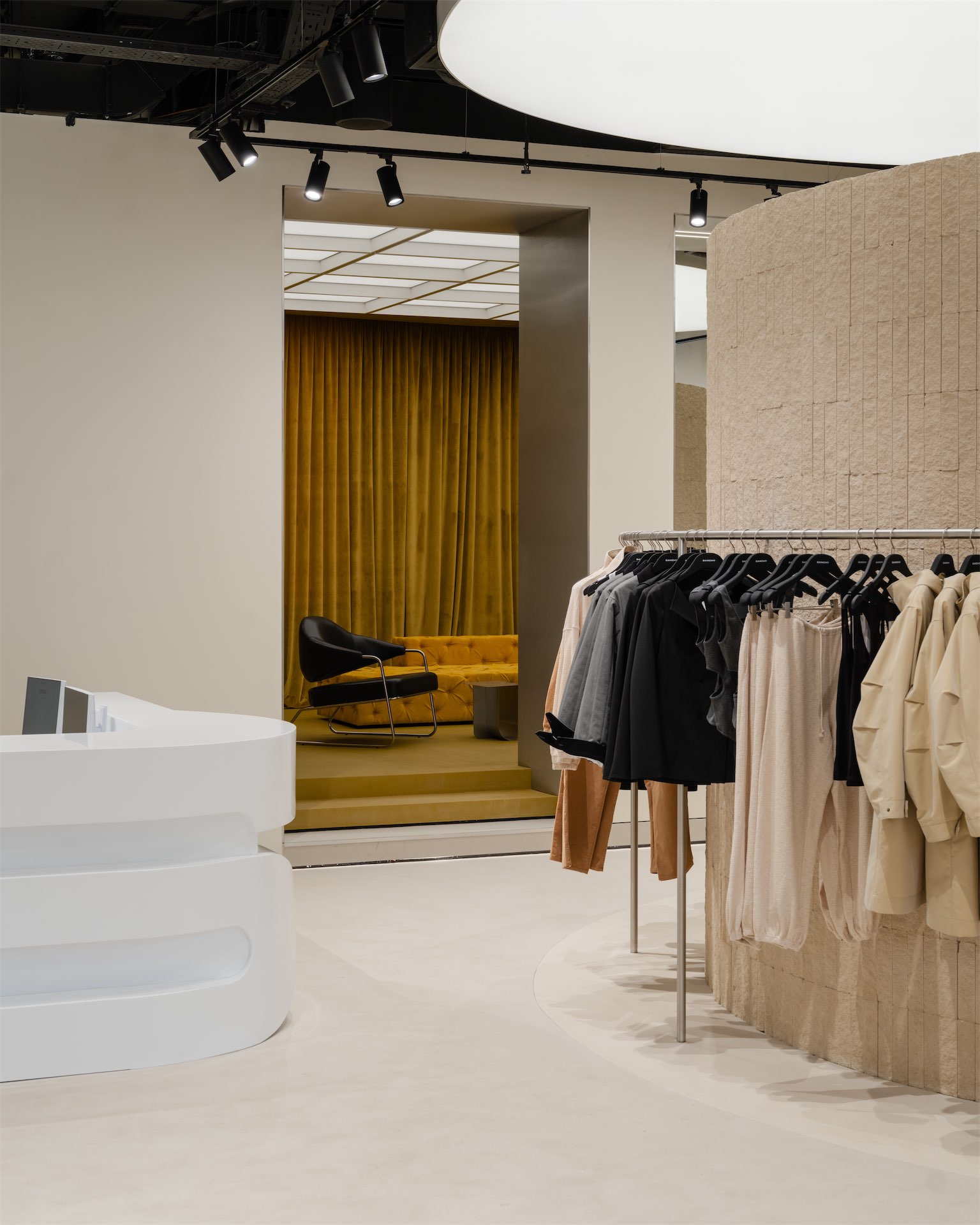 Пространство раскрывается как последовательность двух состояний. Первая зона — светлый «квадрат» с рыжеватыми полками из дубового шпона и полукруглой перегородкой, за которой скрываются рейлы. Вторая — более камерная «мягкая» комната с примерочными, бархатистыми кулисами и диваном; внутри команды ее называют лаунжем, отсылая к будуарной эстетике бренда.