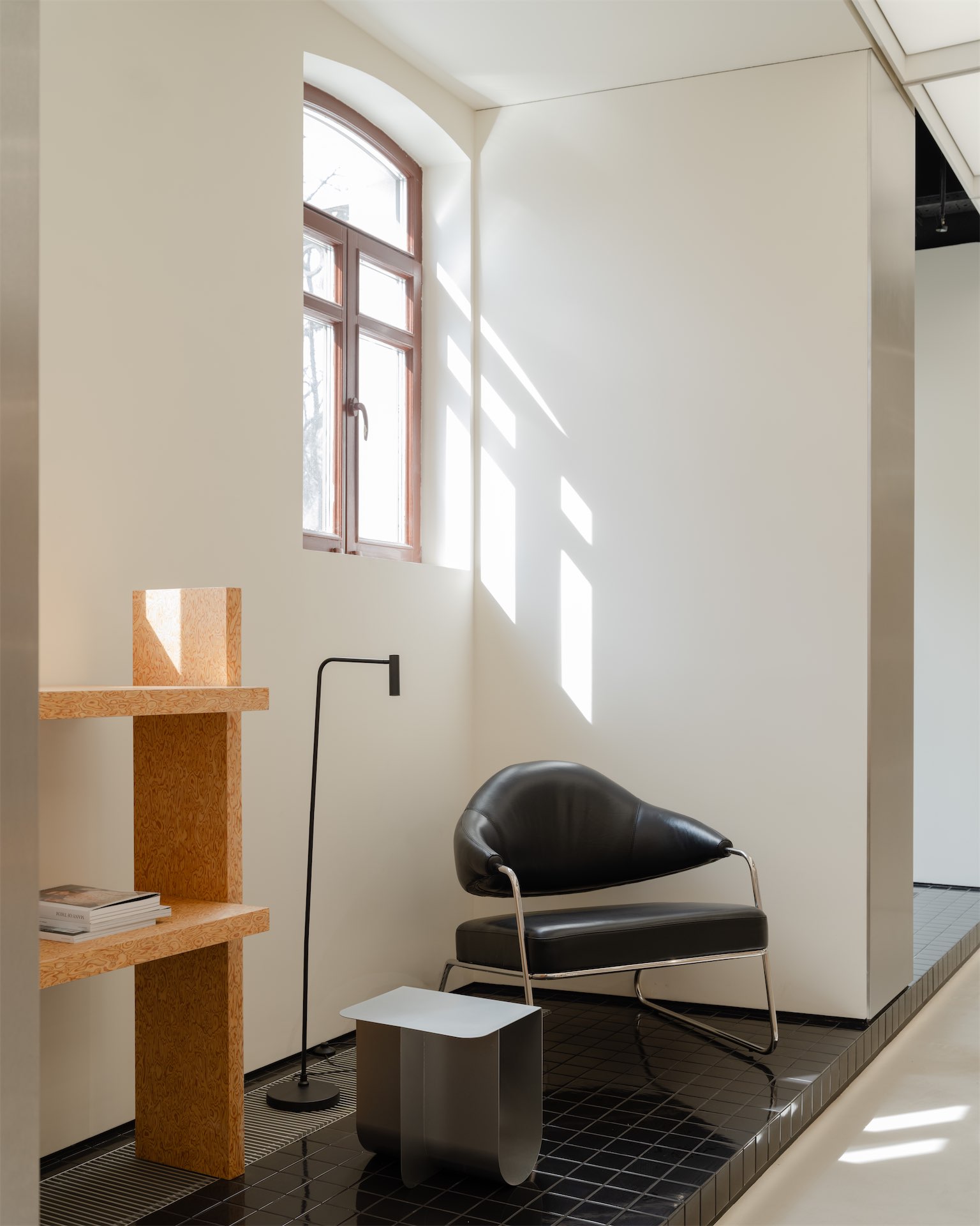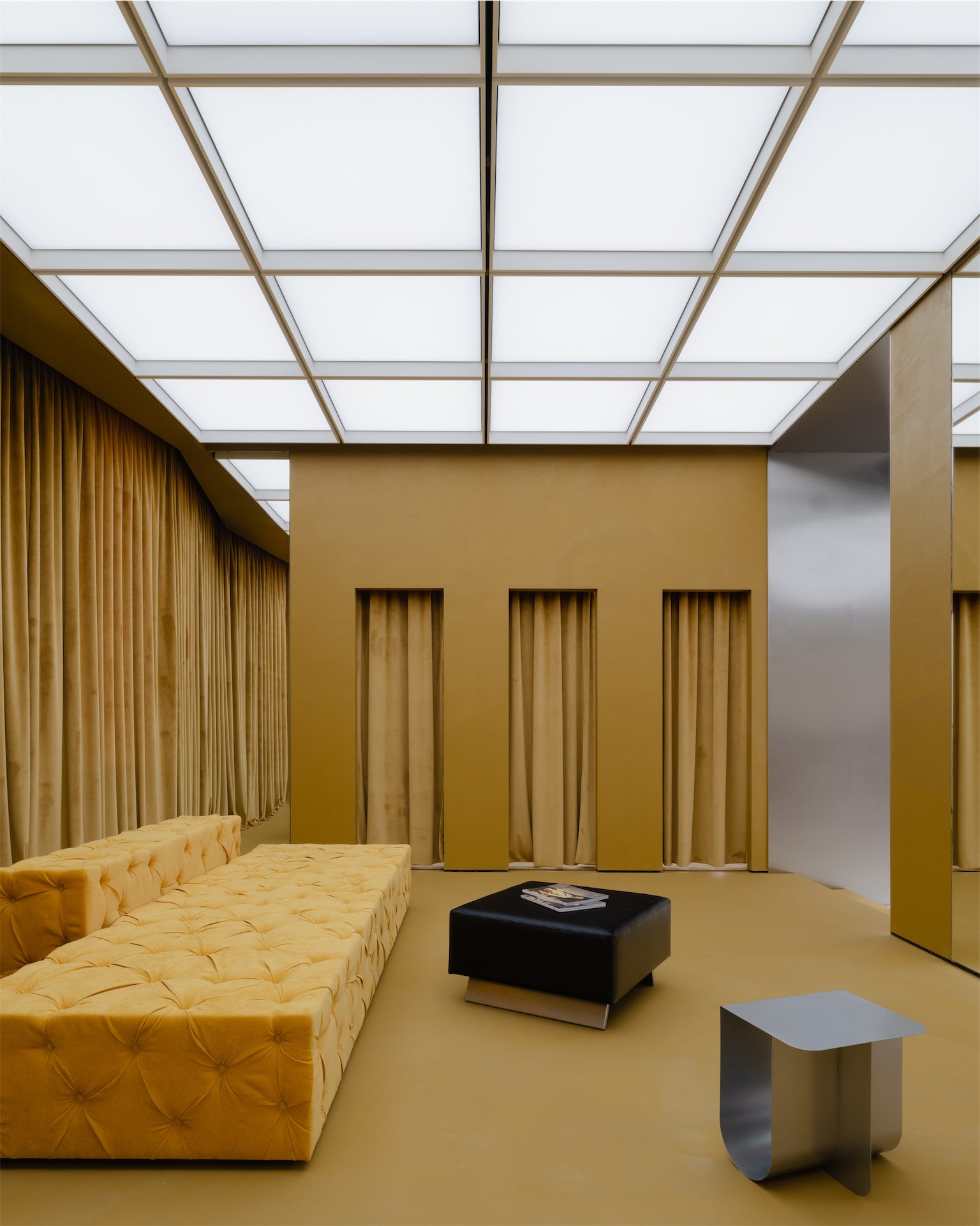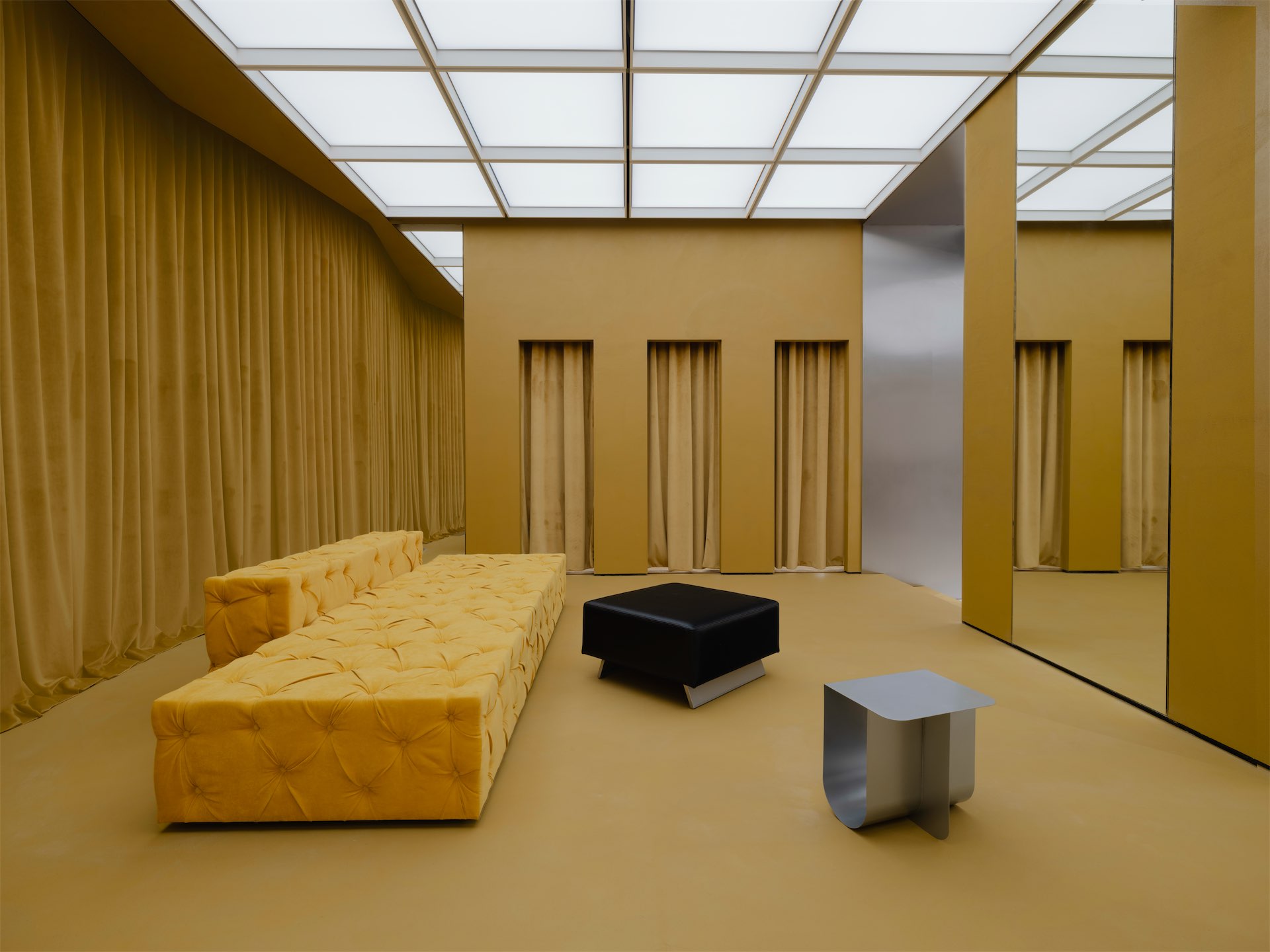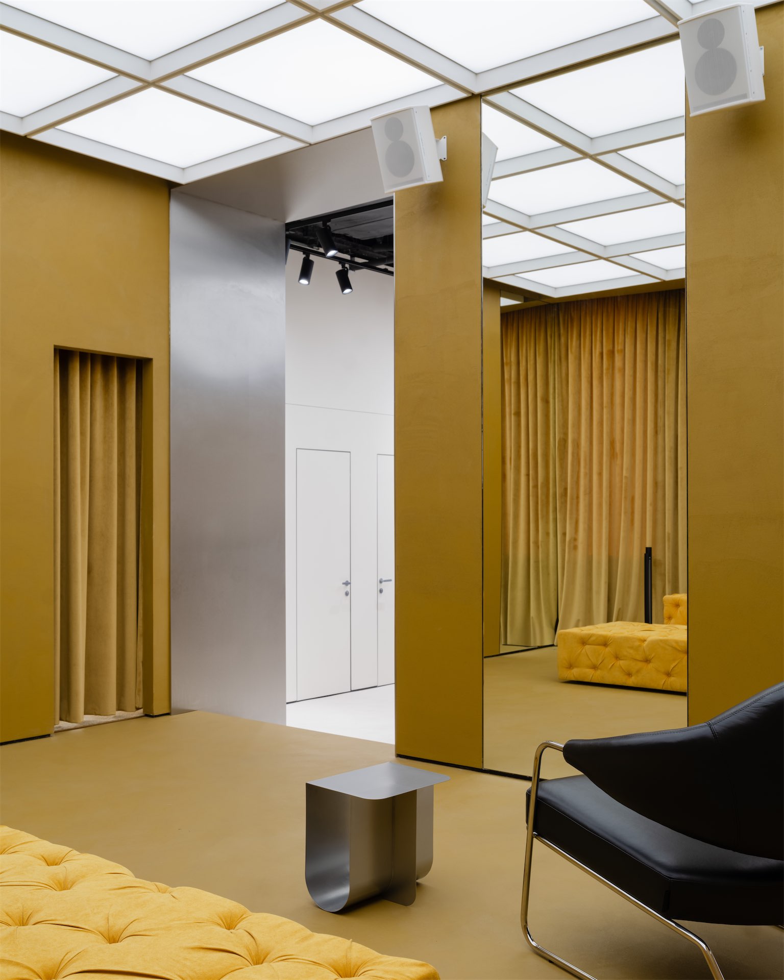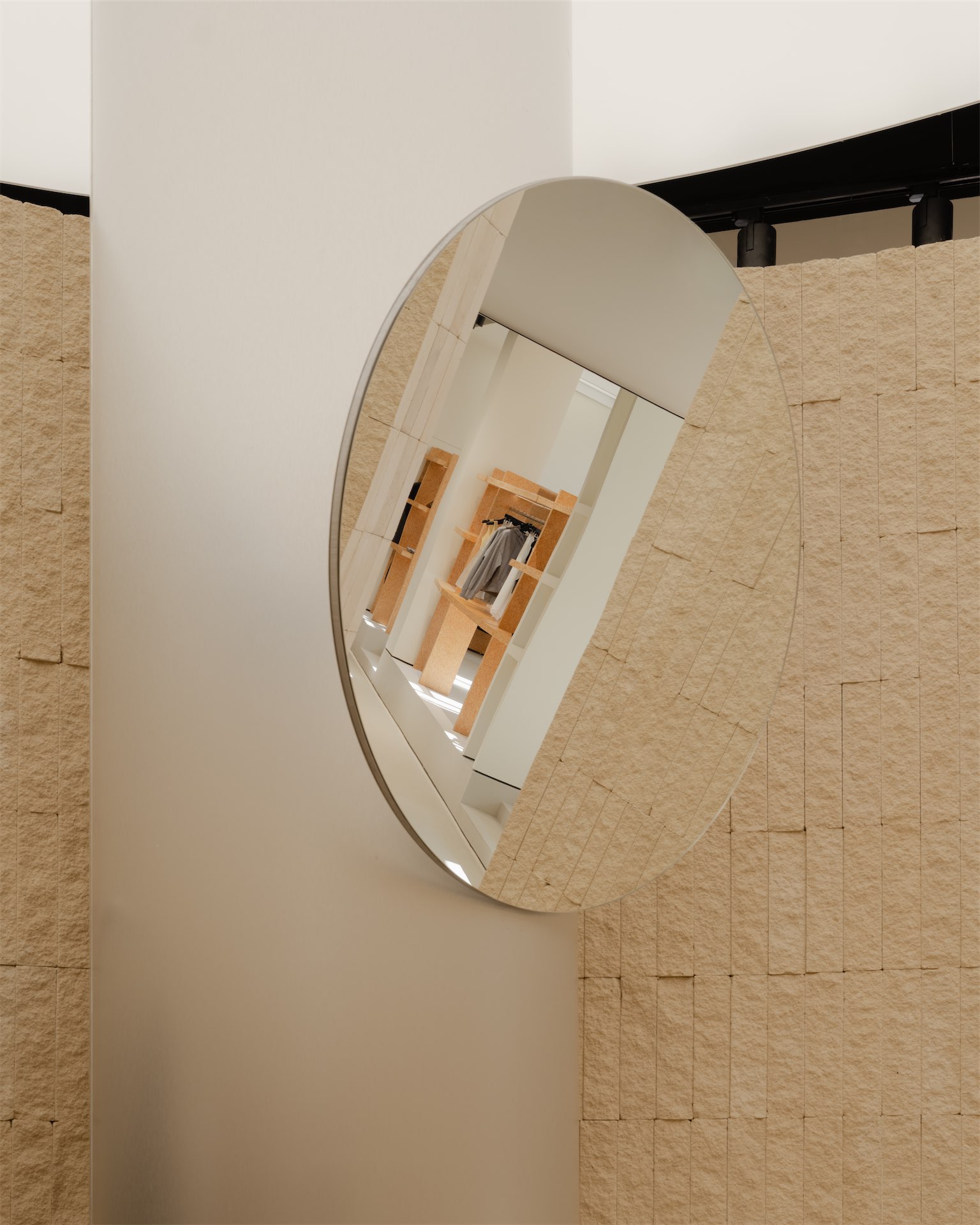 Пространство раскрывается как последовательность двух состояний. Первая зона — светлый «квадрат» с рыжеватыми полками из дубового шпона и полукруглой перегородкой, за которой скрываются рейлы. Вторая — более камерная «мягкая» комната с примерочными, бархатистыми кулисами и диваном; внутри команды ее называют лаунжем, отсылая к будуарной эстетике бренда.