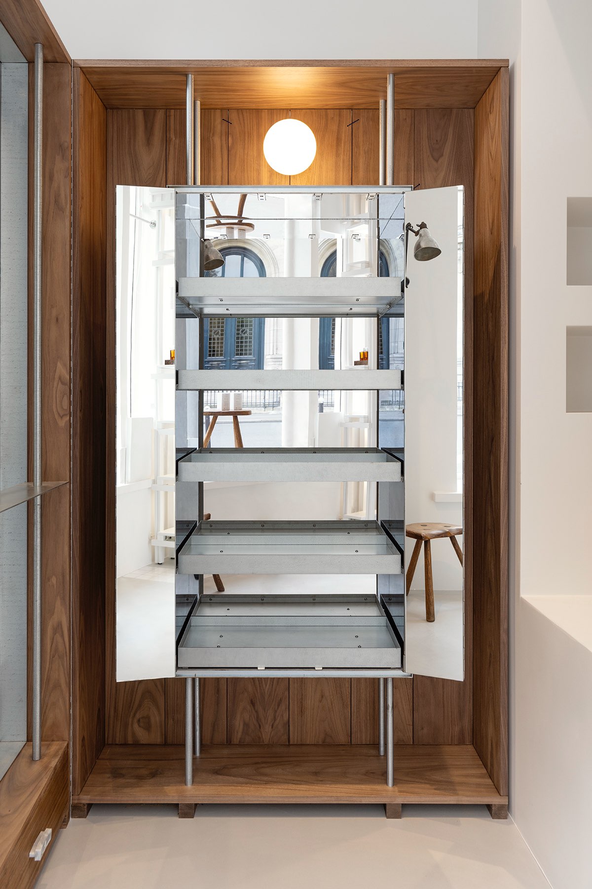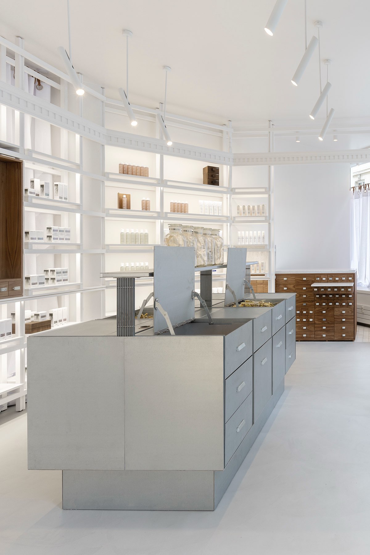 Пространство компактно и организовано как последовательность функциональных зон. Система стеллажей с тонкими профилями акцентирует внимание на продукте, центральный стол отсылает к лабораторной эстетике, а встроенный модуль для макияжа интегрирует косметическую линию в общий сценарий движения. Большие витрины обеспечивают естественное освещение, усиливая ощущение прозрачности и чистоты.