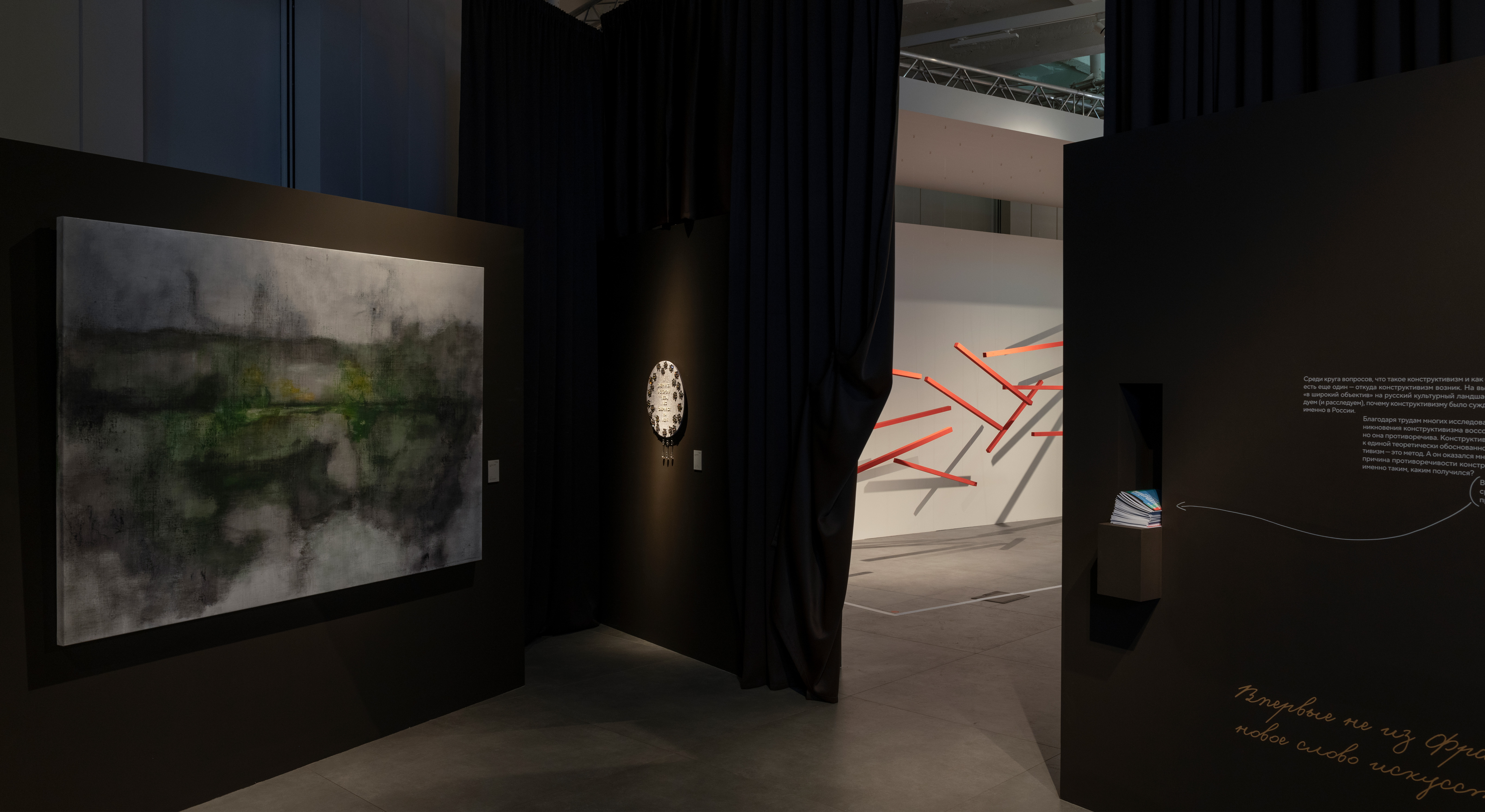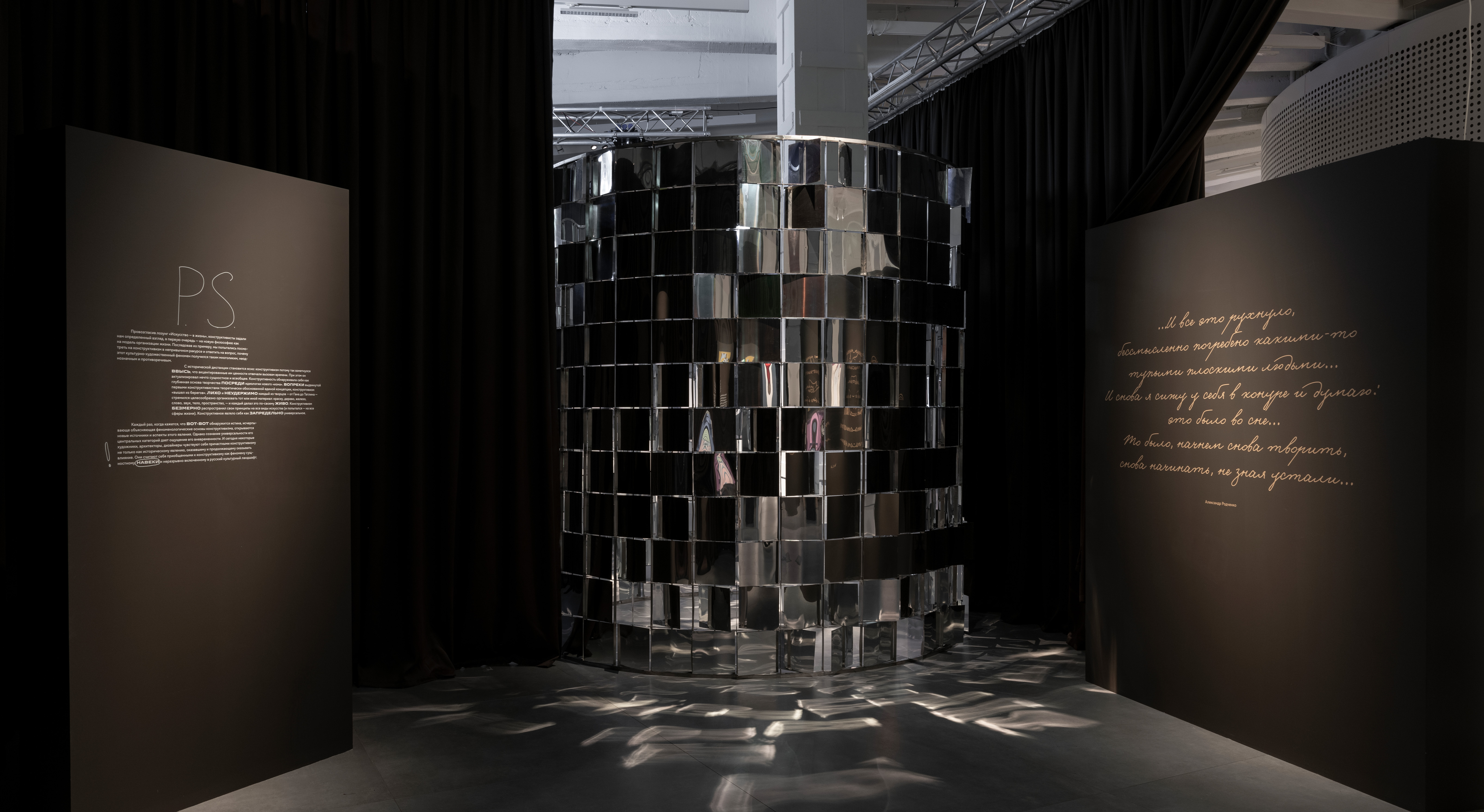 М. К.: Моя самая любимая часть — начало выставки, там, где посетителя встречают парящие буквы названия на фоне огромных черных штор. Архитекторы выставки очень здорово придумали этот ход. Это как вступительные титры фильма: ты еще не знаешь, что ждет впереди, но уже пробуждается интерес.