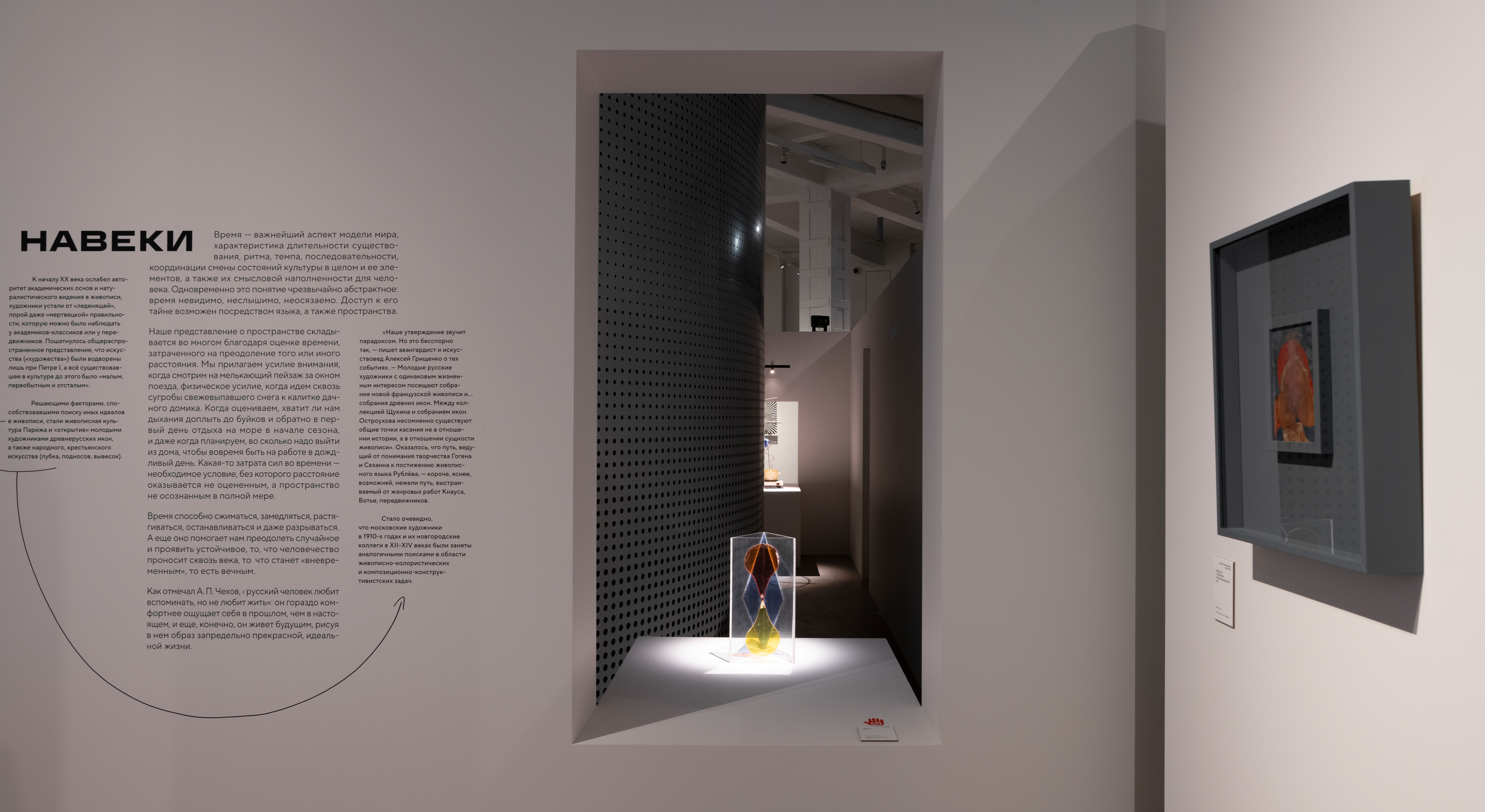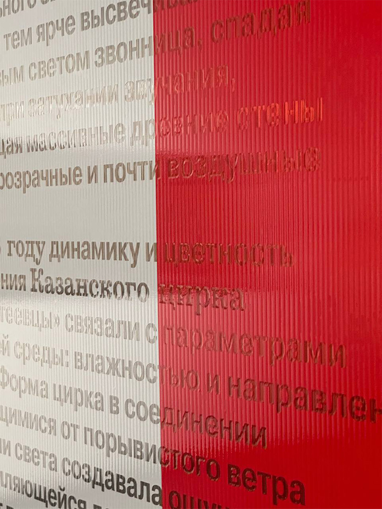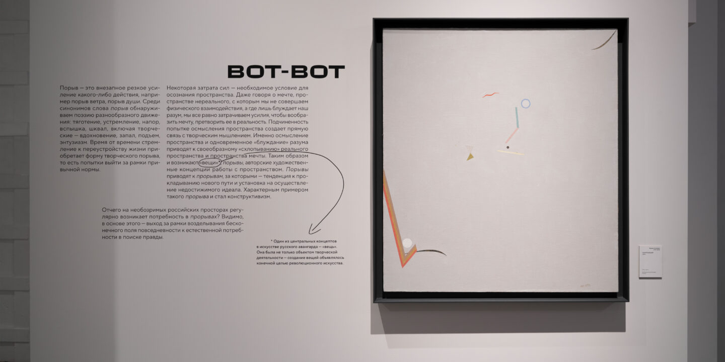 М. К.: Это главная метафора архитектуры выставки — где за каждым поворотом, стеной и в каждом «простреле» ждет новое. Эта идея послужила также отправной точкой для верстки экспозиционных текстов. Мы составили разные композиции из блоков текста и добавили навигационной графики, чтобы у посетителя сохранялся интерес в них разобраться и прочитать.