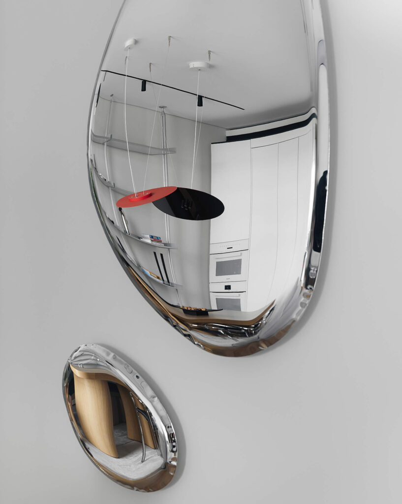 Сбалансированность планировочного решения и общую графичность интерьера разбавляют арт-объекты, светильники необычной формы, деревянные столешницы, придающие пространству квартиры теплоту. Интерьер раскрывается через детали: зеркала, необычные деревянные стулья, причудливые ножки кровати.