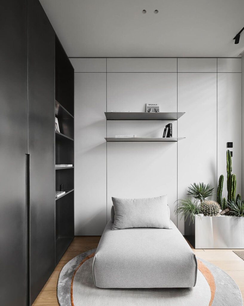 Приватные зоны интерьера — кабинет, спальню и санузел — продолжают сдержанную цветовую гамму и графичность интерьера. В каждой зоне предусмотрен своеобразный «уголок интроверта» — комфортное кресло, обособленное в плане от основной зоны, где можно уединиться и расслабиться.