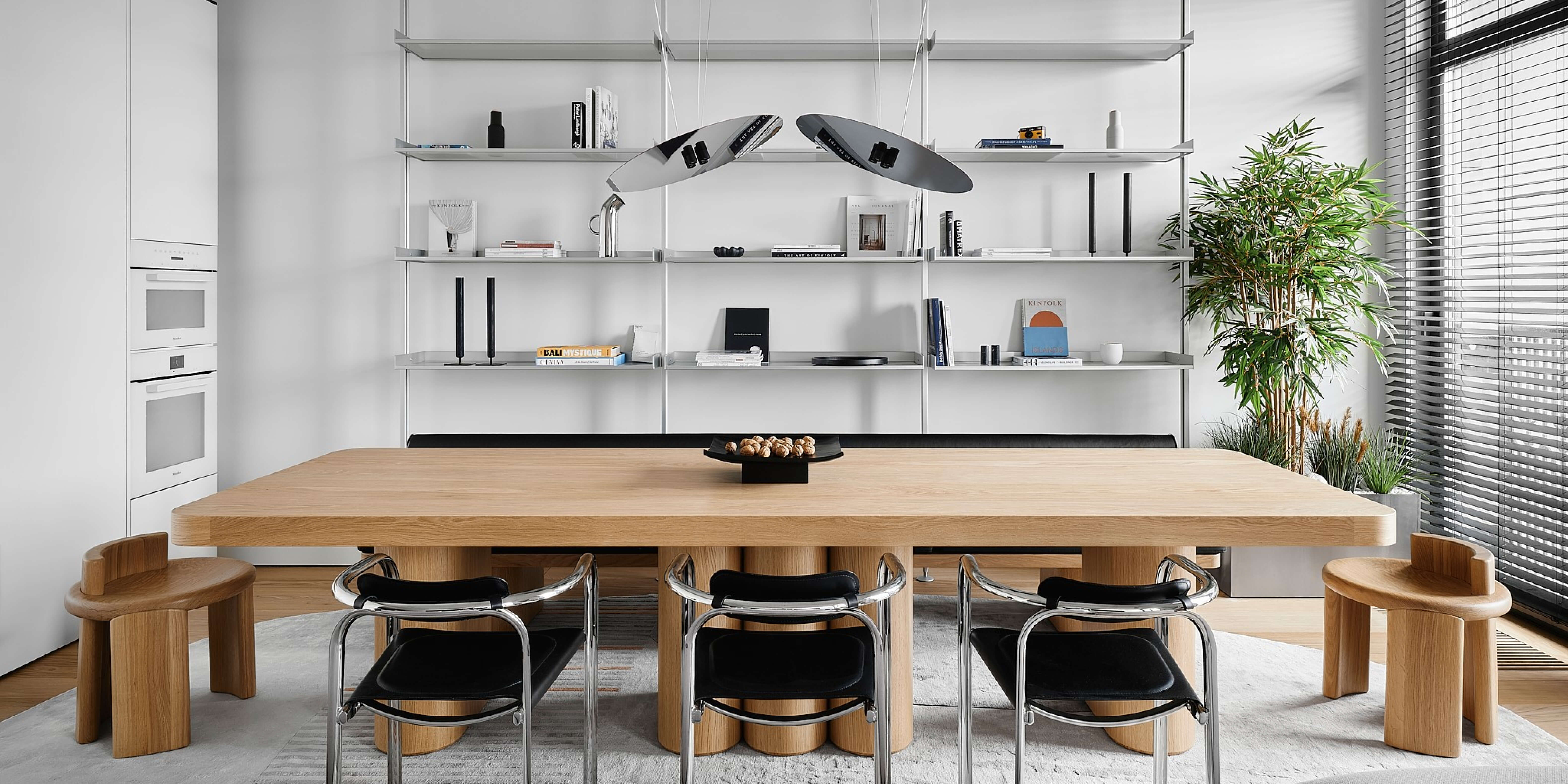 Сердце квартиры — обеденная зона в гостиной. За огромным деревянным столом можно собраться с компанией друзей или устроить кинопросмотр в комфортной диванной зоне. Кухню выполнена нетипично для открытой планировки: она скрыта за специальными раздвижными фасадами, минимизируя визуальный шум, а позади стола установлен большой стеллаж для книг и памятных вещей.