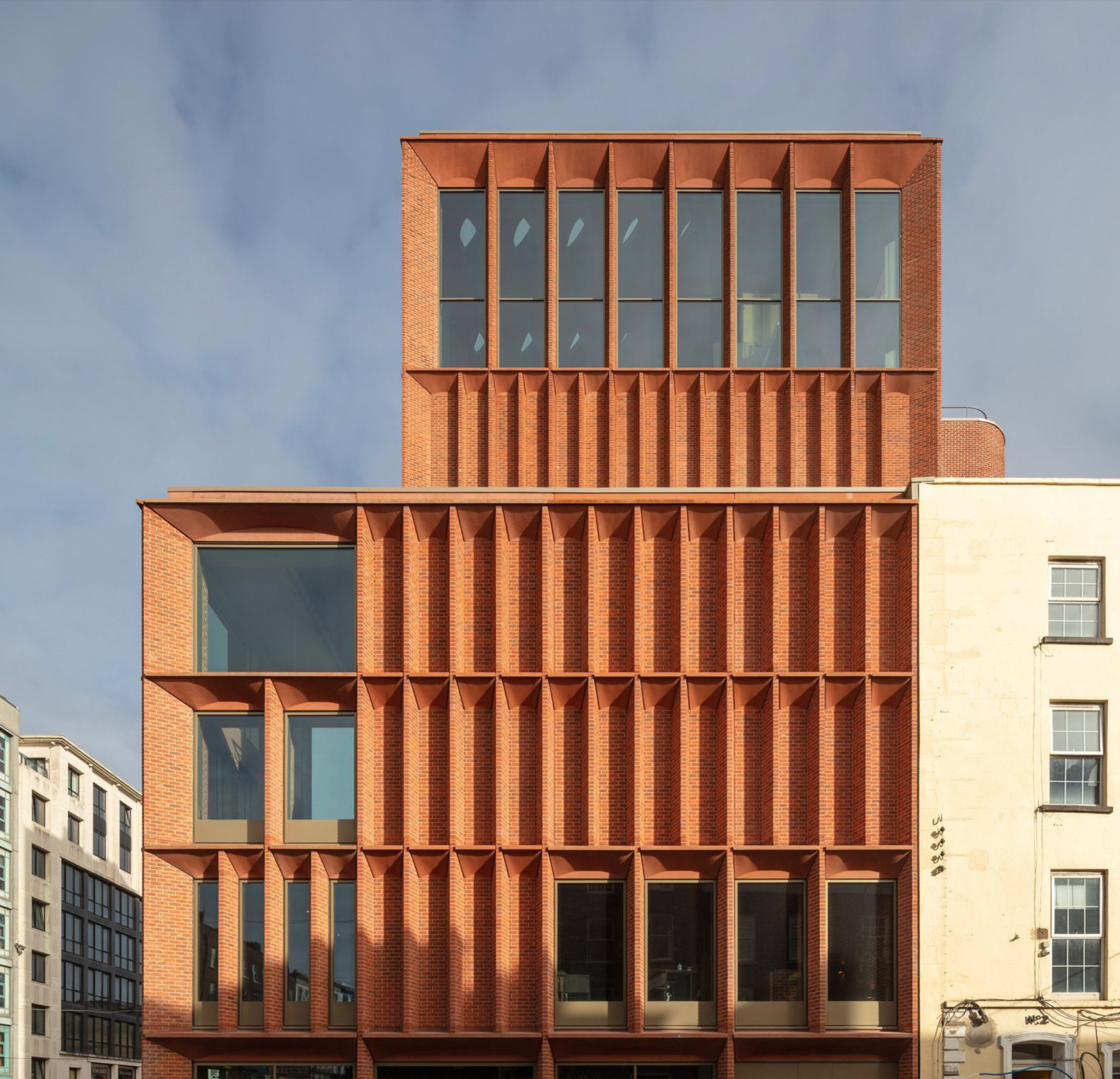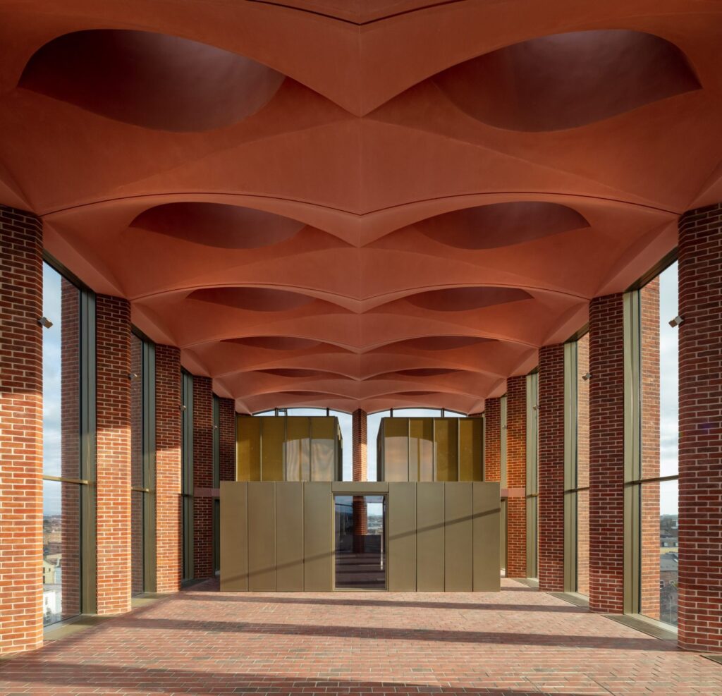 Архитектура выстроена вокруг регулярной сетки кирпичных «дымоходов», которые поддерживают перекрытия, способствуют естественной вентиляции и взаимодействуют с дневным светом, создавая разнообразие пространств от широких читальных залов до уютных ниш у окон.