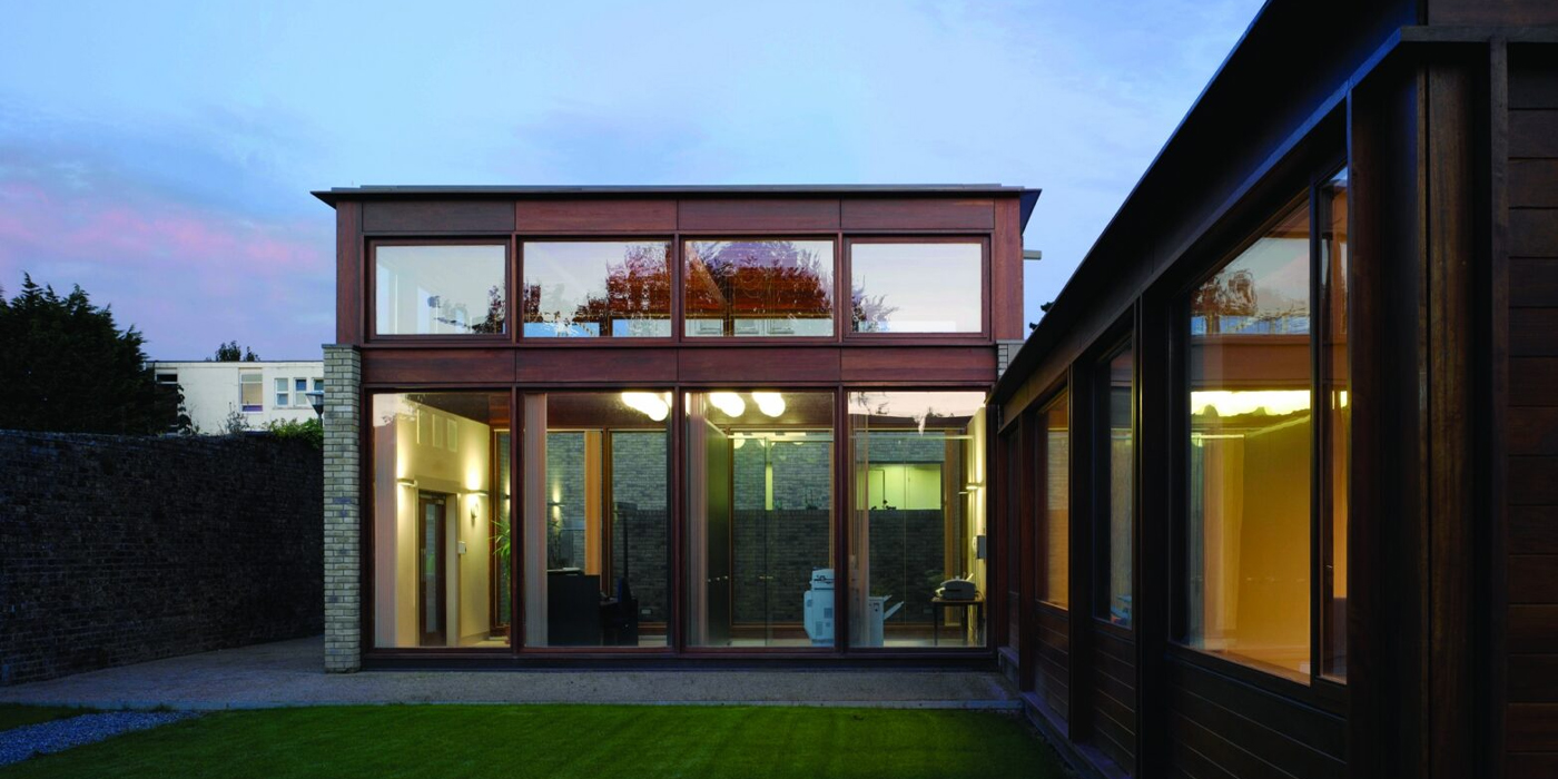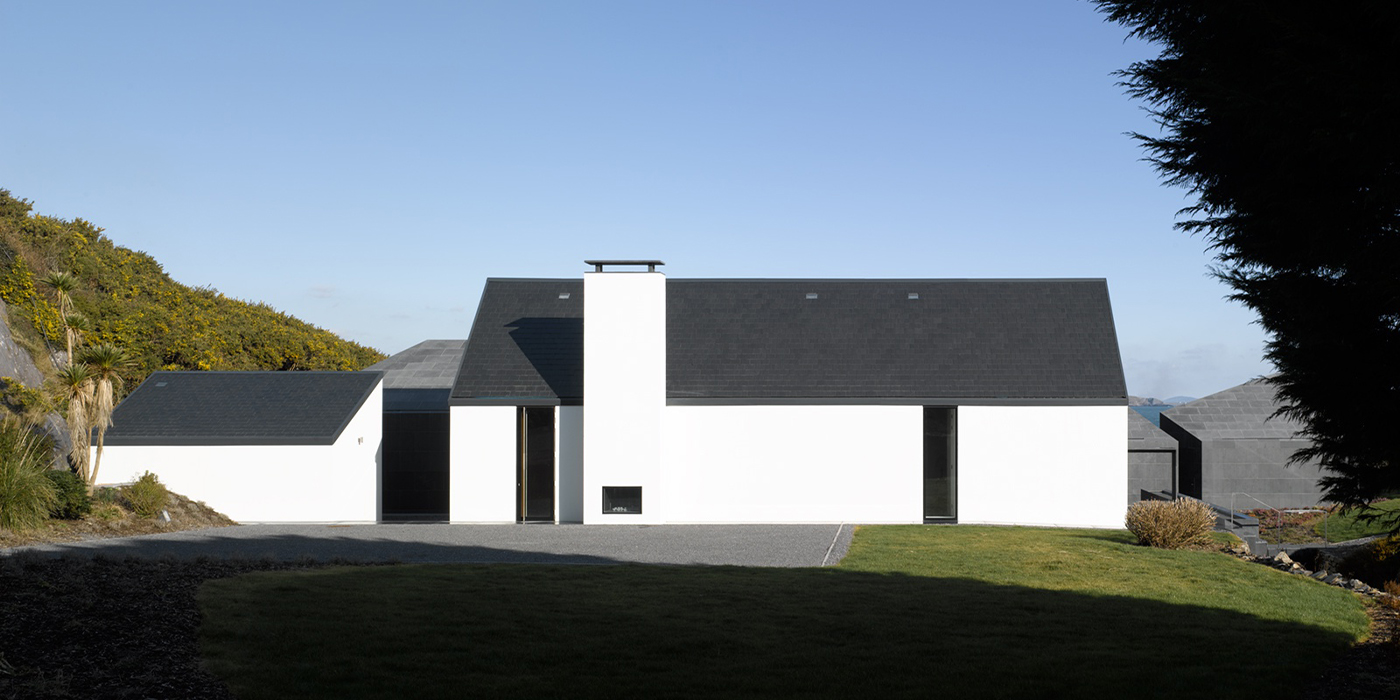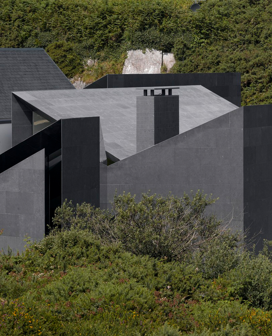 Так, существующий коттедж был сохранен и дополнен новыми многогранными объемами. Фасады облицованы ирландским известняком, который со временем естественно «впитывает» окраску окружающих скал, гармонируя с природой.