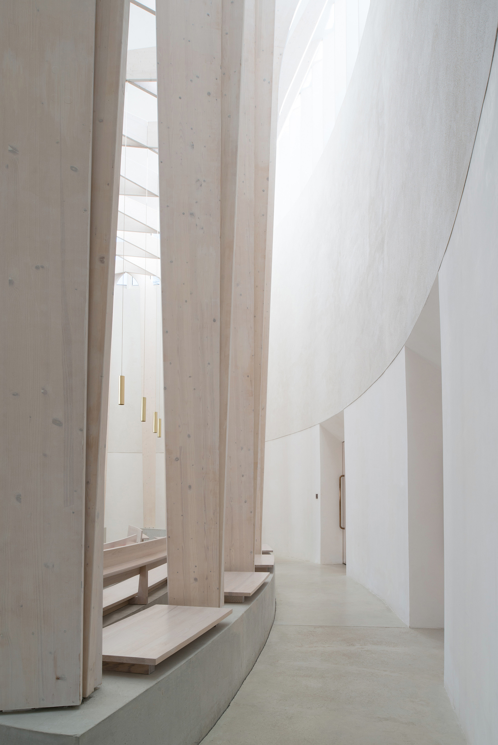 Интерьер перекрыт конструкцией из клееных деревянных балок, создающей ощущение светящегося купола.