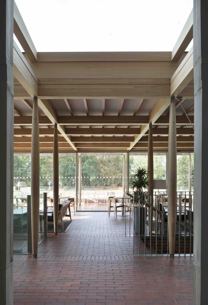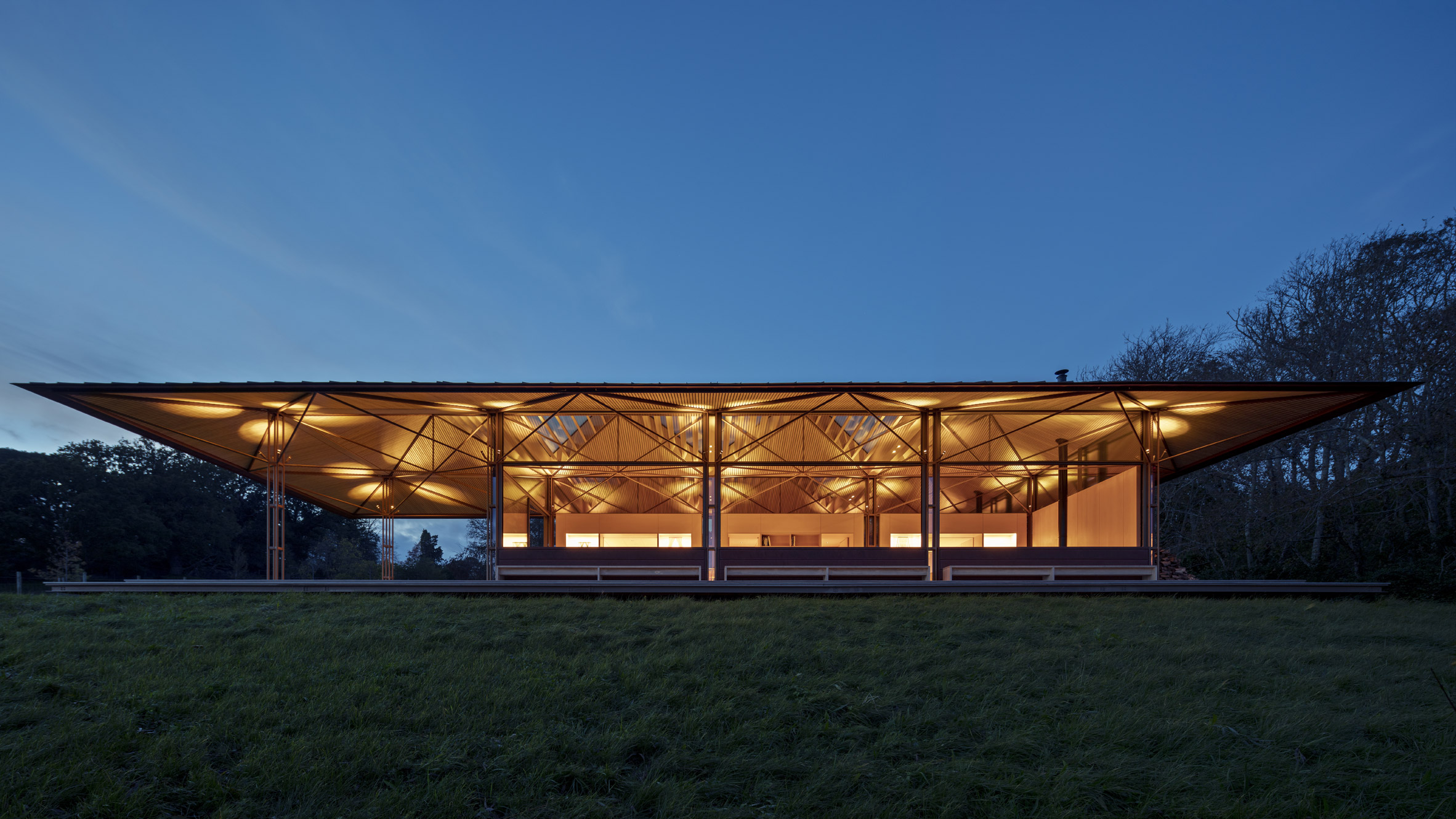 В основе конструкции — регулярная сетка стальных колонн, поддерживающая пирамидальную крышу, накрывающую весь объем здания. Каркас окрашен в теплый золотой цвет, а крыша облицована медью, перекликающейся с оттенками луга и болот рядом. Большие панорамные окна призваны стереть границу между интерьером и окружающим ландшафтом.