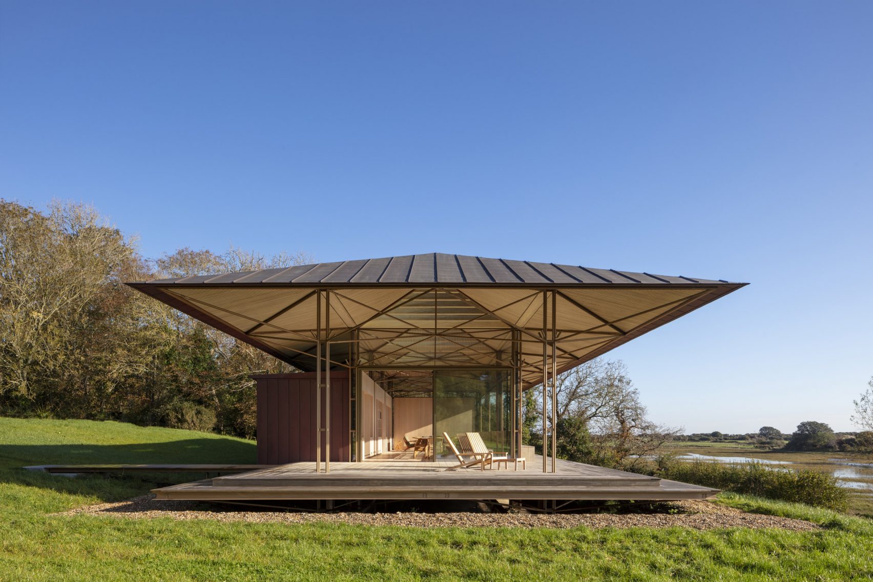 Легкий павильон с акцентированным стальным каркасом «плывет» над зеленым берегом залива Бембридж.