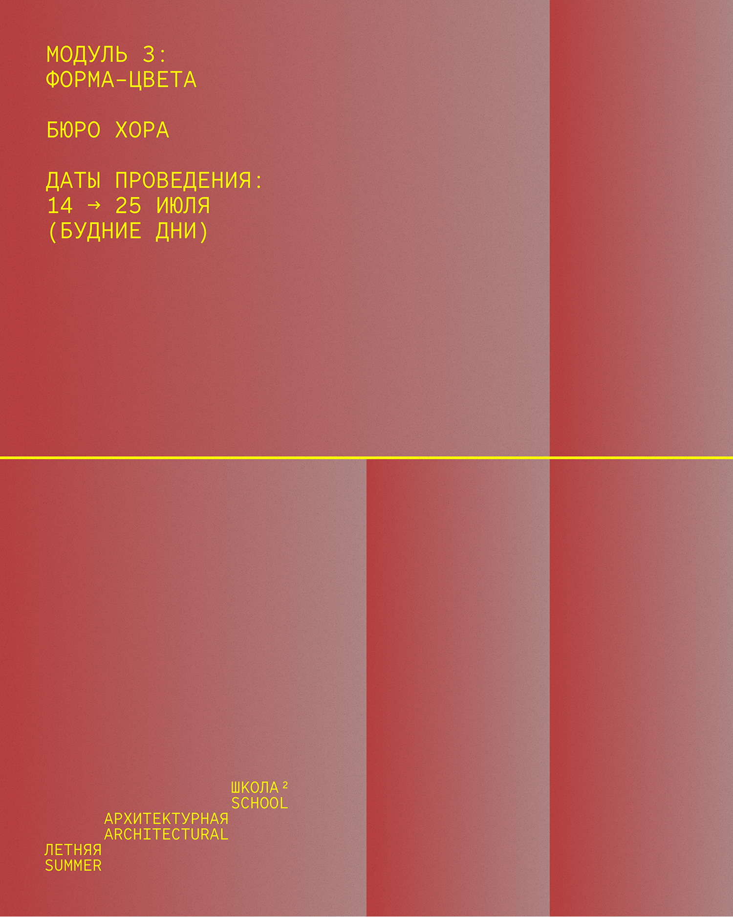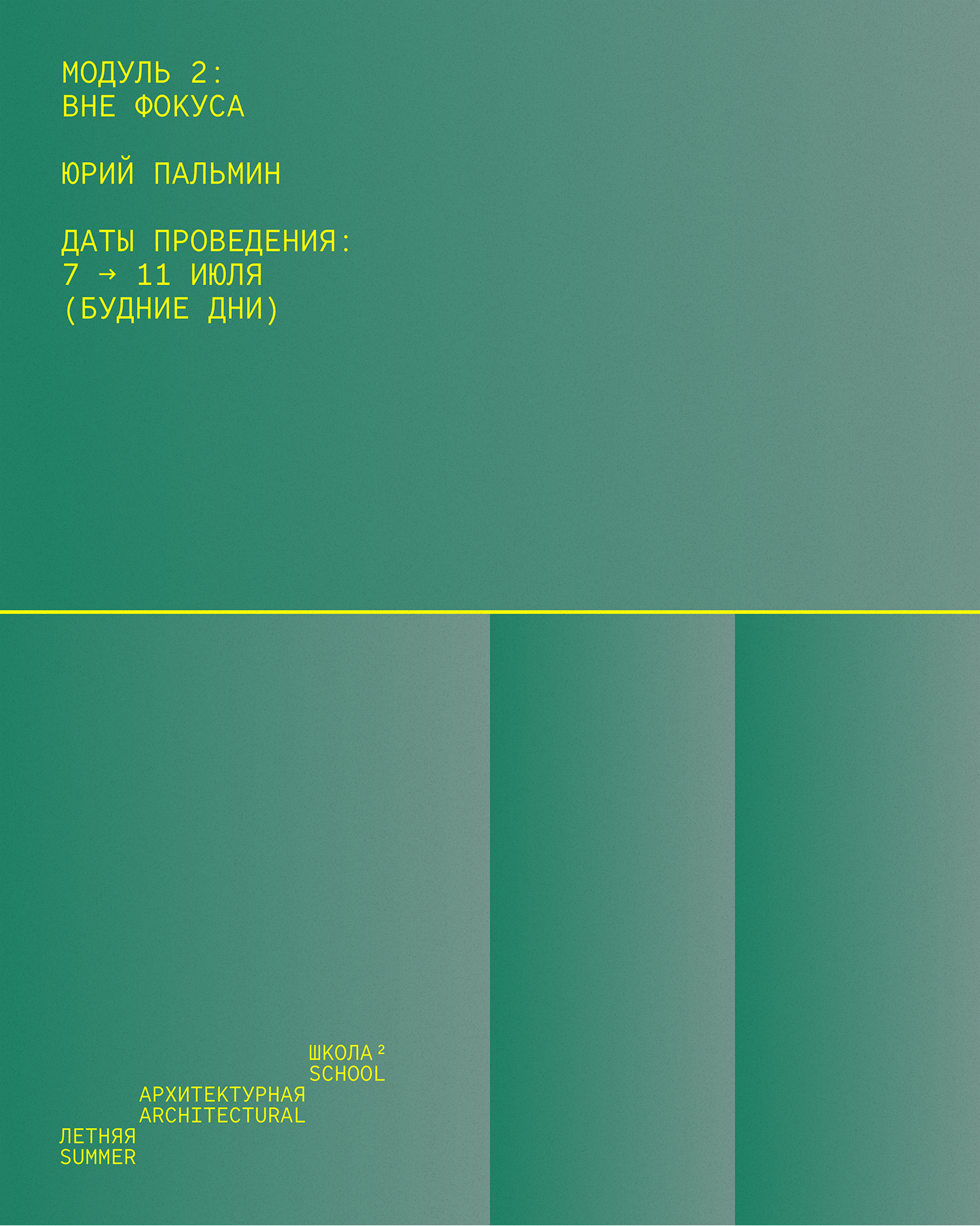 - На модуле «Вне фокуса» Юрия Пальмина участники отойдут от привычного взгляда на архитектуру и исследуют цвет через медиумы фотографии, видео и живописи, создавая ситуации, в которых архитектура теряет форму, а цвет приобретает телесность и вес.