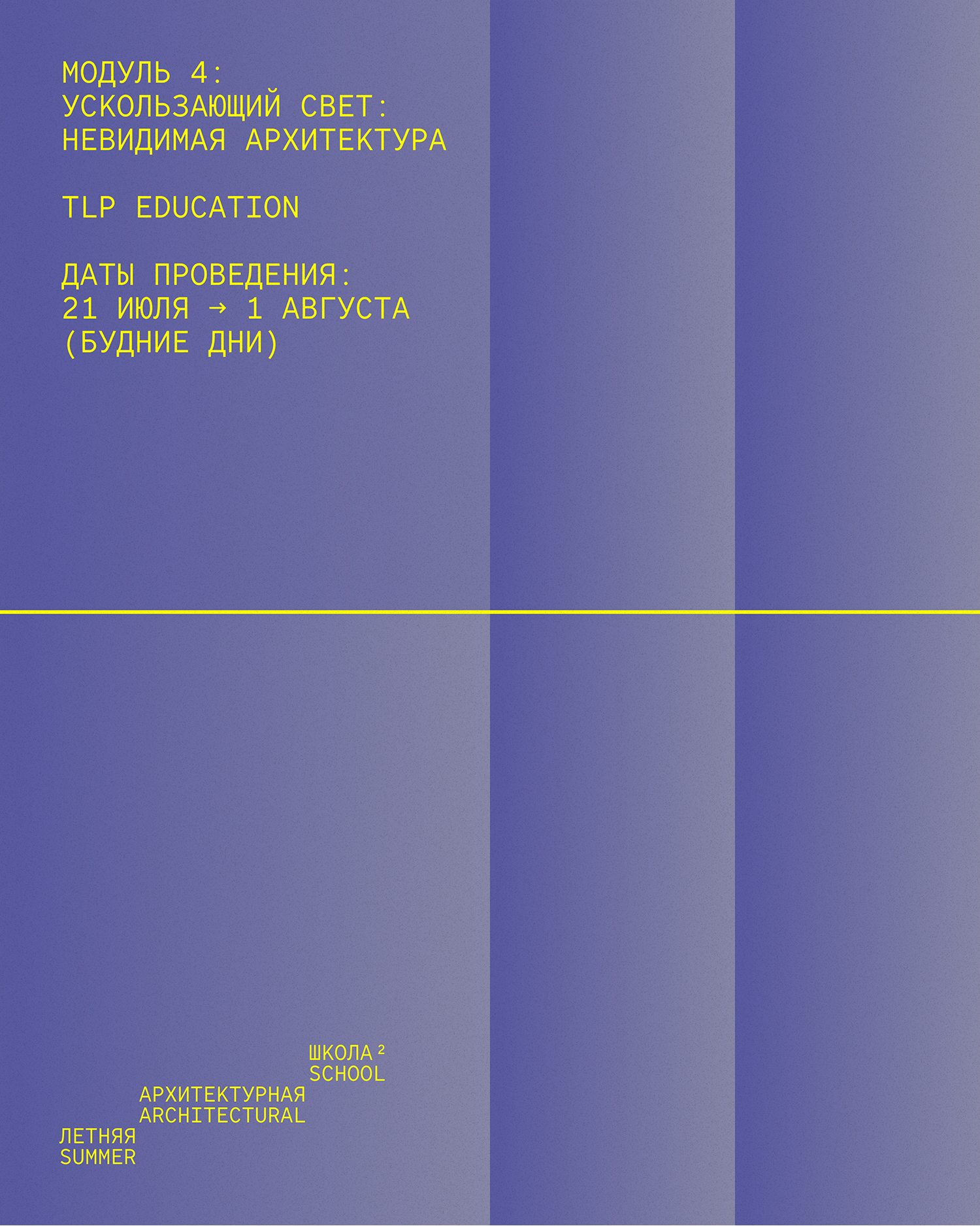 - Кураторы TLP Education в модуле «Ускользающий свет: невидимая архитектура» предложат с помощью графических практик и наблюдения через видео взглянуть на цвет как на событие. Участники будут улавливать оттенки в движении света, теней, объектов и тел, чтобы через камеру собрать собственную калейдоскопическую картину города.