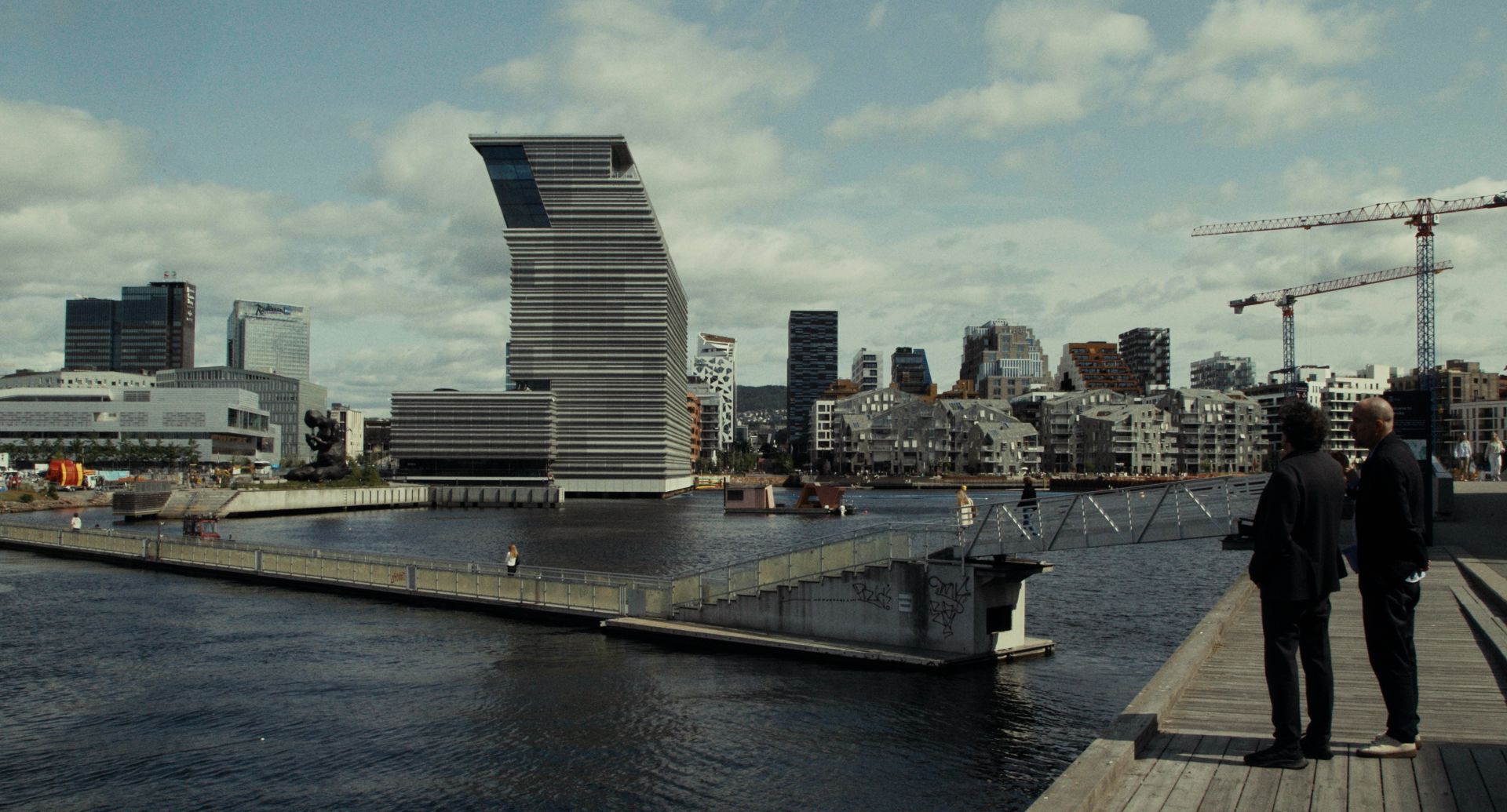 Фильм не столько рассказывает о здании, сколько показывает, как оно становится частью городской экосистемы: взаимодействует с набережной, перекликается с полотнами Мунка, отражает небо, вписывается в контекст.