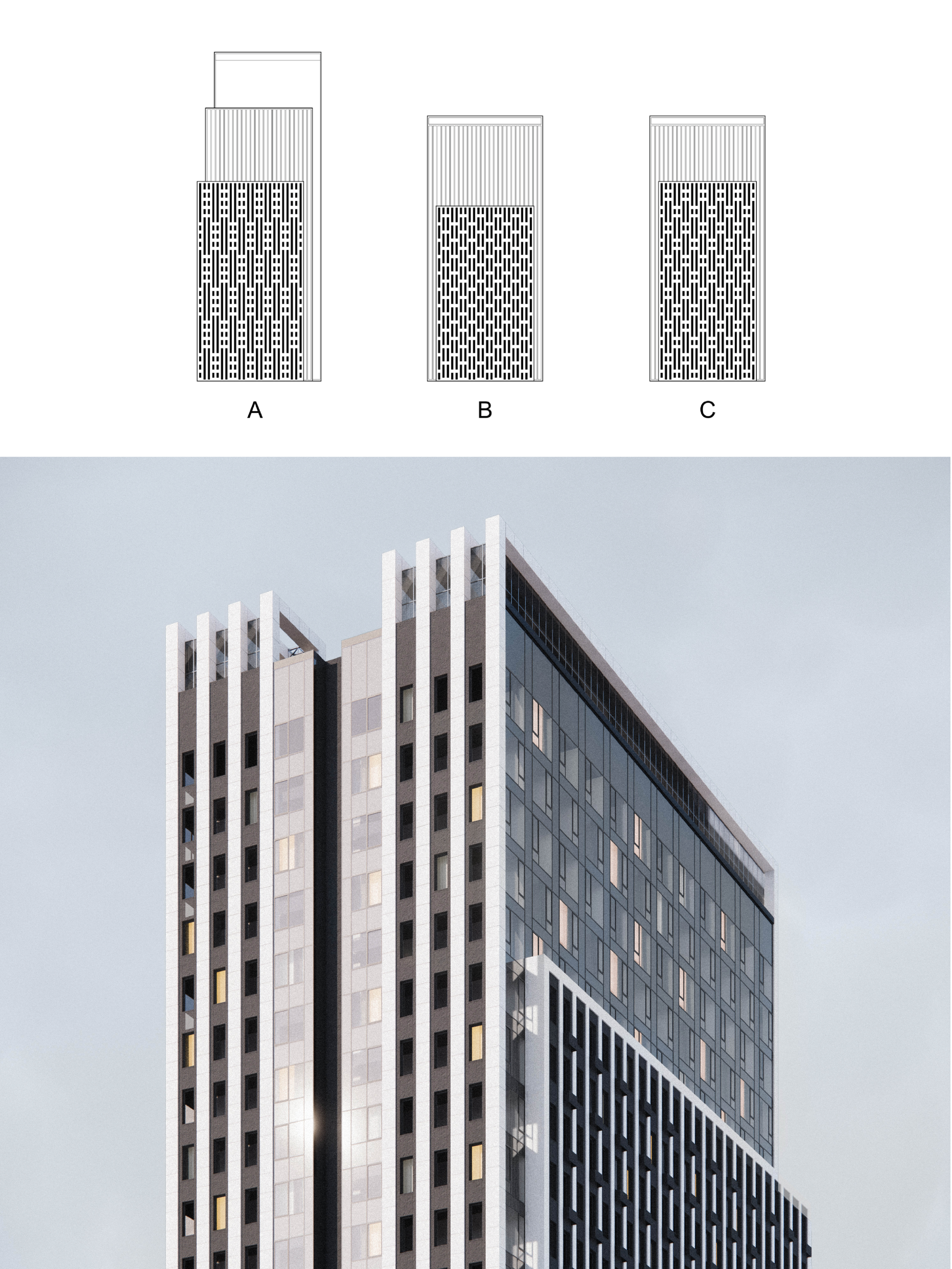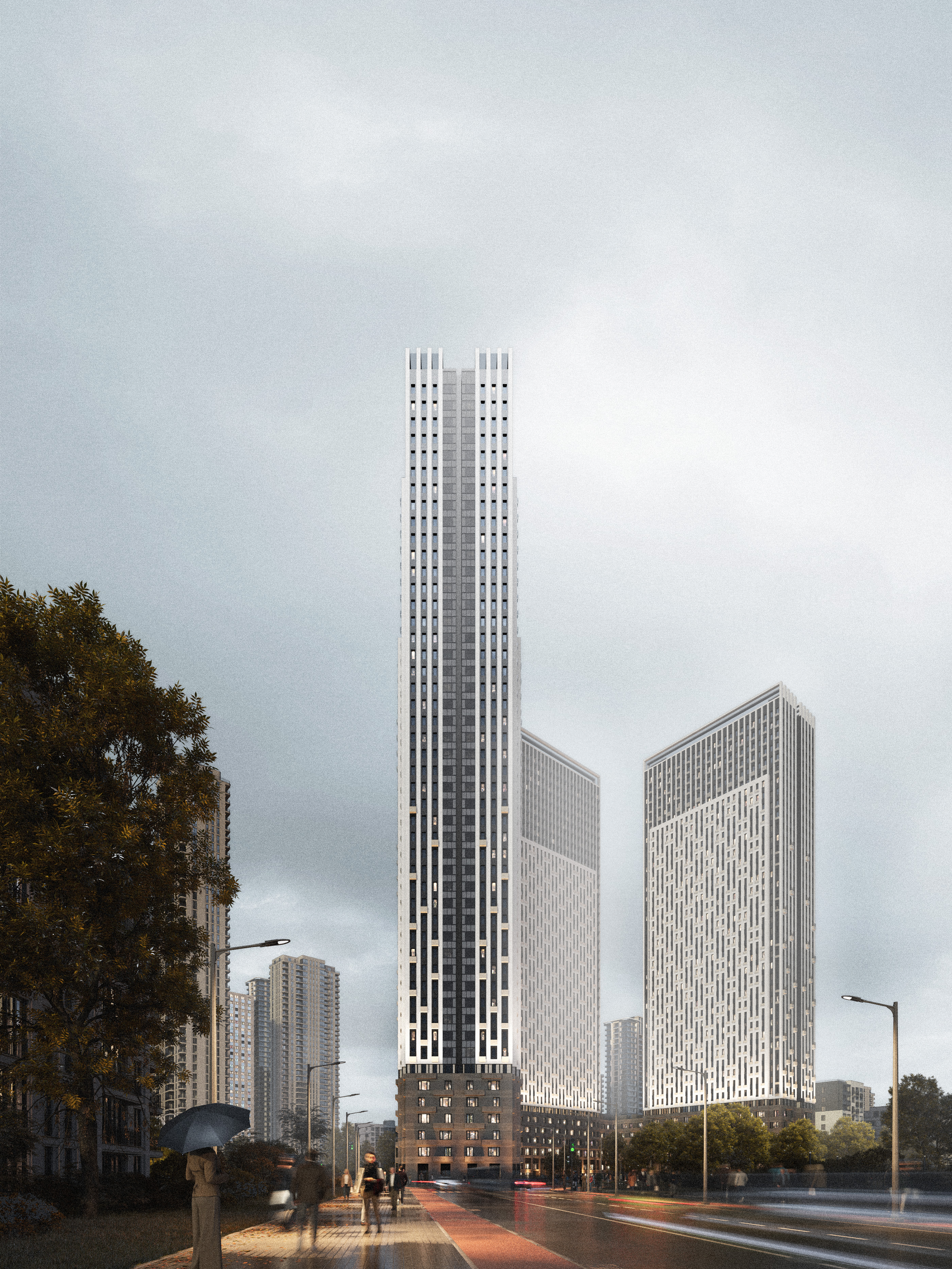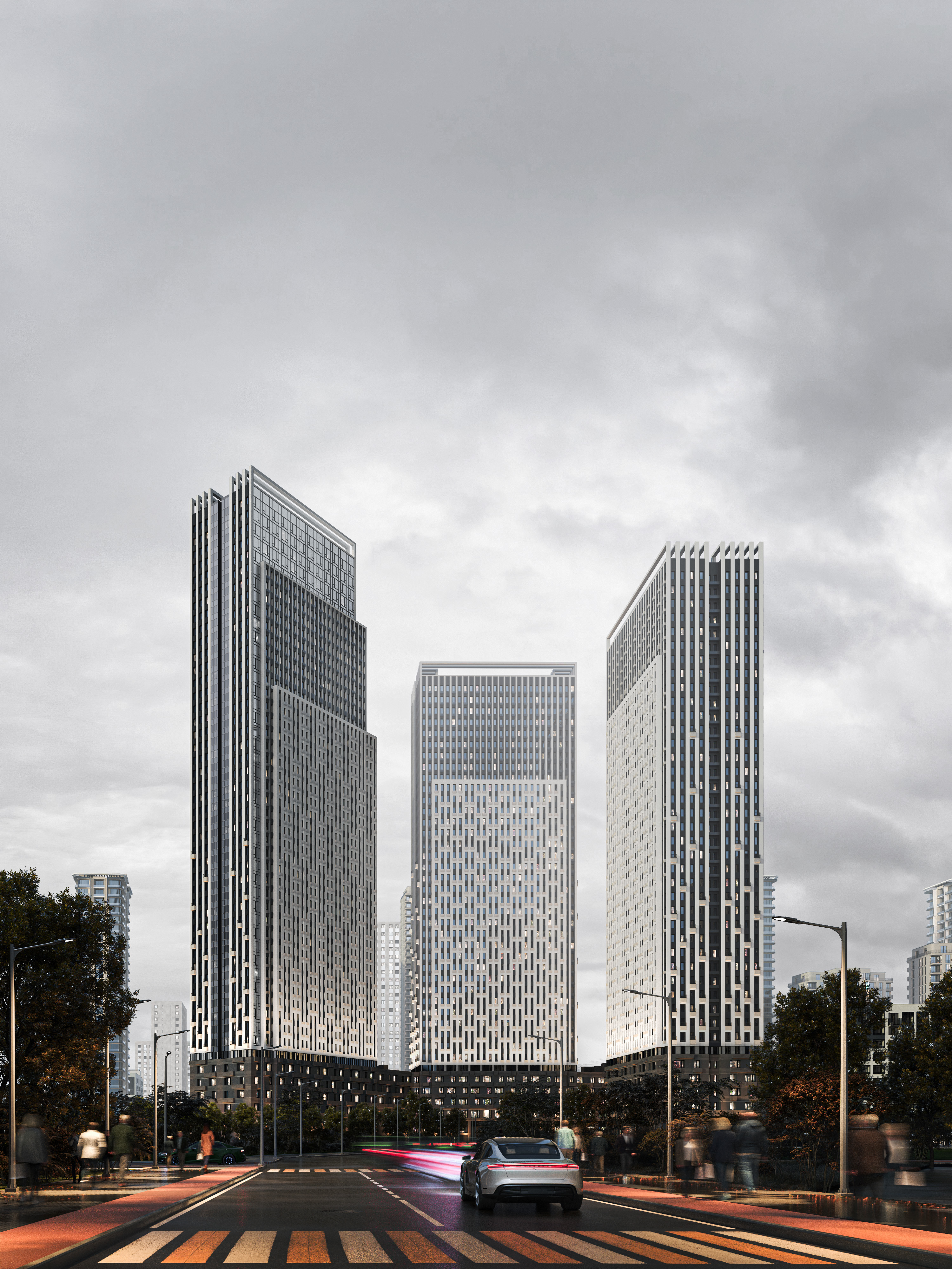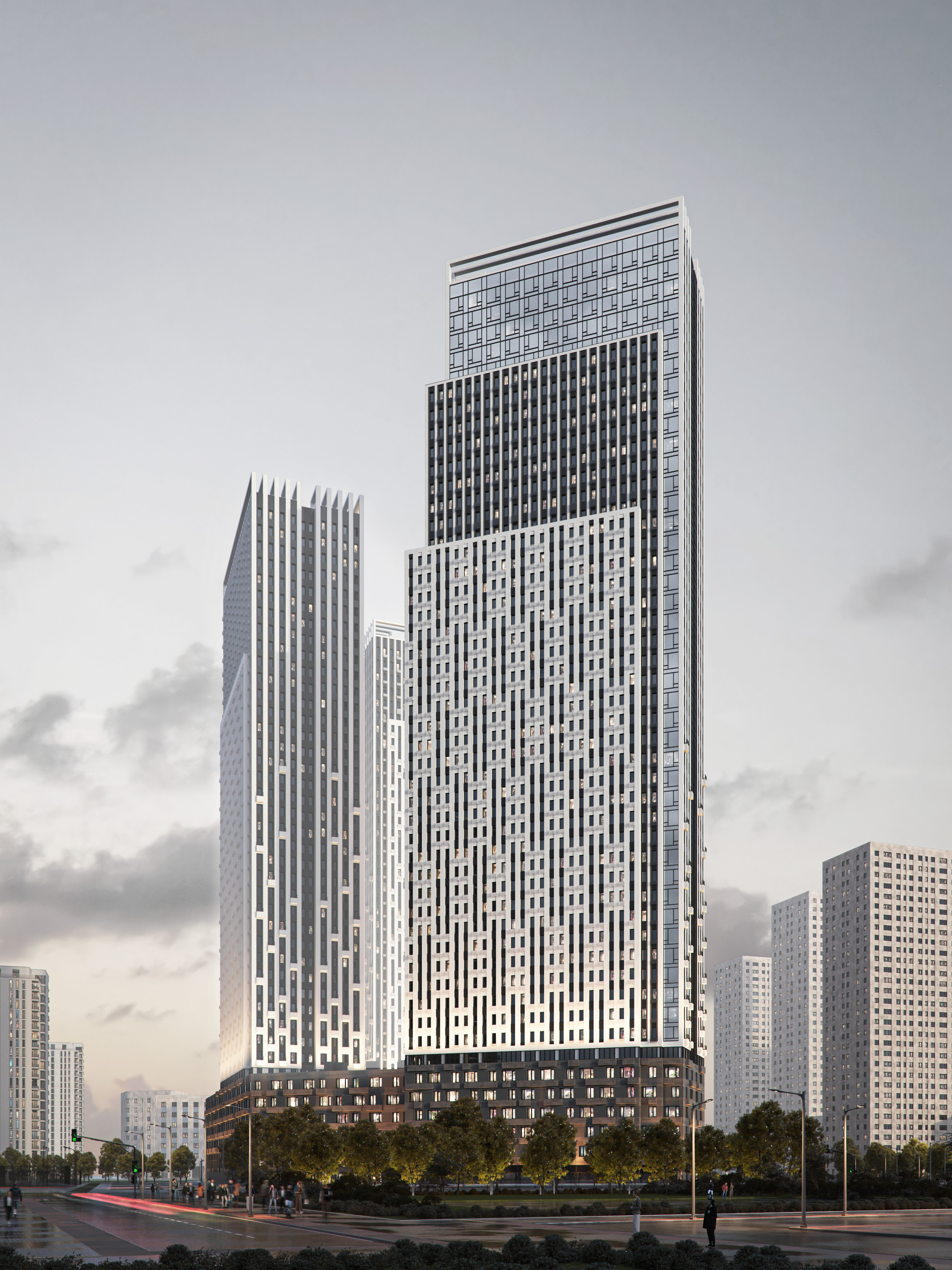Д. С.: Создавая минималистичный и строгий образ, мы стремились сделать его разнообразным для восприятия с разных ракурсов: с улицы, в рамках городской перспективы, с балкона –  когда смотришь, например, на кровлю стилобата. При таком взгляде нам важно работать с архитектурой как с неким фракталом. Продумывая общий образ, прокручивать его на следующий уровень, дорабатывать, разбирать детально, пока не достигнешь мельчайшей картинки. Это напоминает процесс, когда из большой горной породы сначала высекаются крупные формы, а затем происходит нюансная работа с мелкими тонкими деталями. Поэтому мы по-разному работали со стилобатной частью, которая рассчитана на восприятие смотрящим с улицы человеком, и высотными башнями, которые обращены в город, где нами особо подчеркнуты и акцентированы их торцы.