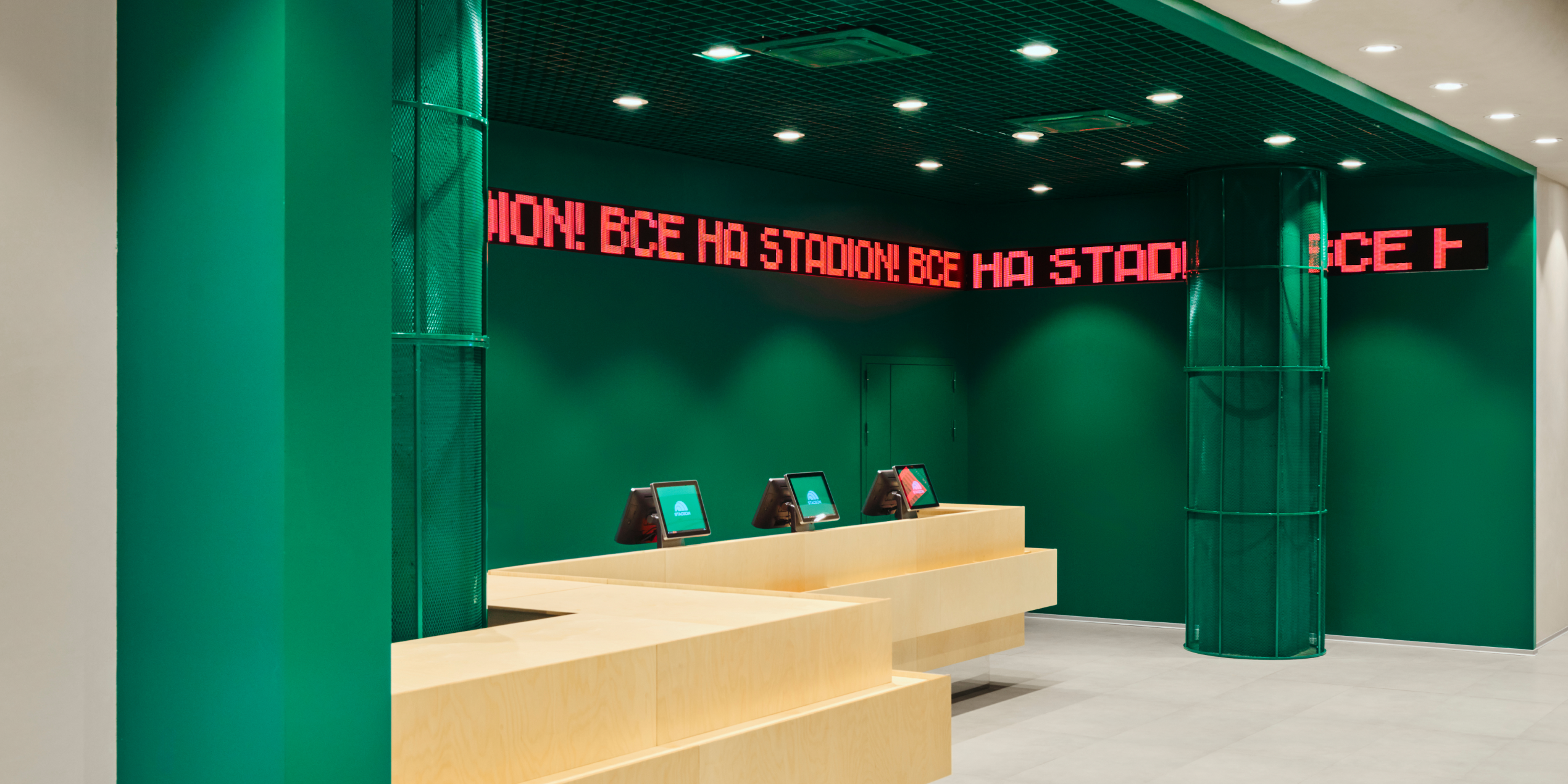 Как это часто бывает, заказчики пришли с запросом на большие эффектные экраны. Но экраны требуют контента: качественно сделанного и постоянно обновляемого. В итоге мы сделали ставку именно на гипсокартонные объемы, а экраны расставили только в ключевых точках. Очень хорошо вживую работает бегущая строка на кассе.