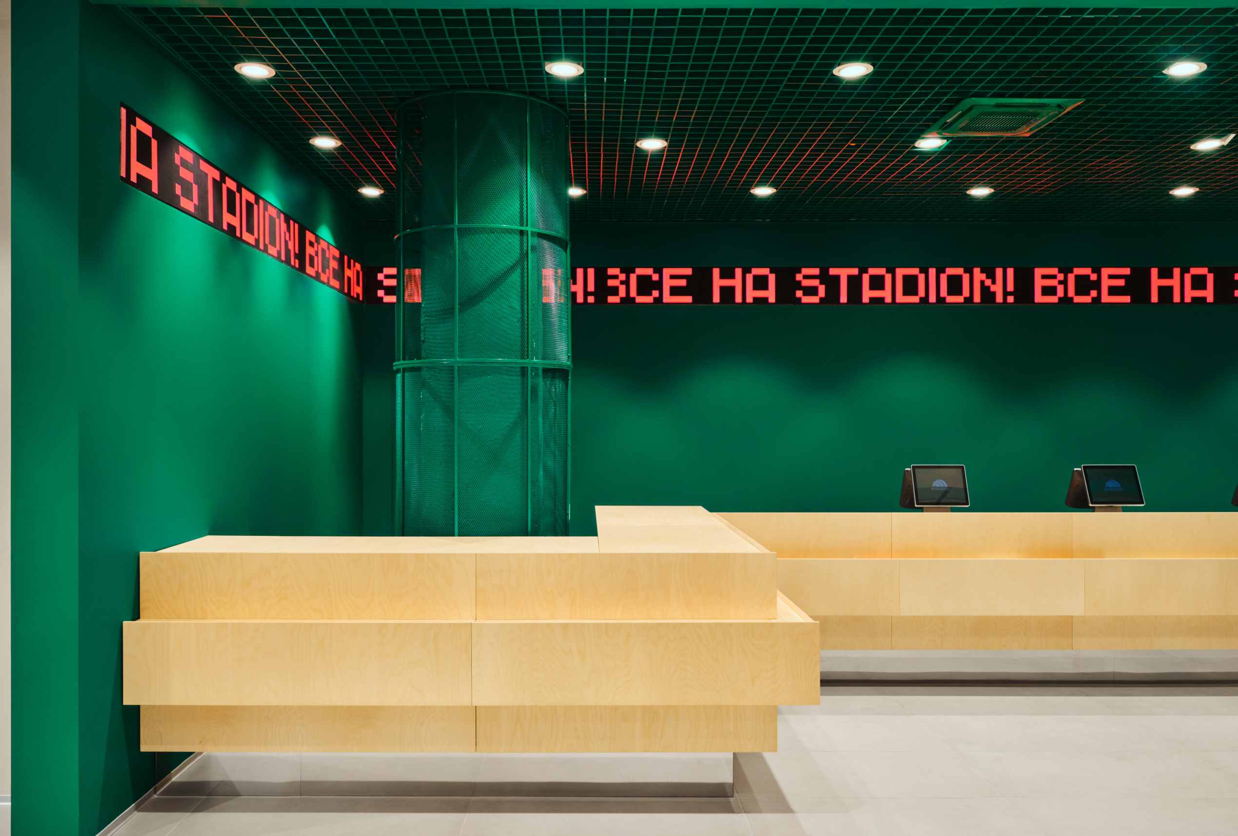 Самым удачным решением стали объемы, сделанные из простого гипсокартона. Они создают отсылку к большим стадионам и зонируют пространство. При этом этот прием в масштабе проекта практически ничего не стоит.