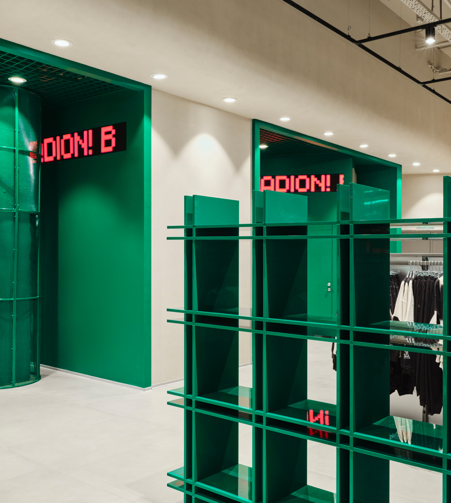 На самом деле, бюро поставило себе очень амбициозную цель: перепридумать то, как должен выглядеть спорт сейчас, в эпоху когда никто уже не готов «становиться лучшей версией себя». Что такое спорт в 2024-м, после «черных лебедей» и встреч в зуме? «Мы подумали, что современный спорт — это больше про экологичное встраивание в жизнь. Если посыл Nike и Adidas последние 10 лет был очень агрессивным, темные контрастные сочетания, яркие акценты, то сейчас хочется чего-то более спокойного и тихого. Архитекторы пришли к спокойной серо-бежевой гамме, добавив ярких цветов из брендбука марки. Мы использовали в отделке ритм, так как это упорядочивает большое количество товара и позволяет создать спокойствие в восприятии.