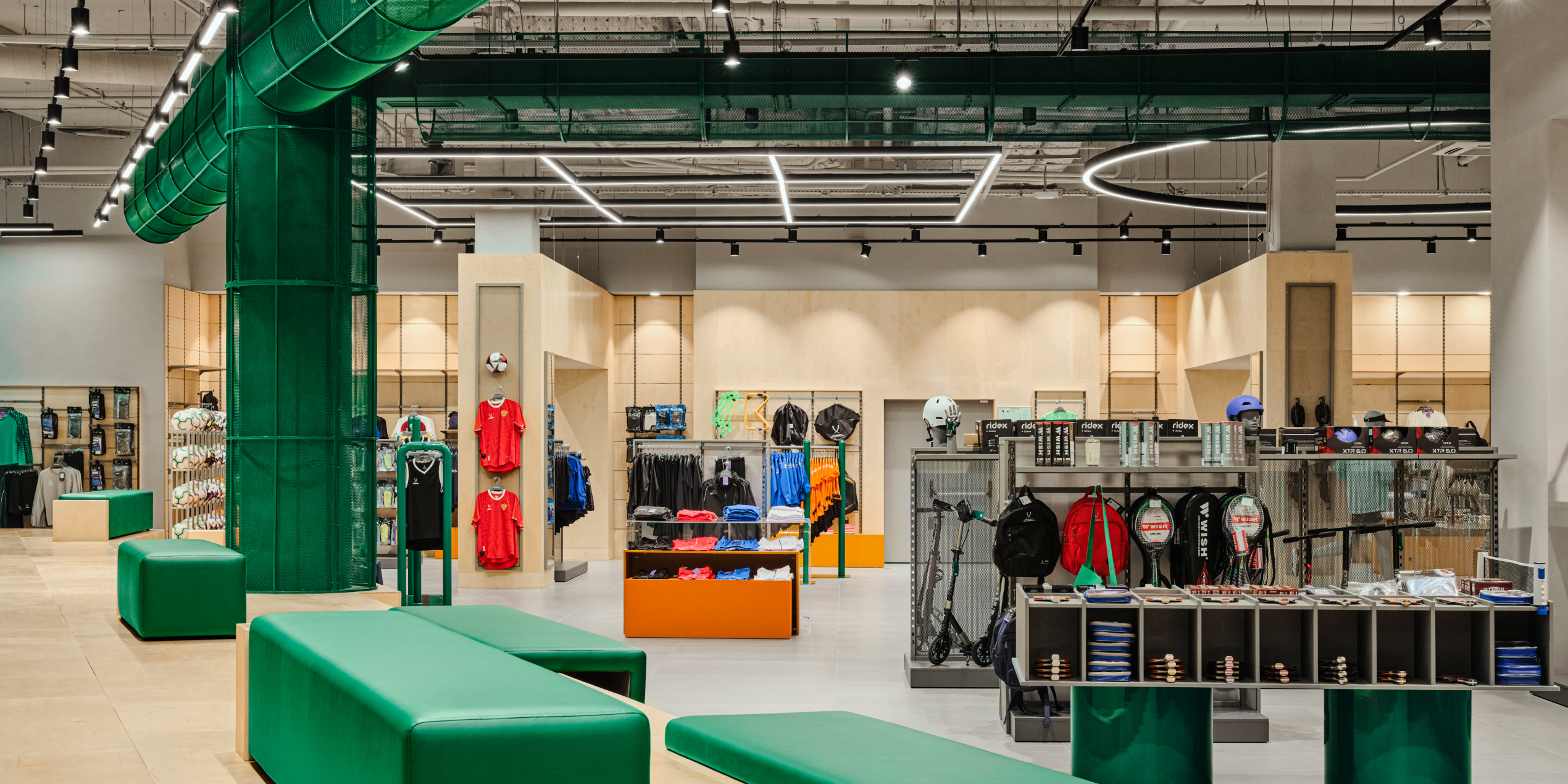 Яркое сочетание зеленого и оранжевого было заложено в брендбуке, а вот сделать фон нейтральным была идея архитекторов. Темные цвета в пространстве воспринимаются либо как премиум, либо ассоциируются с привычными тренажерными залами. Мы же хотели создать атмосферу, которая была бы противоположной — атмосферу библиотеки, городской площади или зала для йоги. Зону кассы решили выделить цветом, так как это важнейшая точка контакта с покупателем. Опуск потолка из-за инженерных систем архитекторы превратили в мощный «плюс», погрузив посетителя в цвет. Все торговое оборудование мы проектировали как элемент сторителлинга: в проекте есть маты для гимнастики, узнаваемые рейлы со спортивной площадки. Касса должна была напоминать спортивные «козлы» из школьного спортзала, но переделав ее, мы сделали гораздо больше места для допродажи: углубления позволяют расставить все мелочи, которые мы забываем взять в магазине.