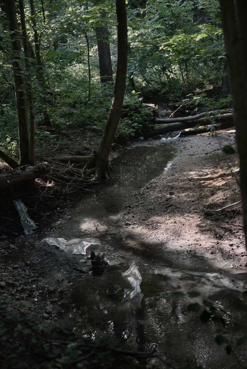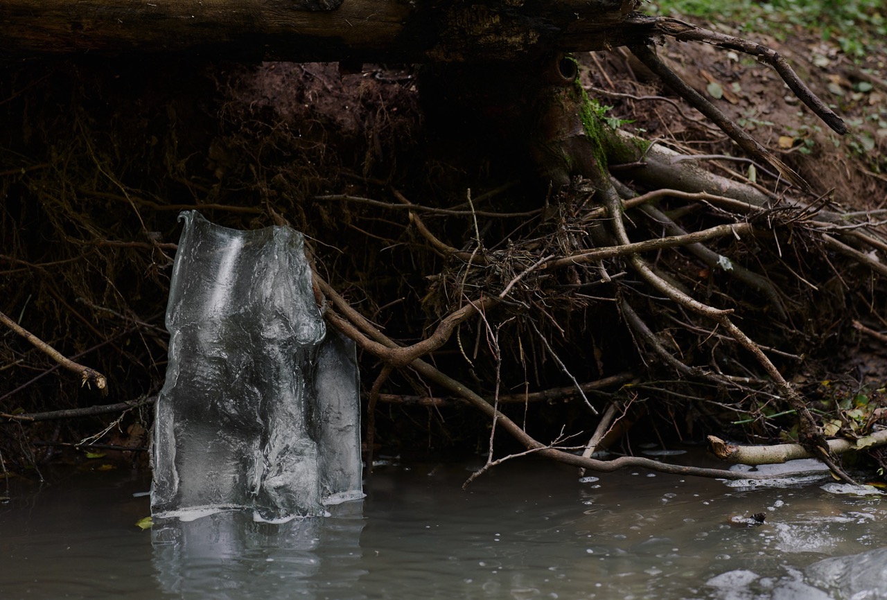 В этом году мы участвовали в художественно-терапевтической тропе в Горках Ленинских — пешеходном маршруте для осознанного взаимодействия с лесом и современным искусством. Вдоль тропы протекает река, и мы работали со стеклом как с проявителем ее течения: размещали элементы прямо в русло — где-то поперек течения, где-то вдоль — перенаправляя поток. Выпекали стекло с «лунками», чтобы вода задерживалась в них или, наоборот, ускорялась, создавая особый ритм и взаимодействие с природой.