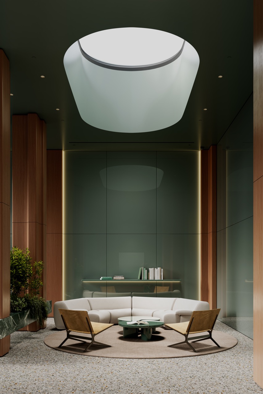 Стены выполнены из тонированного стекла, создающего легкий, проницаемый контур и связывающего зоны в единый объем. Световой фонарь в кровле направляет дневной свет вглубь пространства, выравнивая восприятие лаунж-зон. В конструктив интегрирована мягкая контурная подсветка, подчеркивающая пластику и материалы.