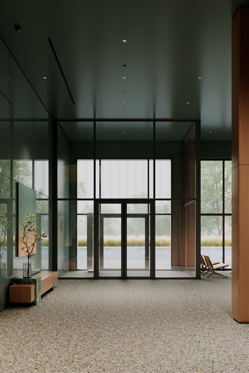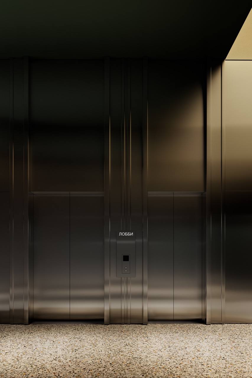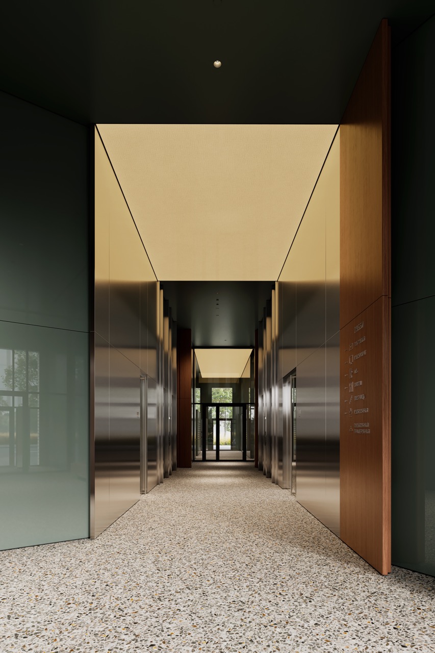 Комплекс расположен среди парков и зеленых территорий, что отражено в интерьере через природную палитру и материалы. Лобби решено в приглушенных зеленых тонах, формирующих ощущение равновесия и собранности.