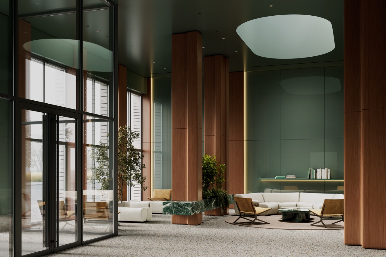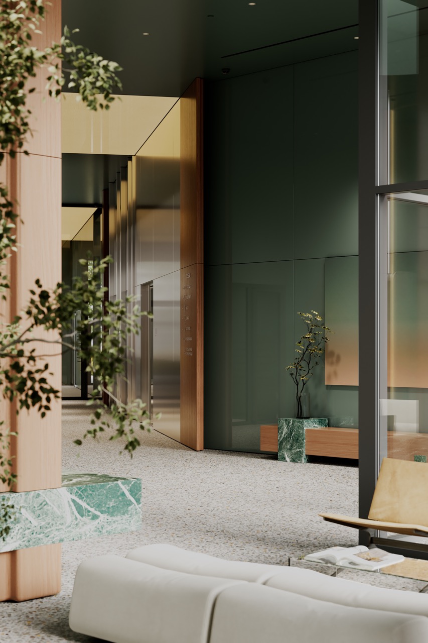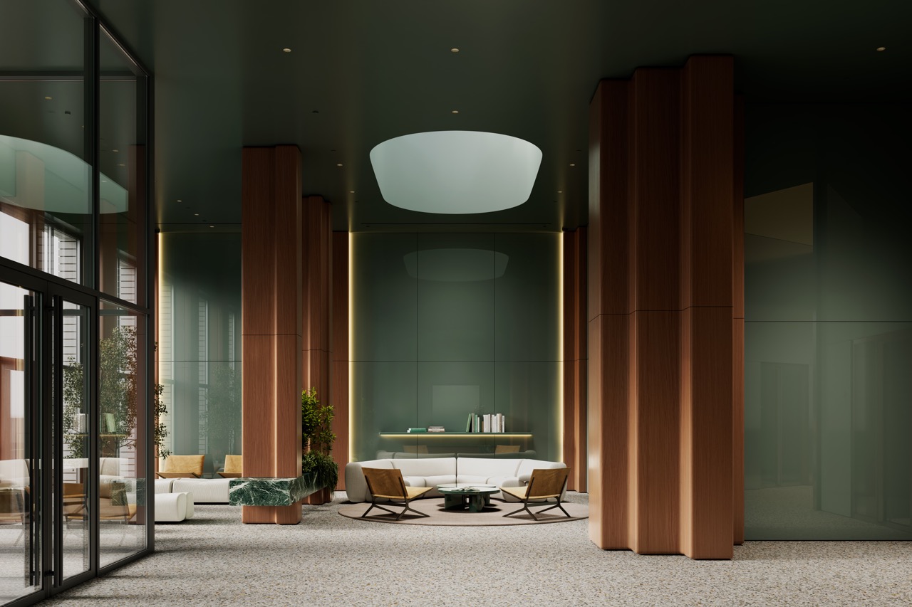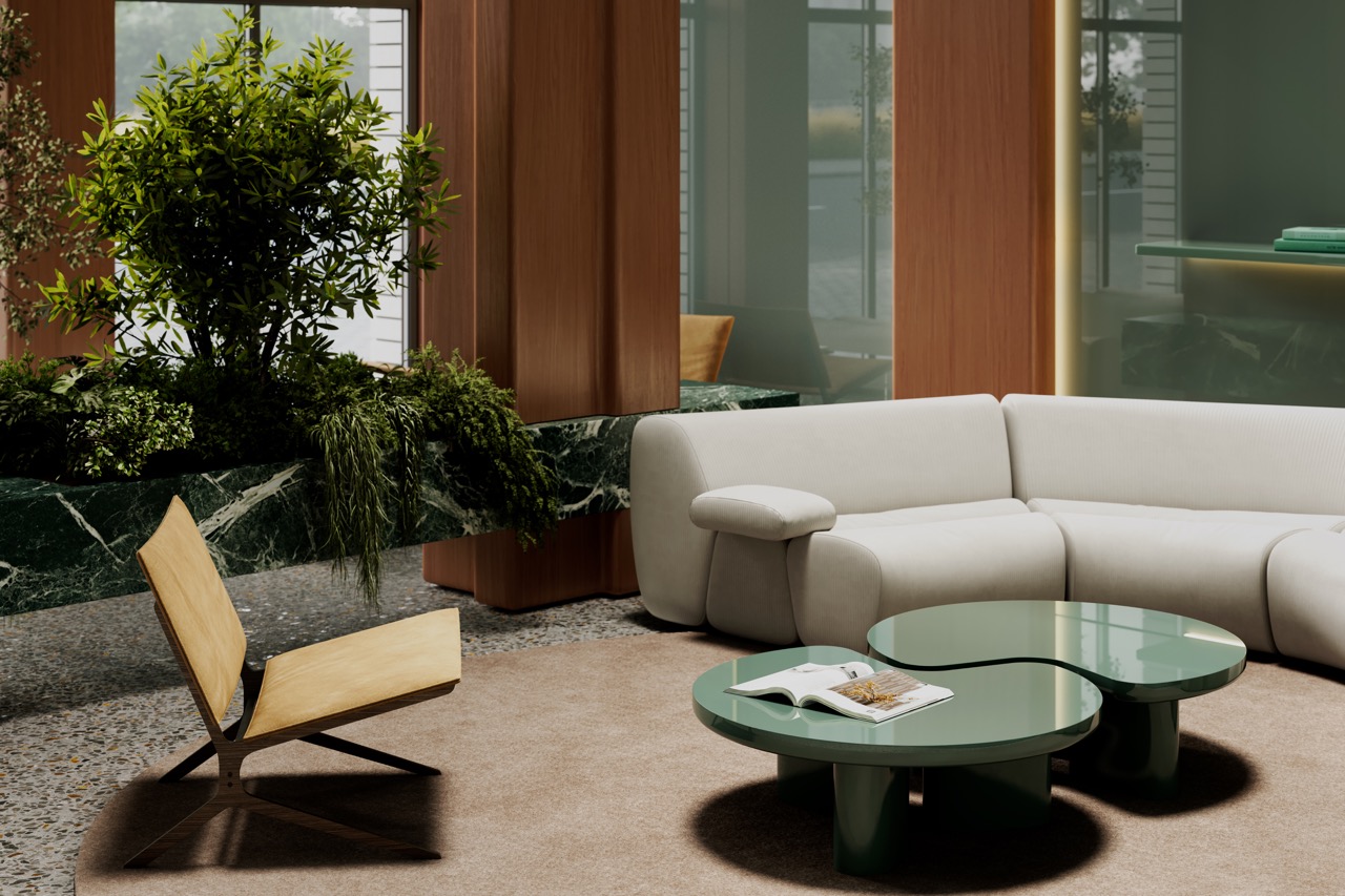 Комплекс расположен среди парков и зеленых территорий, что отражено в интерьере через природную палитру и материалы. Лобби решено в приглушенных зеленых тонах, формирующих ощущение равновесия и собранности.